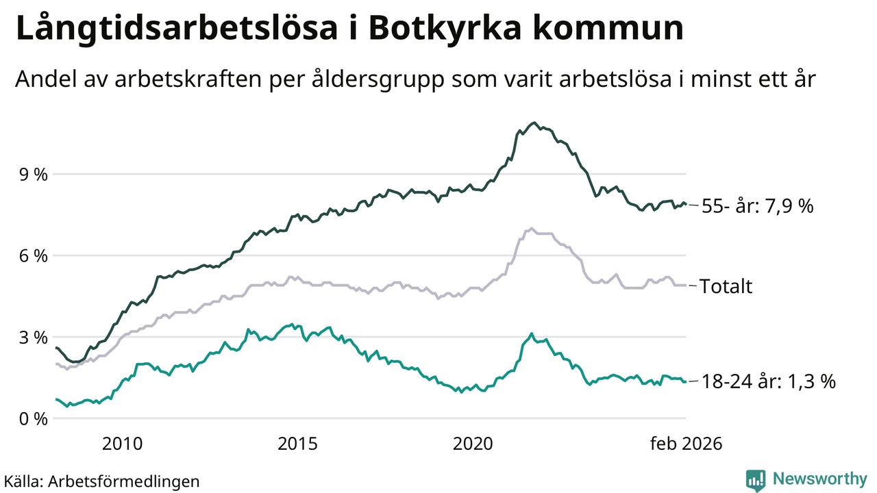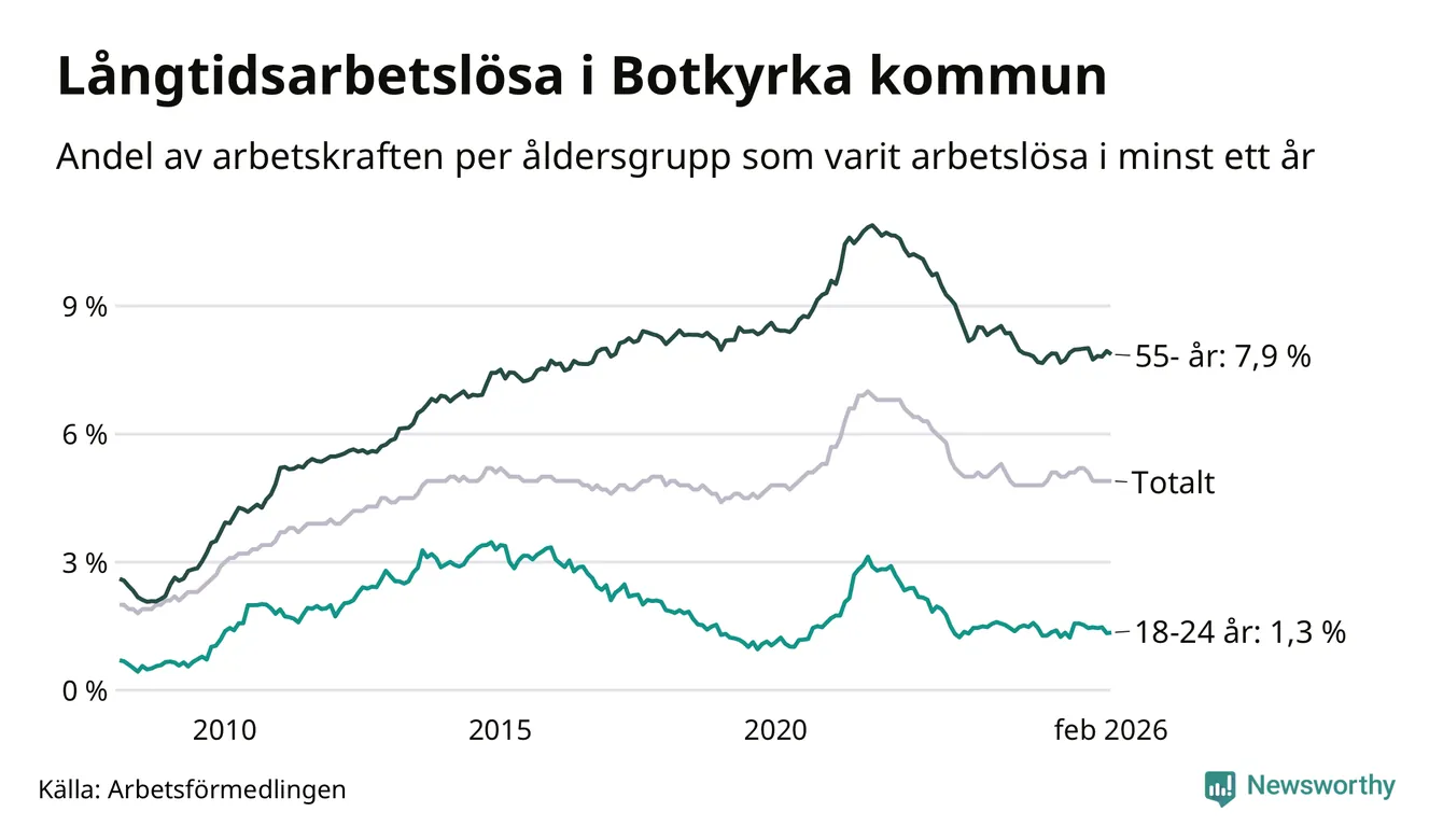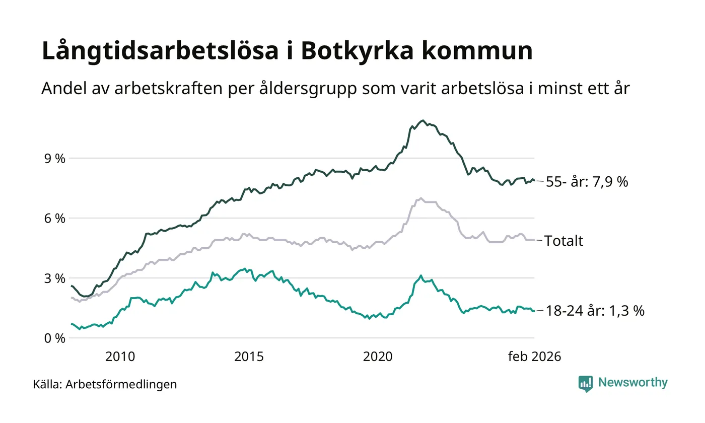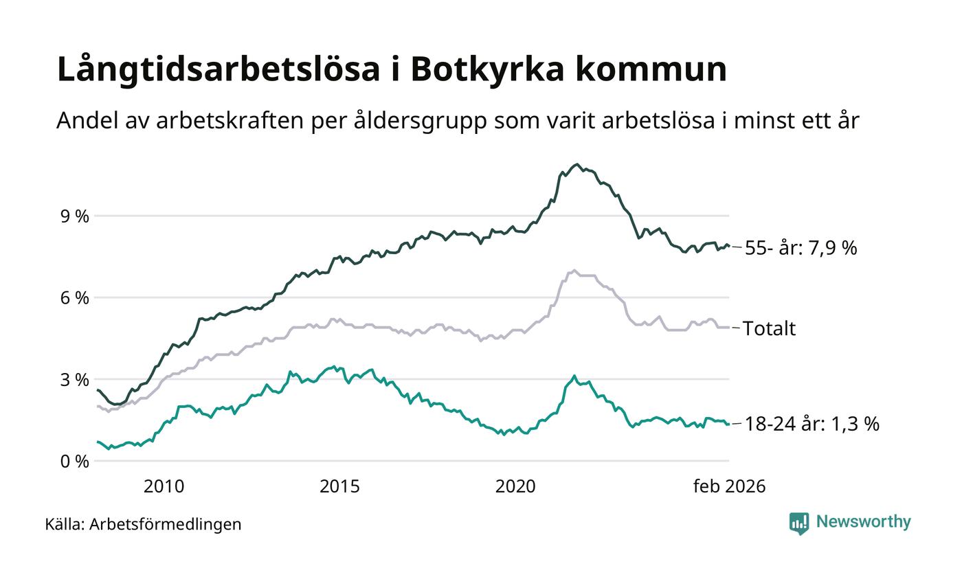 Av de 2 398 personerna som varit arbetslösa i mer än ett år i Botkyrka kommun är 748 personer mellan 55 och 661 år och 70 är mellan 18 och 24 år. För den äldre gruppen är andelen arbetslösa 7,9 procent medan den i den yngre gruppen är 1,3 procent. Även i riket som helhet är långtidsarbetslösheten högre i gruppen äldre.