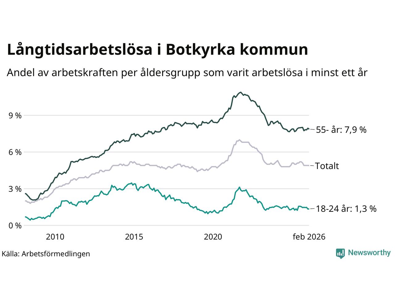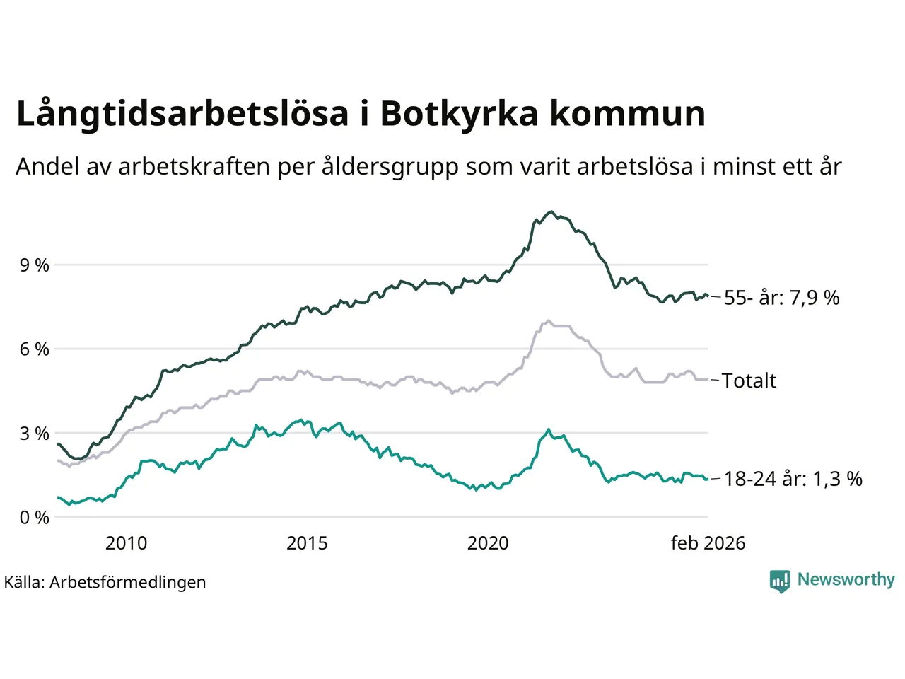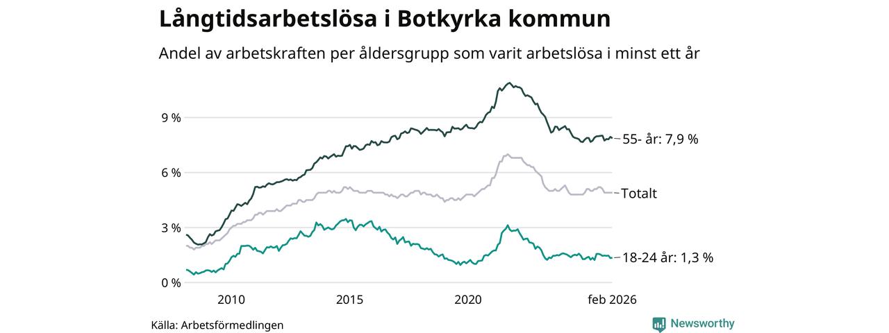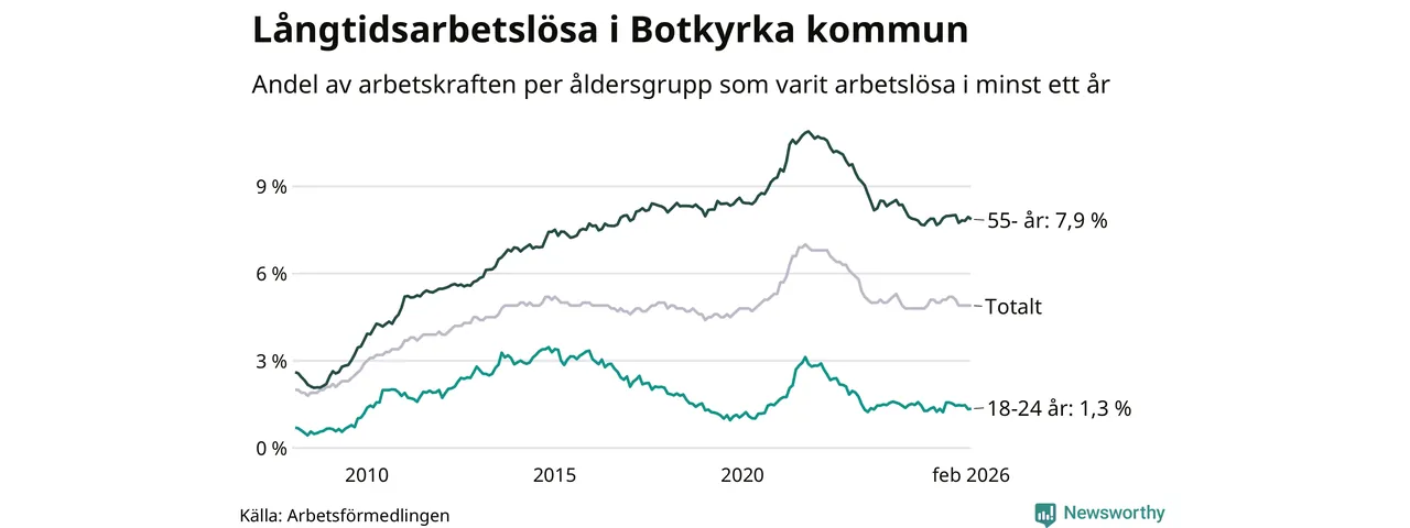 Av de 2 398 personerna som varit arbetslösa i mer än ett år i Botkyrka kommun är 748 personer mellan 55 och 661 år och 70 är mellan 18 och 24 år. För den äldre gruppen är andelen arbetslösa 7,9 procent medan den i den yngre gruppen är 1,3 procent. Även i riket som helhet är långtidsarbetslösheten högre i gruppen äldre.