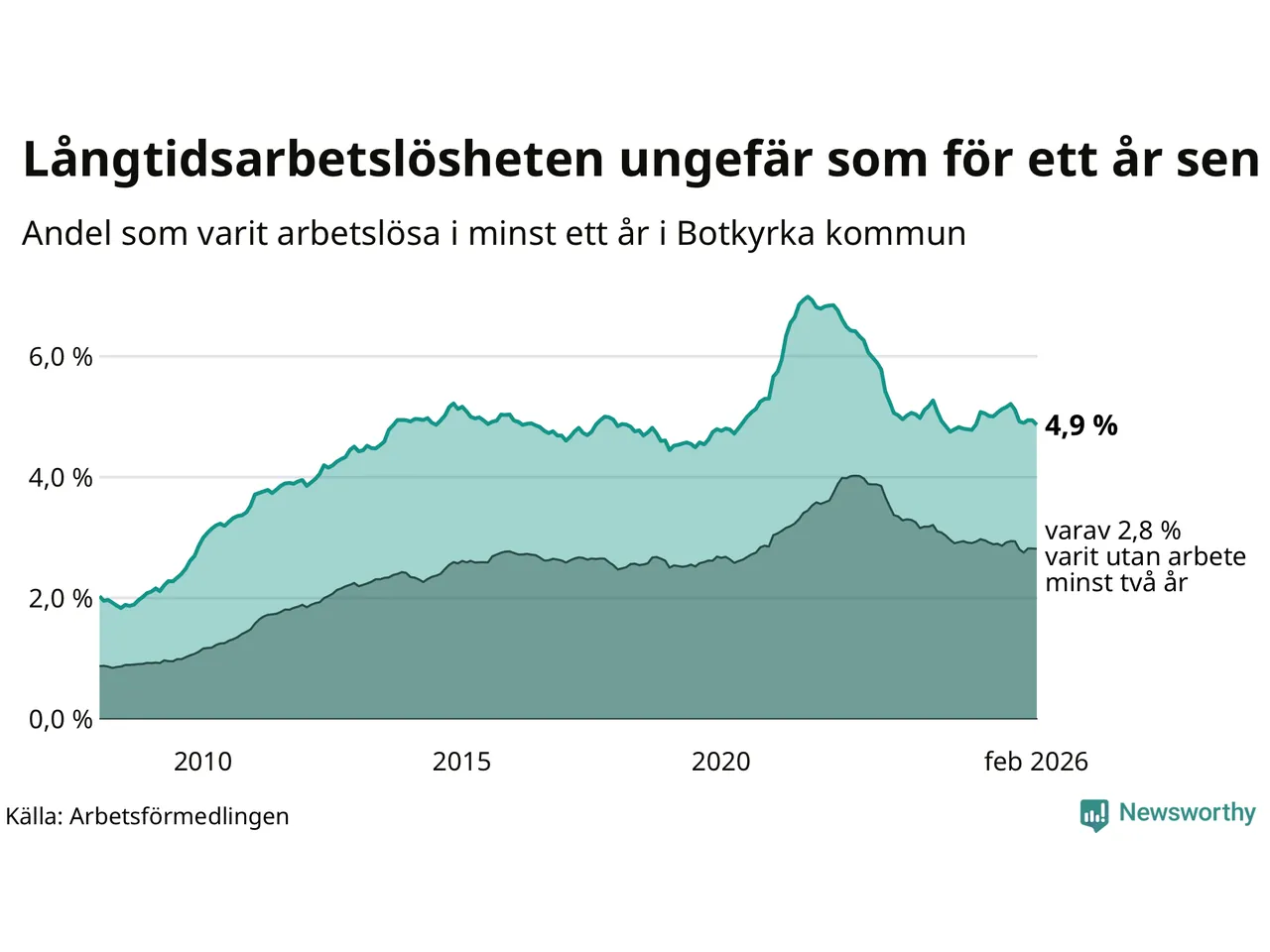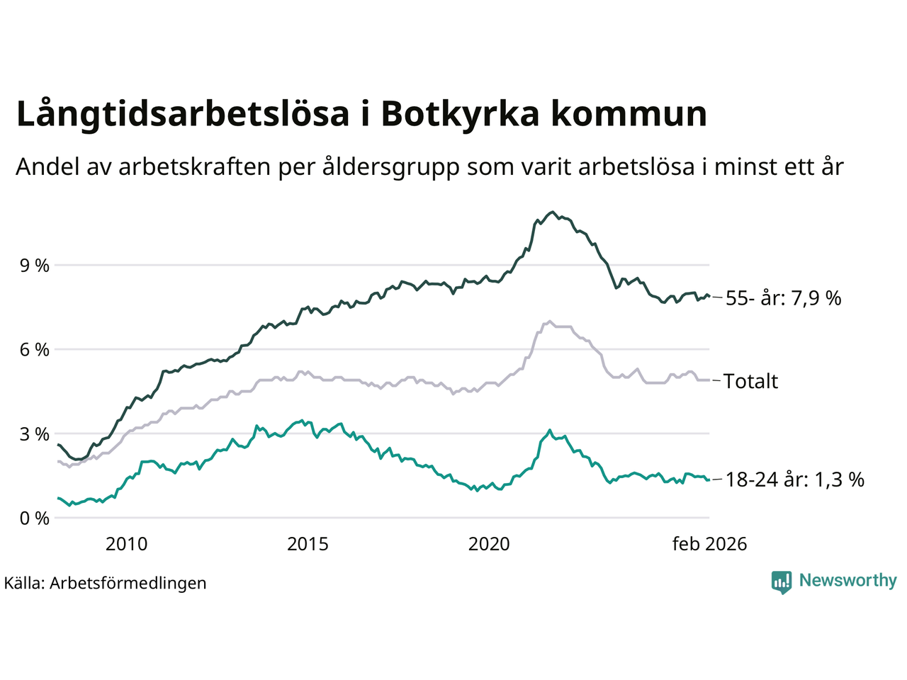 | Andel arbetslösa i minst ett år | 4,9 % | 2,9 % | 2,9 % |