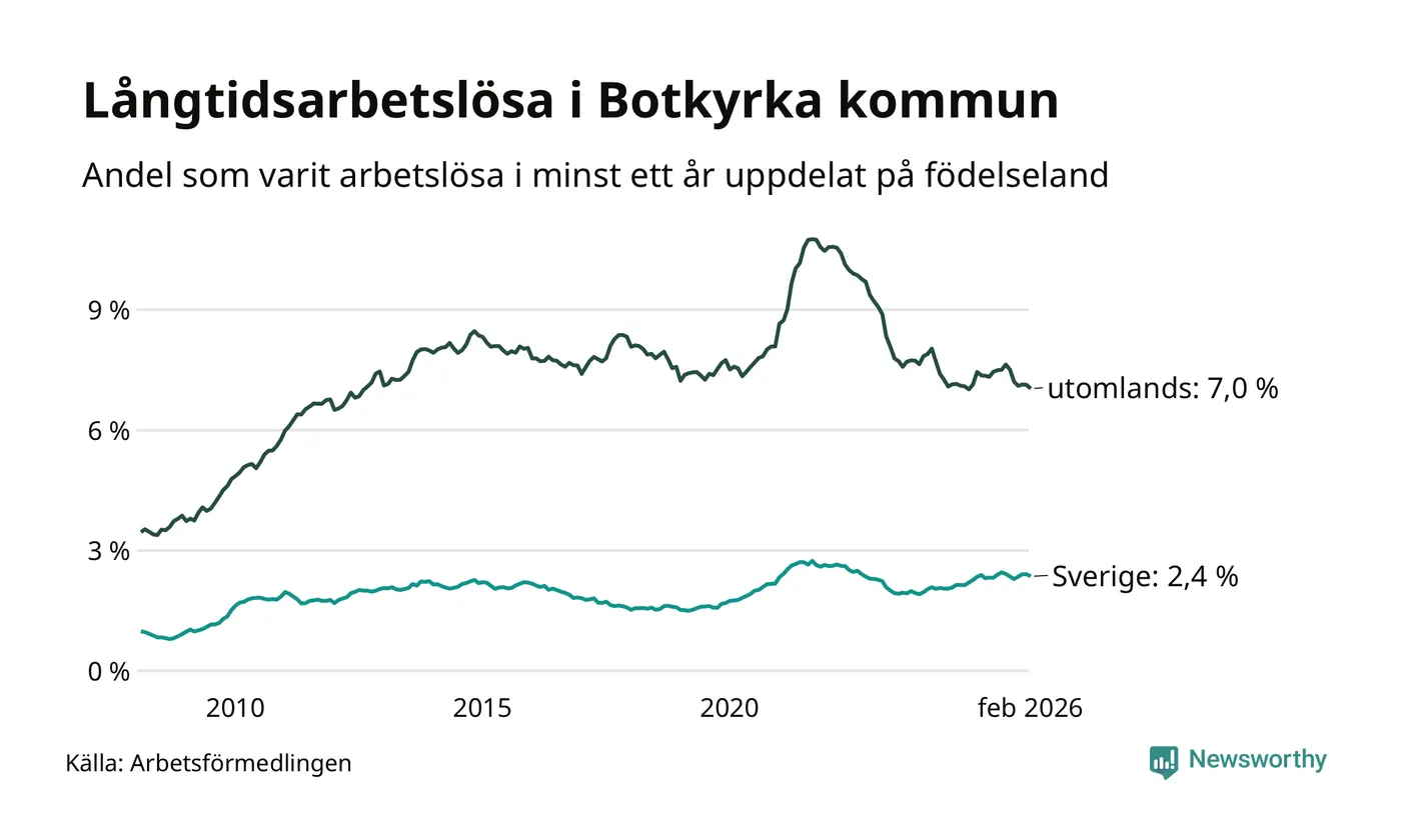 539 av de långtidsarbetslösa i Botkyrka är födda i Sverige, medan 1 859 är födda utomlands. Det innebär att långtidsarbetslösheten bland Sverigefödda är 2,4 procent, medan den är tre gånger så hög – 7,0 procent – bland födda utomlands. Även i riket som helhet är arbetslösheten högre bland utrikesfödda.