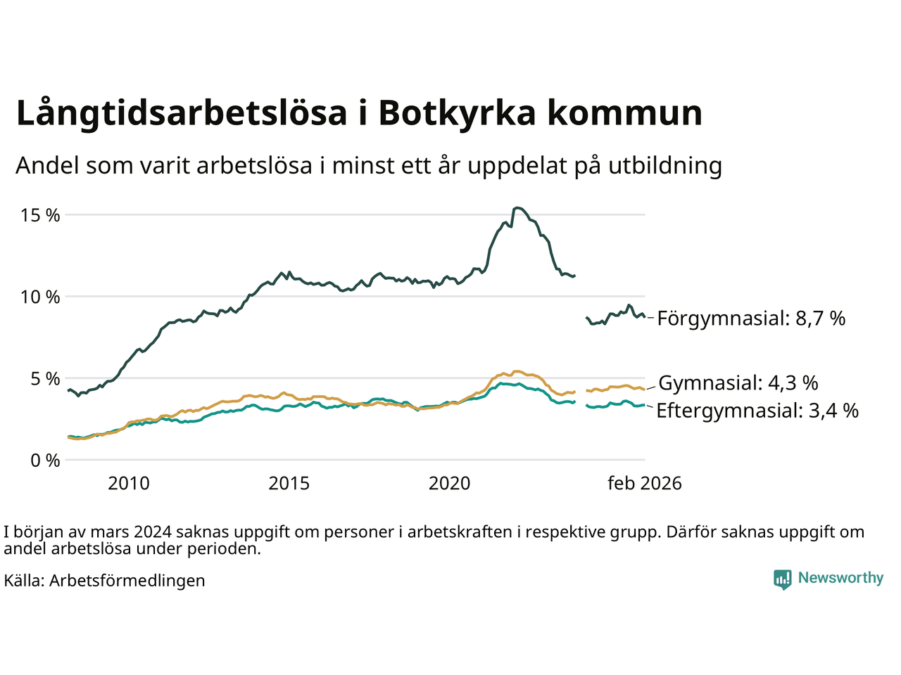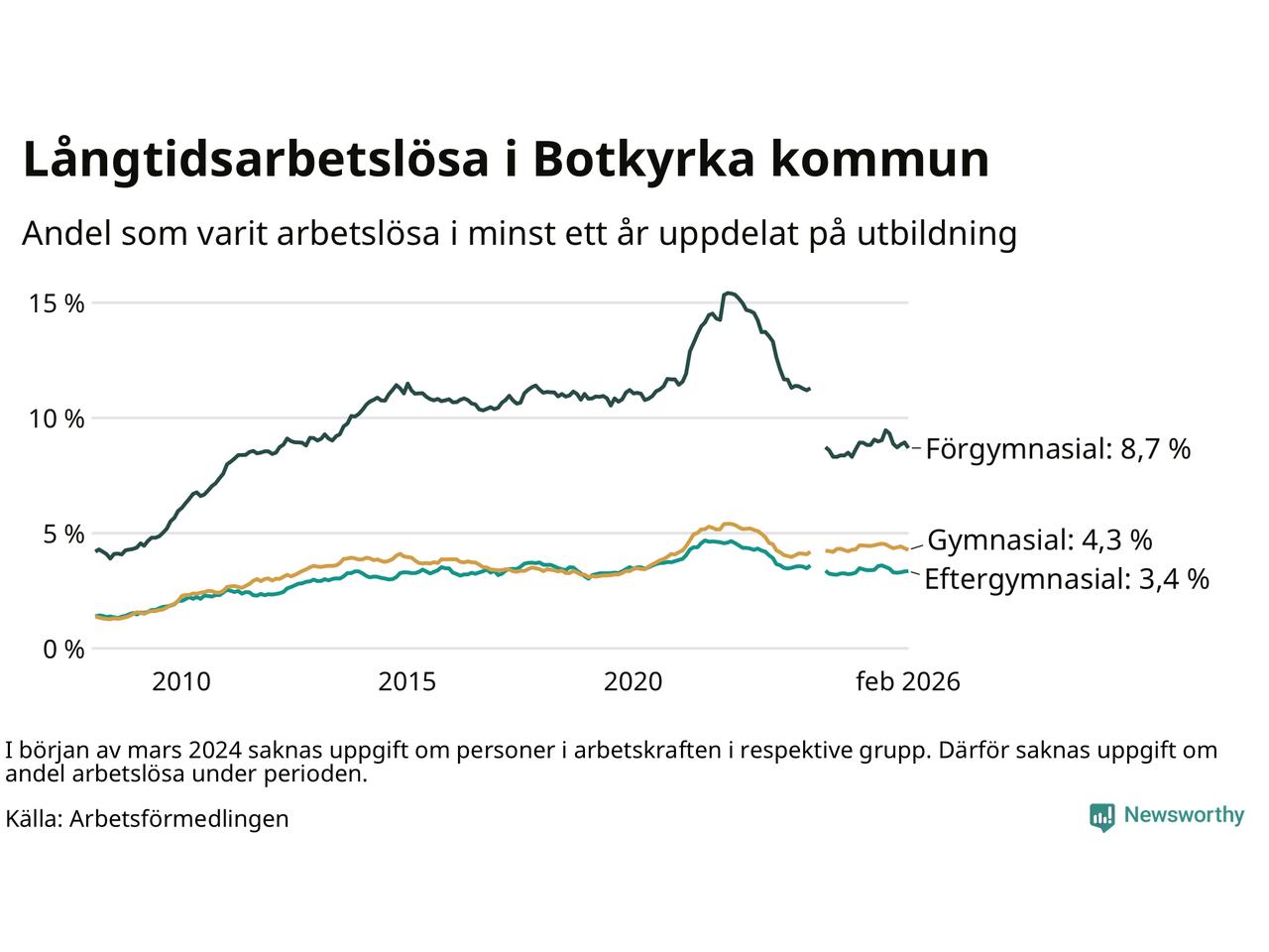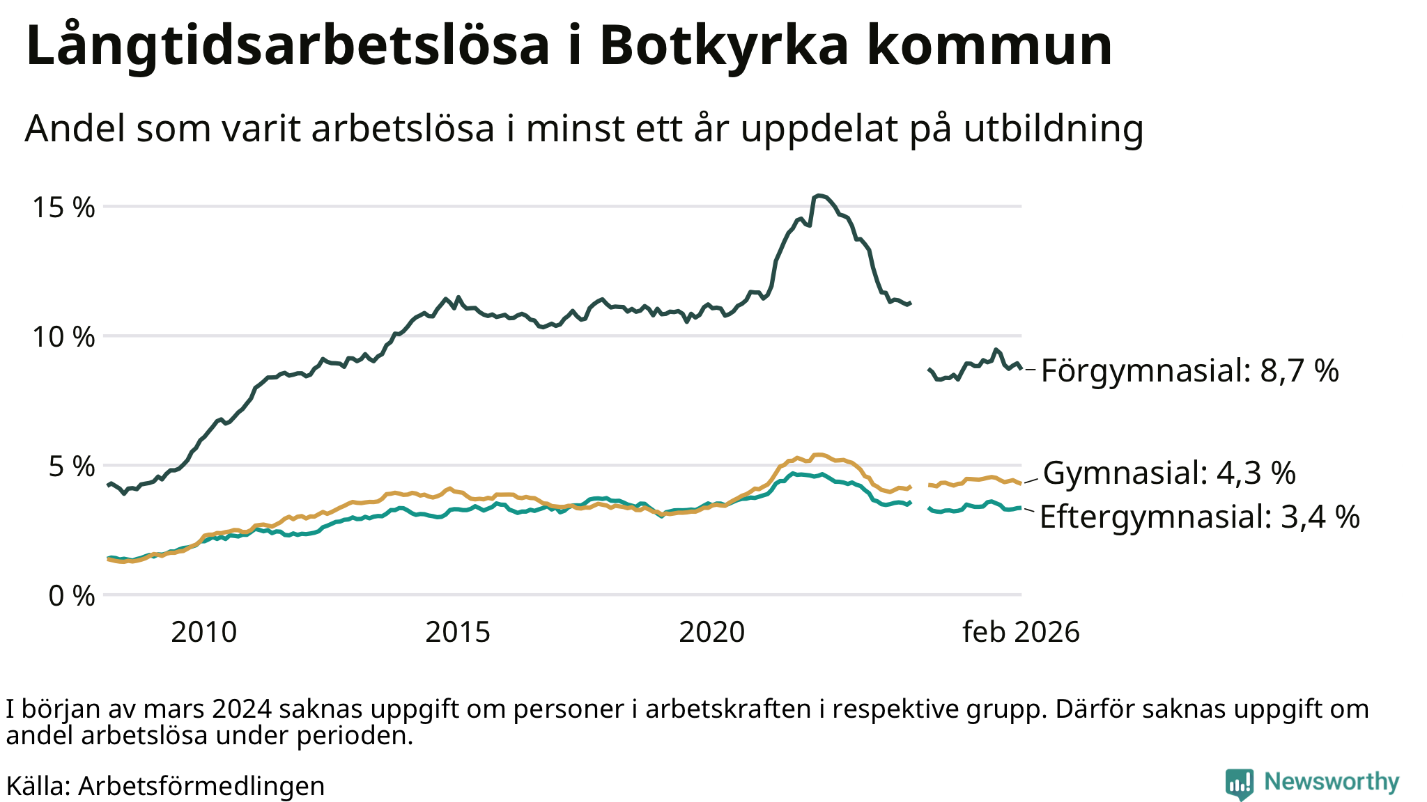 Totalt i riket hade omkring 153 000 personer varit utan arbete i minst ett år i februari. Det motsvarar 2,9 procent av arbetskraften, vilket är ungefär lika stor andel som för ett år sedan.