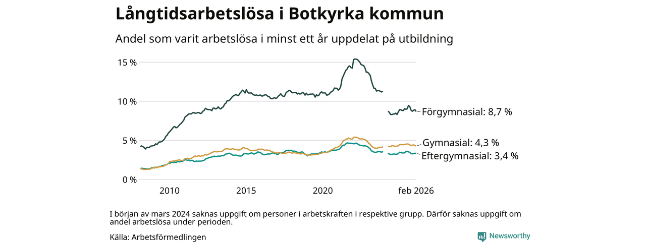 Andelen som varit utan arbete i minst ett år i Botkyrka var ungefär lika stor i februari jämfört med samma månad för ett år sedan. Det visar Arbetsfömedlingens senaste månadsstatistik.