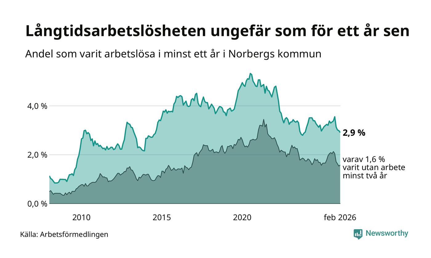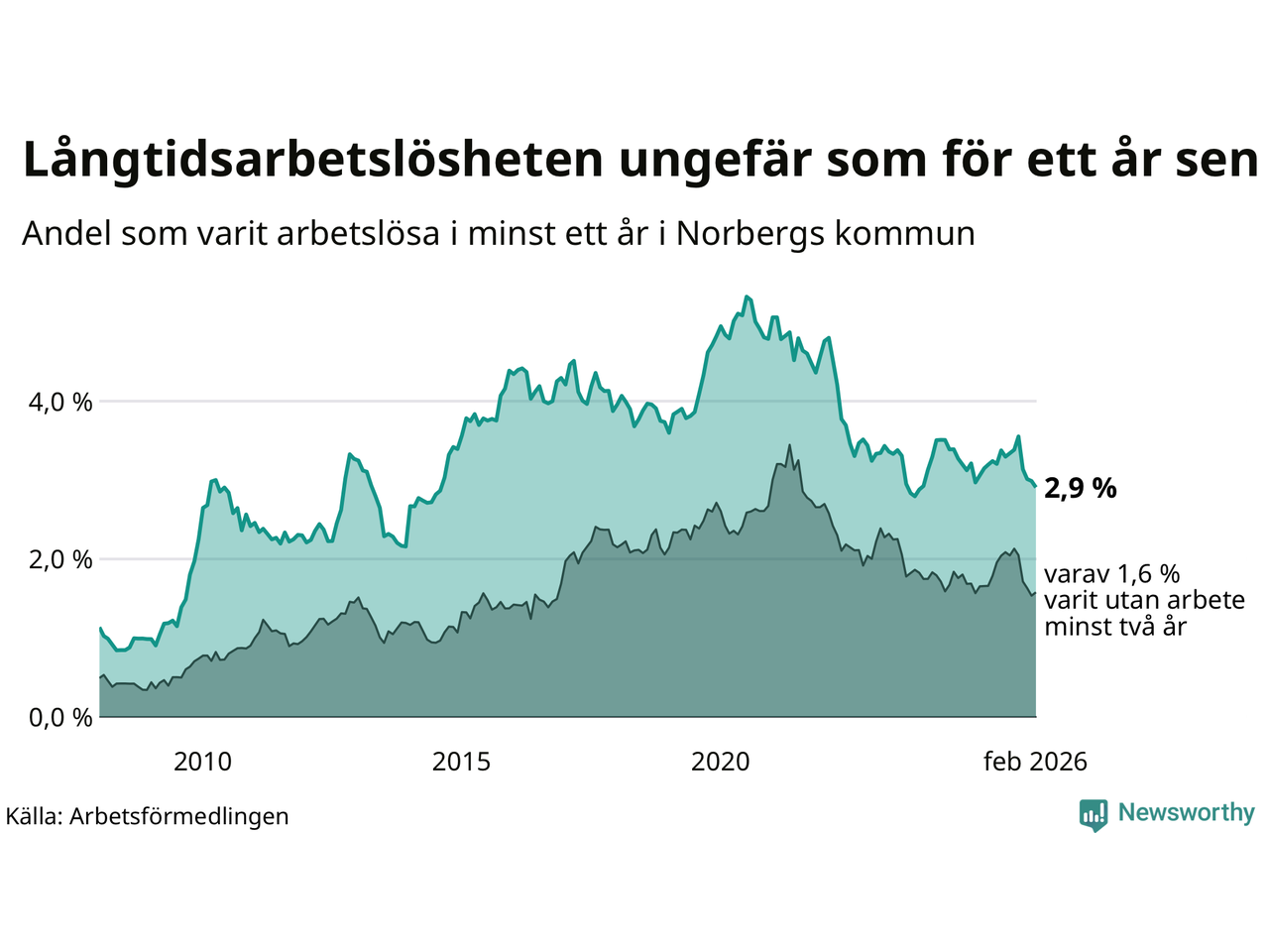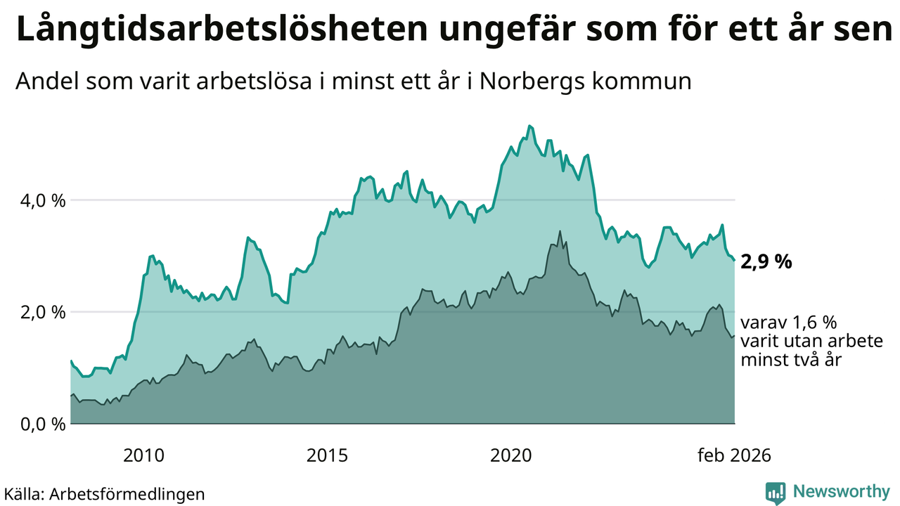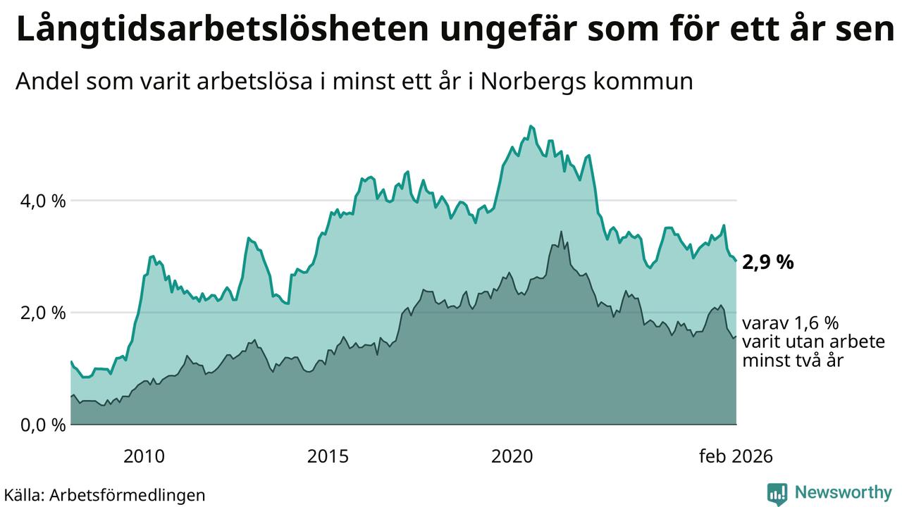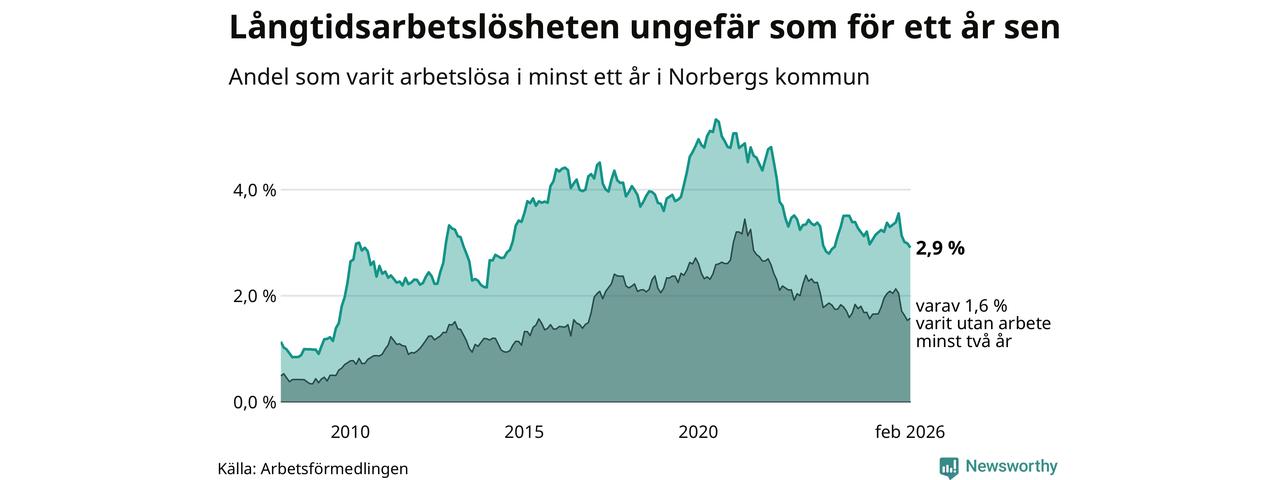 I februari hade 70 Norbergsbor varit arbetslösa i minst ett år, vilket är två färre än månaden innan. Det är den fjärde månaden i rad med minskande antal långtidsarbetslösa. 70 personer motsvarar 2,9 procent av arbetskraften i kommunen – andelen långtidsarbetslösa är ungefär på samma nivå som för ett år sedan.