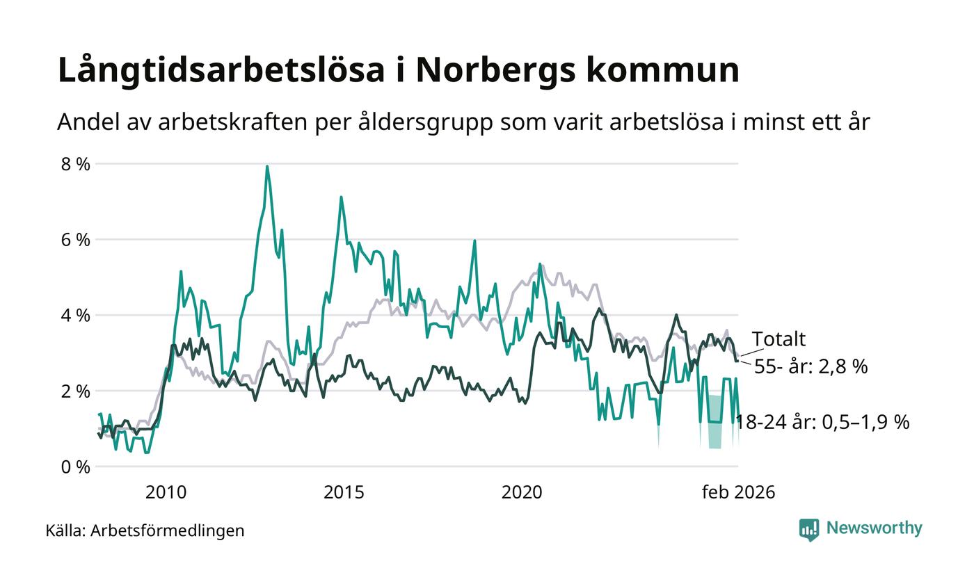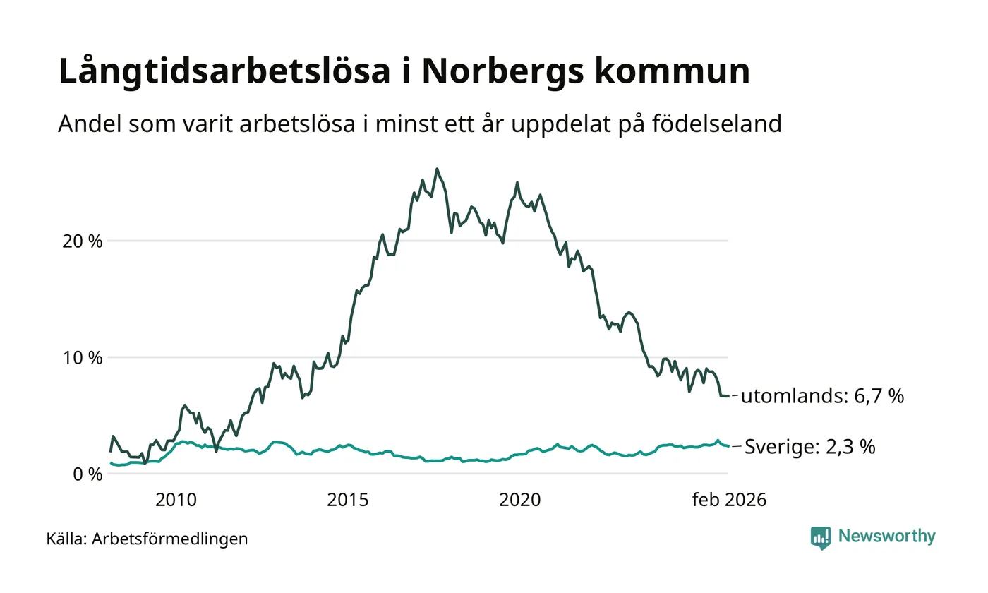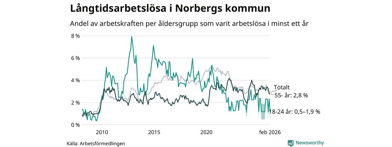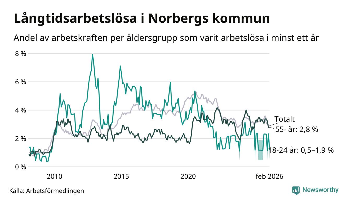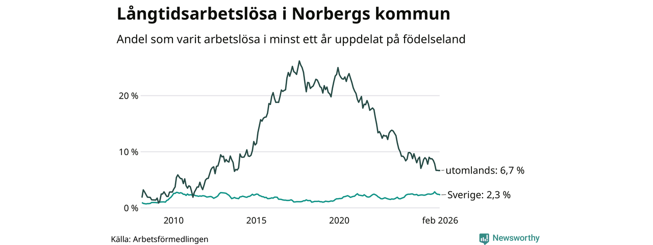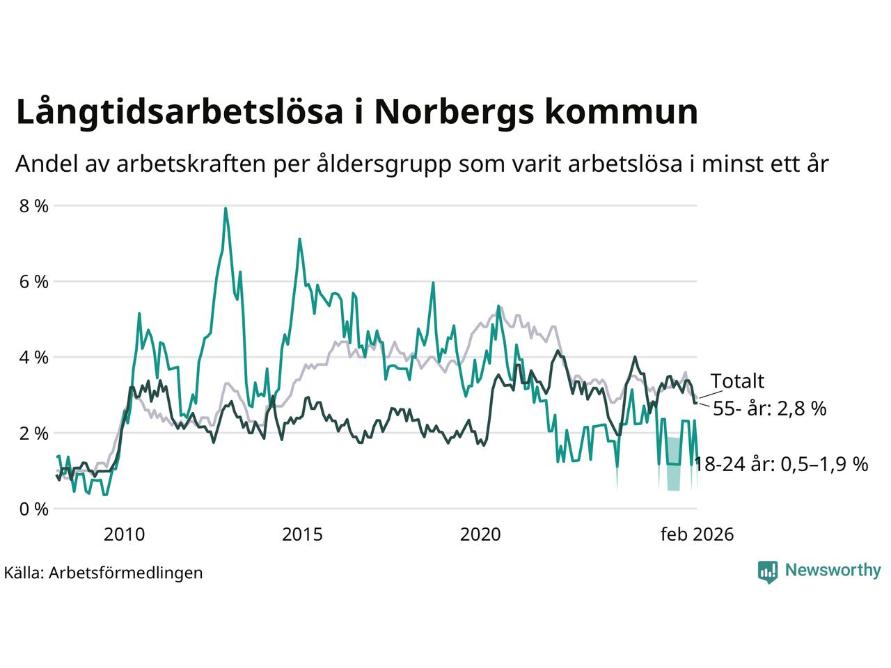 I februari hade 70 Norbergsbor varit arbetslösa i minst ett år, vilket är två färre än månaden innan. Det är den fjärde månaden i rad med minskande antal långtidsarbetslösa. 70 personer motsvarar 2,9 procent av arbetskraften i kommunen – andelen långtidsarbetslösa är ungefär på samma nivå som för ett år sedan.