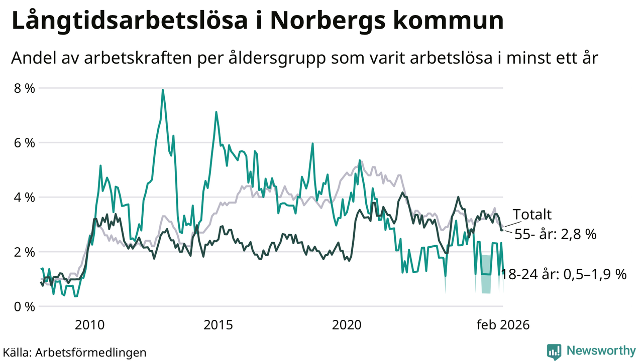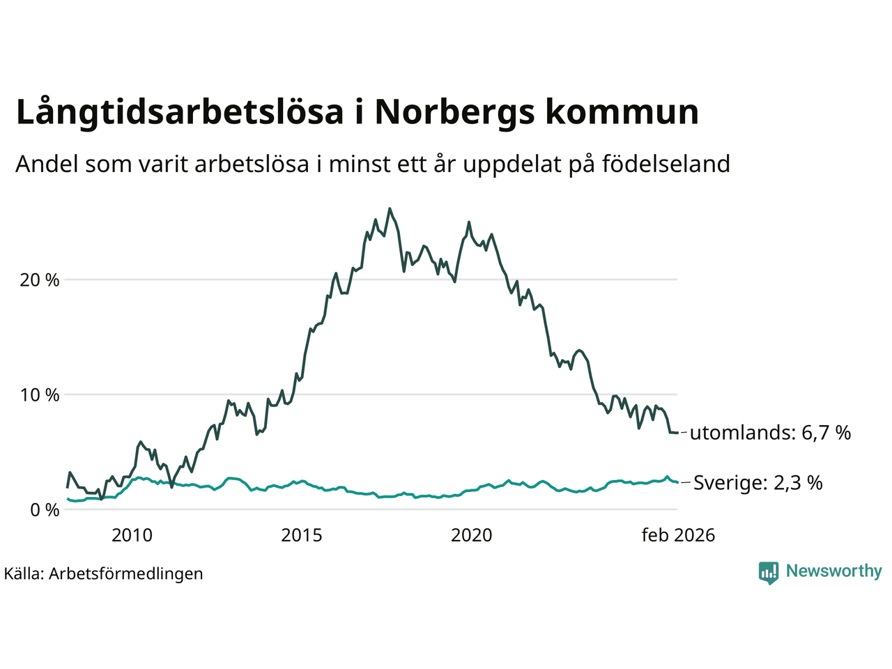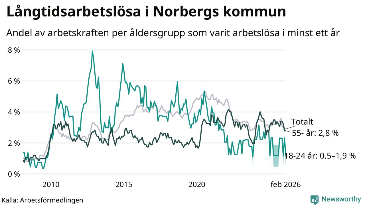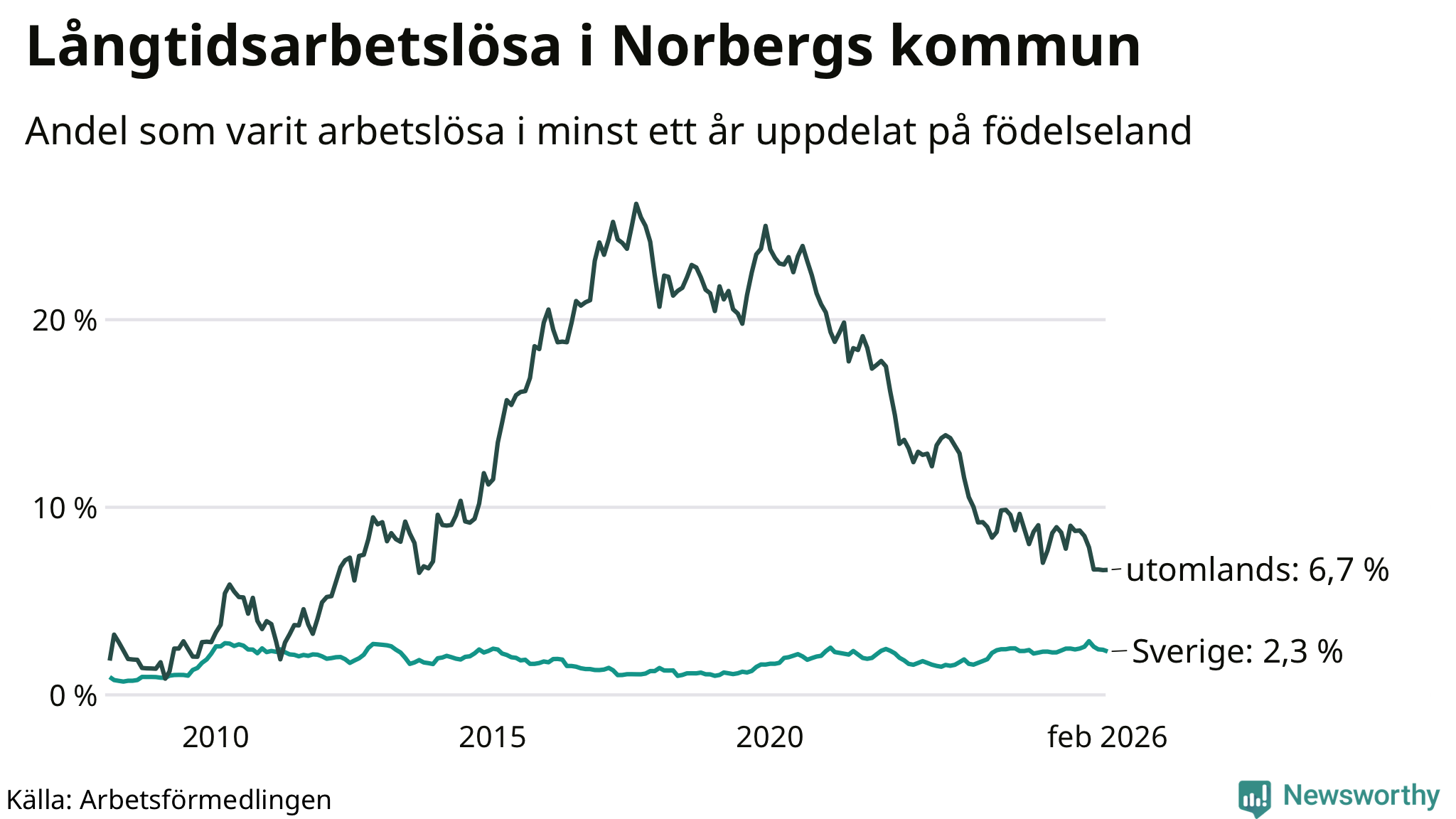 I februari hade 70 Norbergsbor varit arbetslösa i minst ett år, vilket är två färre än månaden innan. Det är den fjärde månaden i rad med minskande antal långtidsarbetslösa. 70 personer motsvarar 2,9 procent av arbetskraften i kommunen – andelen långtidsarbetslösa är ungefär på samma nivå som för ett år sedan.