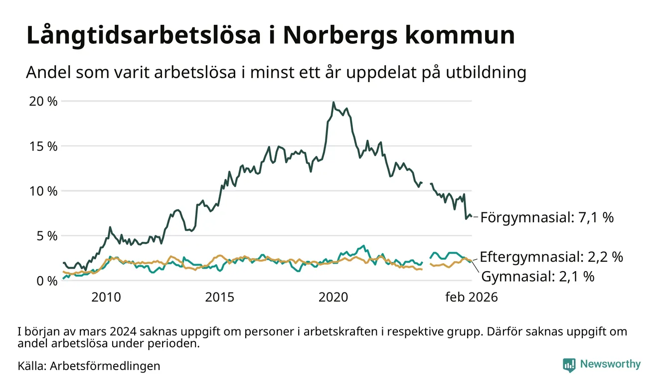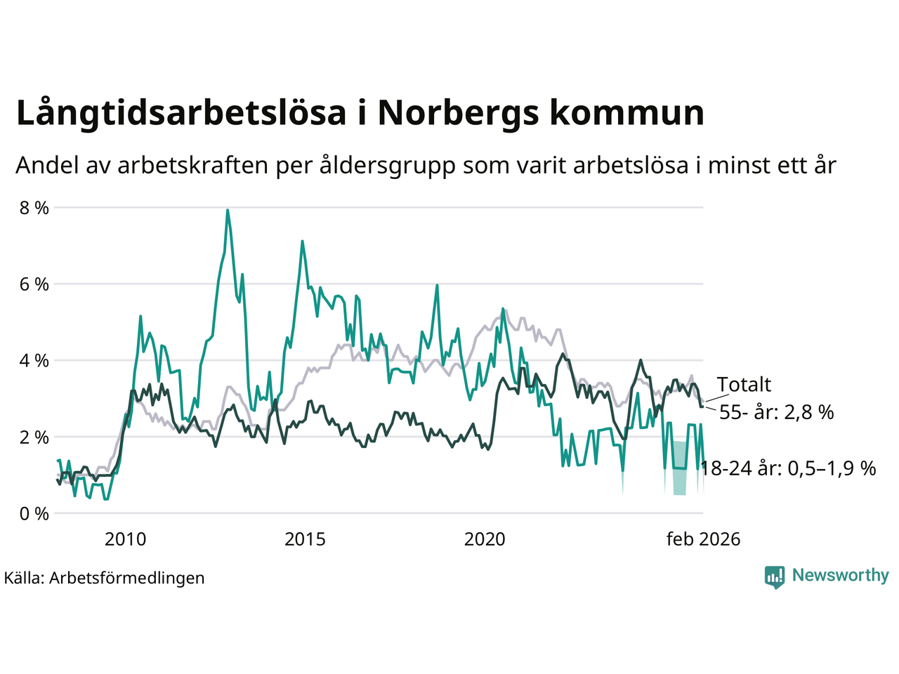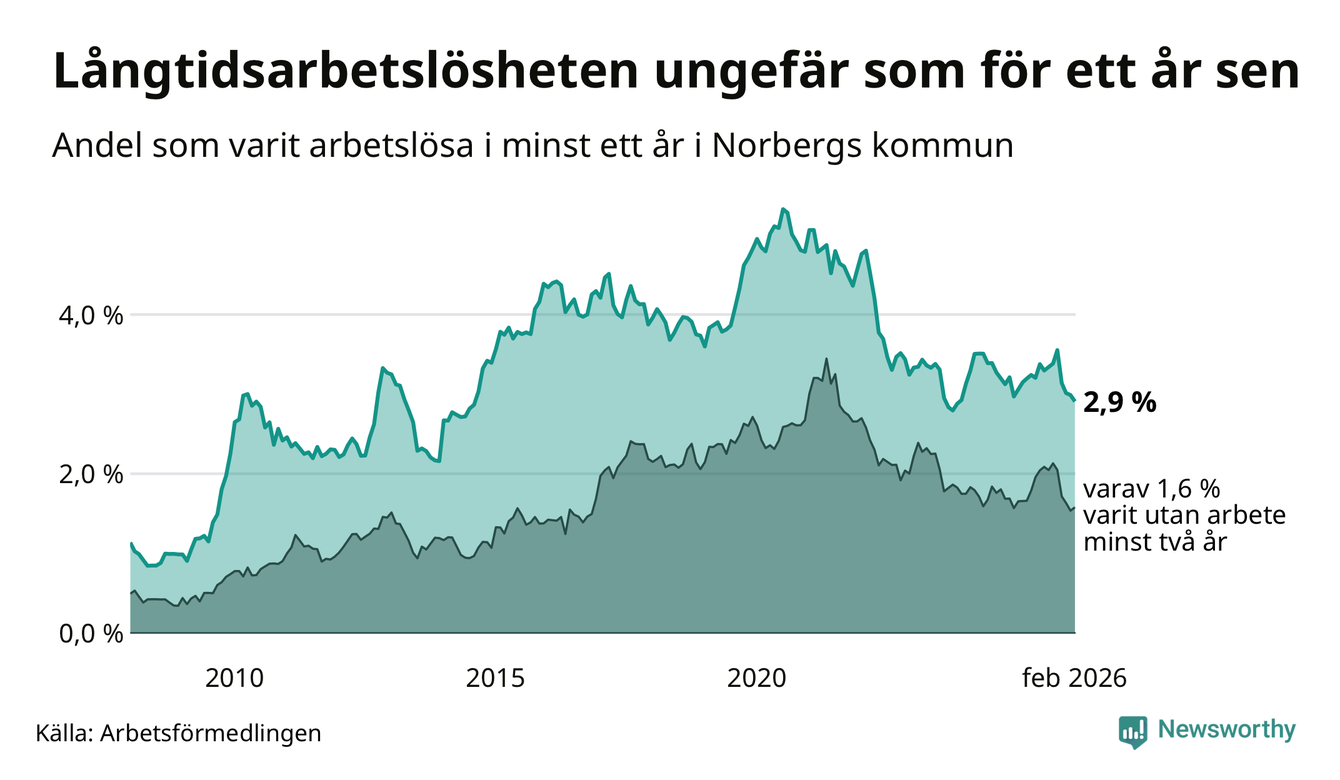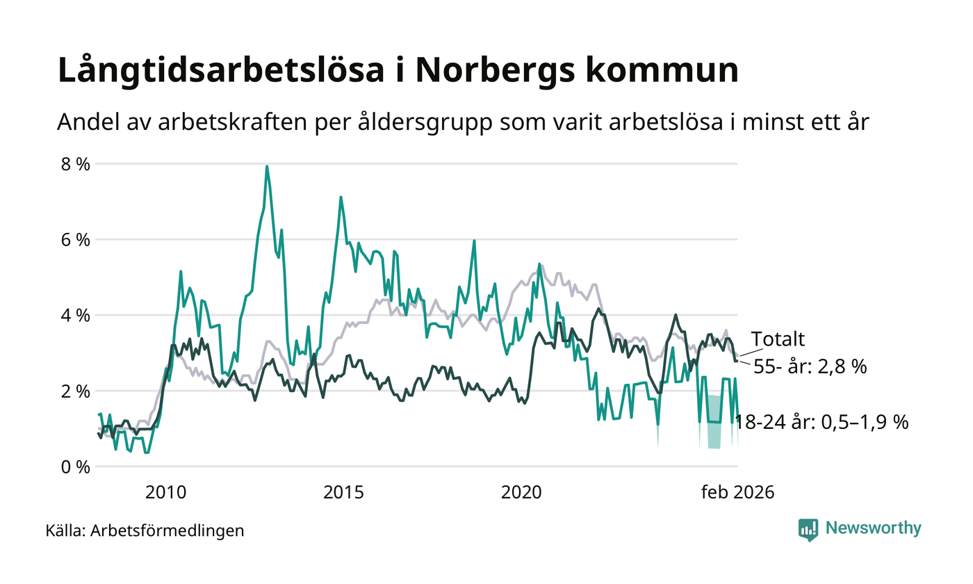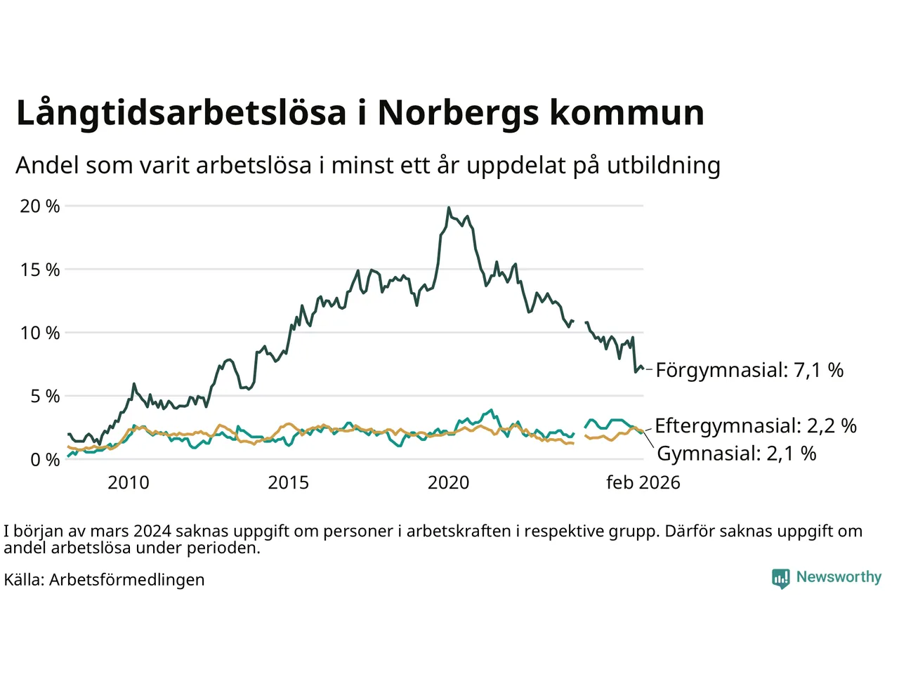 I februari hade 70 Norbergsbor varit arbetslösa i minst ett år, vilket är två färre än månaden innan. Det är den fjärde månaden i rad med minskande antal långtidsarbetslösa. 70 personer motsvarar 2,9 procent av arbetskraften i kommunen – andelen långtidsarbetslösa är ungefär på samma nivå som för ett år sedan.