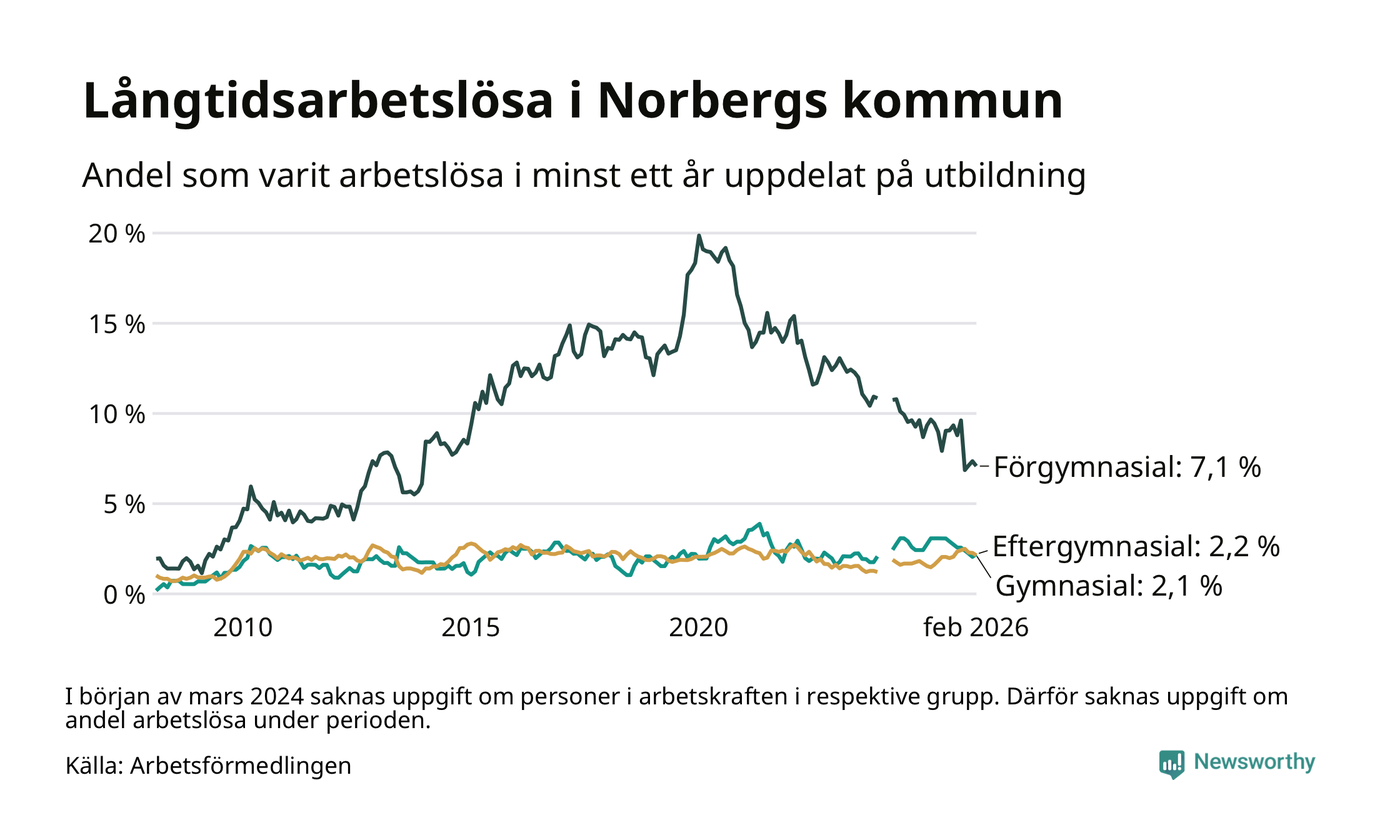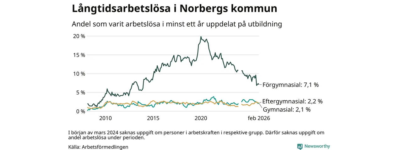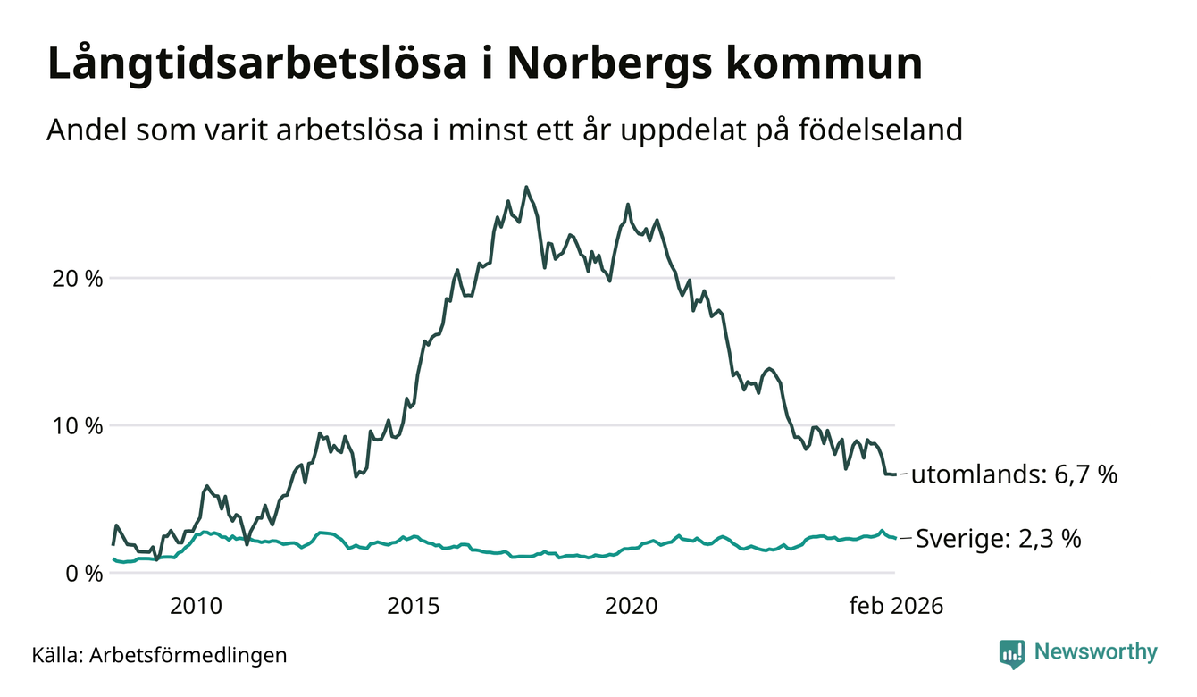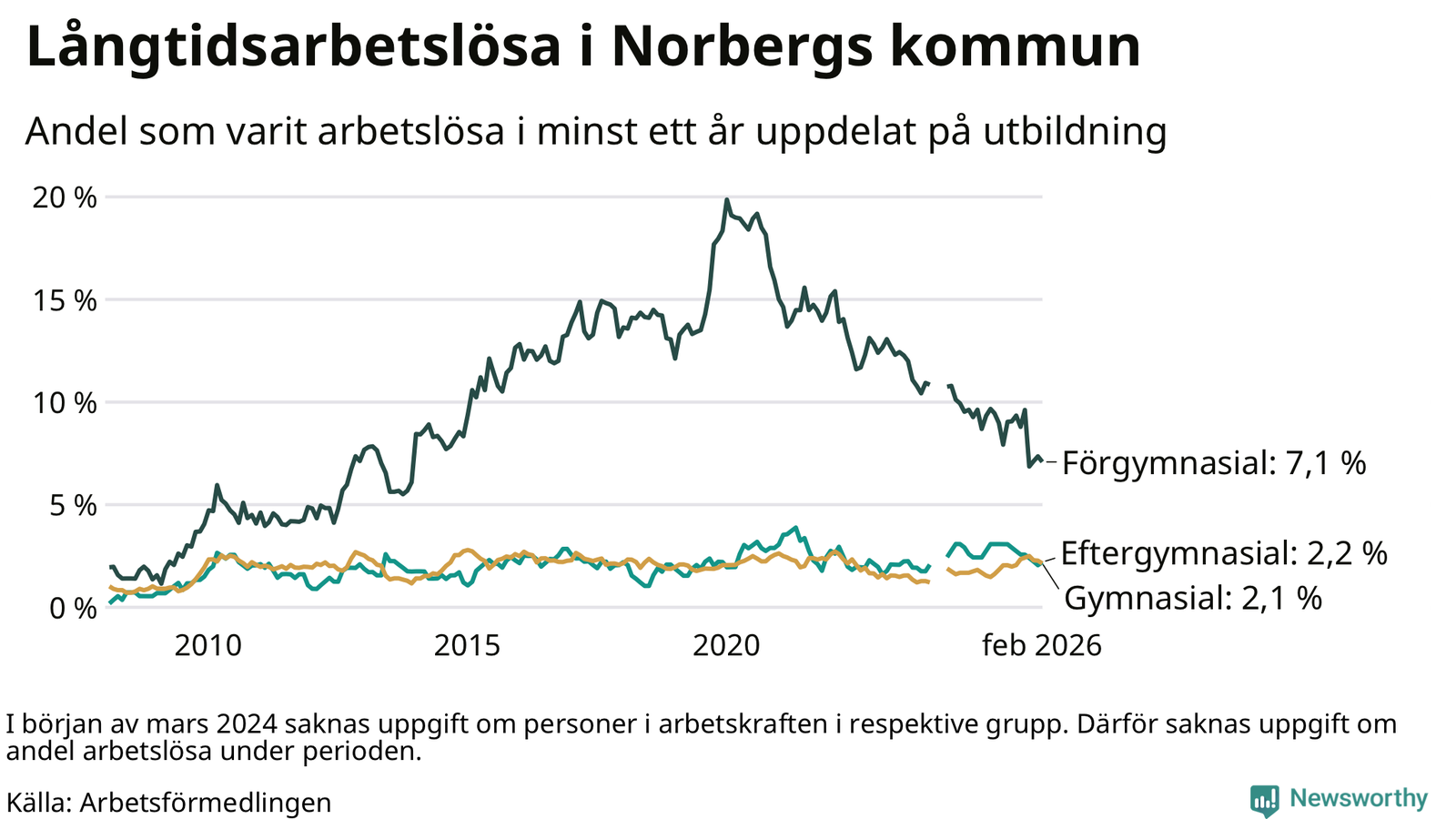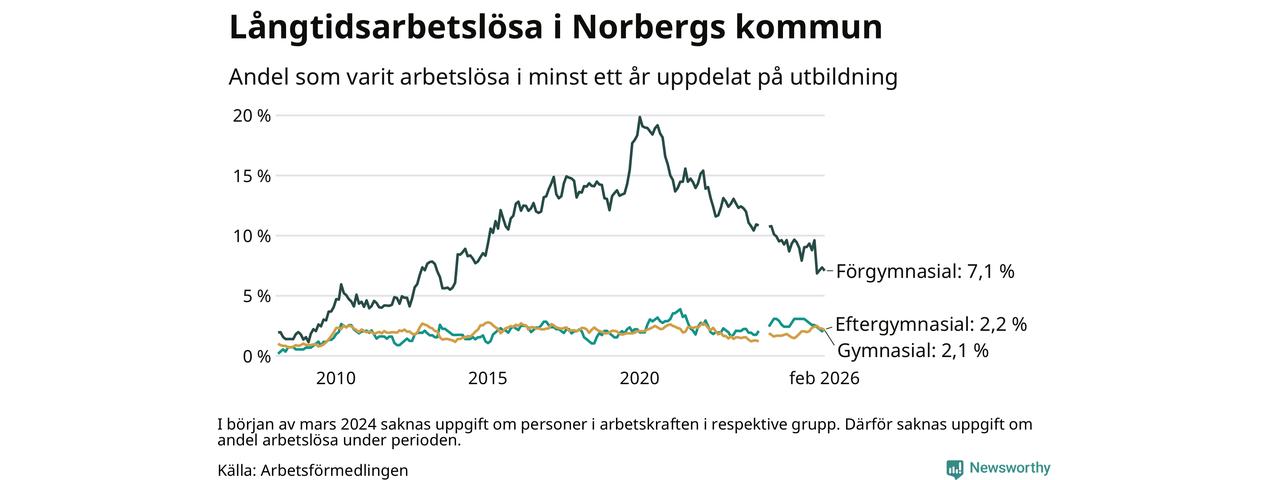I februari hade 70 Norbergsbor varit arbetslösa i minst ett år, vilket är två färre än månaden innan. Det är den fjärde månaden i rad med minskande antal långtidsarbetslösa. 70 personer motsvarar 2,9 procent av arbetskraften i kommunen – andelen långtidsarbetslösa är ungefär på samma nivå som för ett år sedan.
