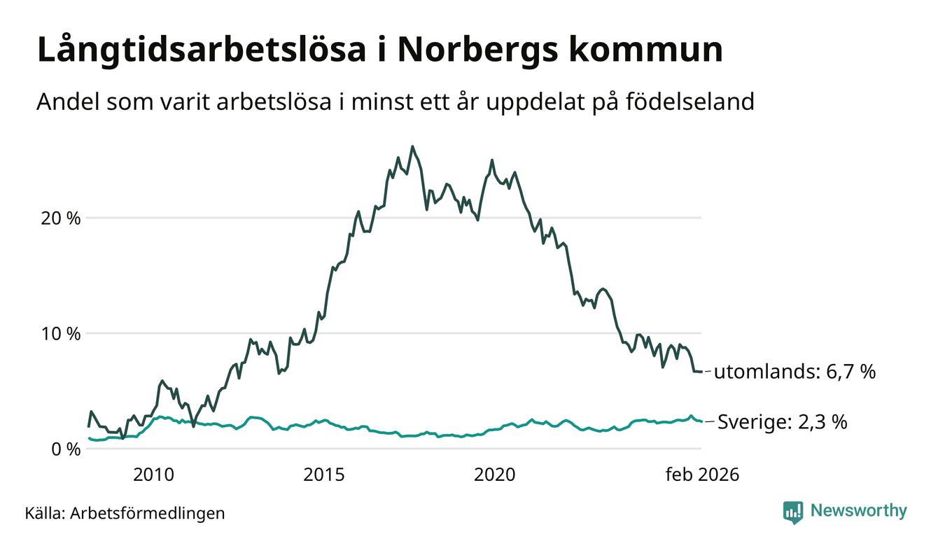 48 av de långtidsarbetslösa i Norberg är födda i Sverige, medan 22 är födda utomlands. Det innebär att långtidsarbetslösheten bland Sverigefödda är 2,3 procent, medan den är tre gånger så hög – 6,7 procent – bland födda utomlands. Även i riket som helhet är arbetslösheten högre bland utrikesfödda.
