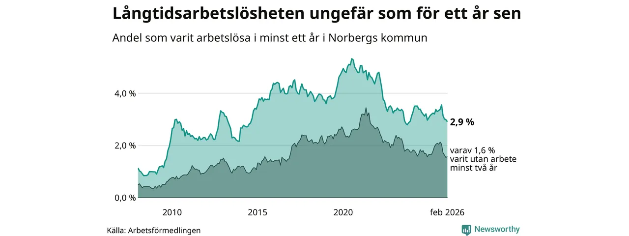 Andelen som varit utan arbete i minst ett år i Norberg var ungefär lika stor i februari jämfört med samma månad för ett år sedan. Det visar Arbetsfömedlingens senaste månadsstatistik.