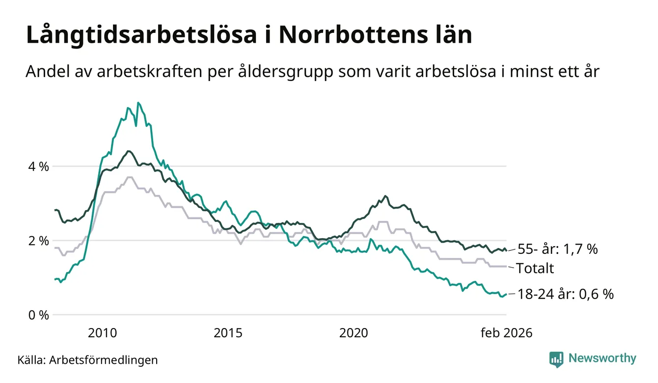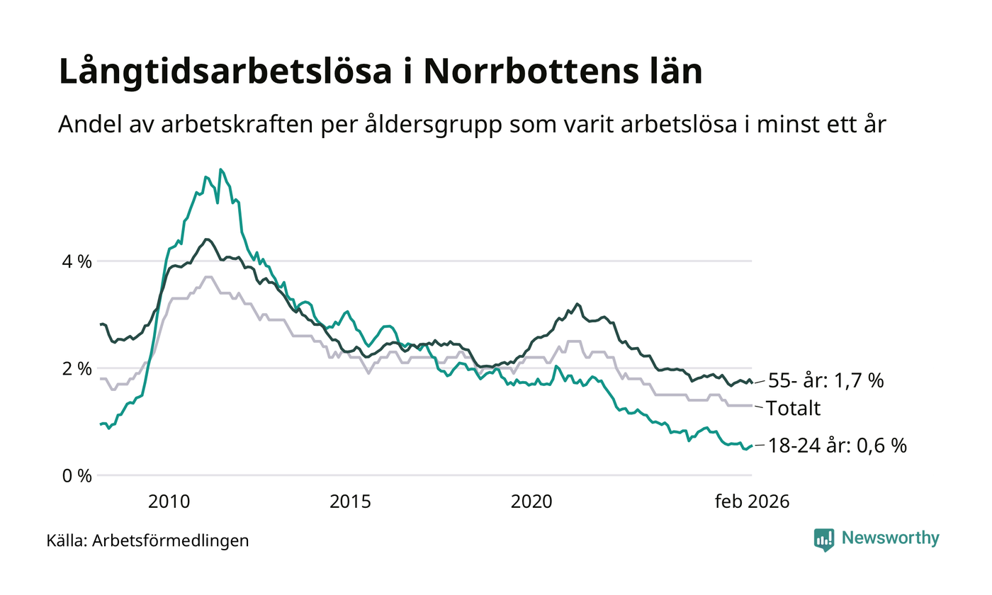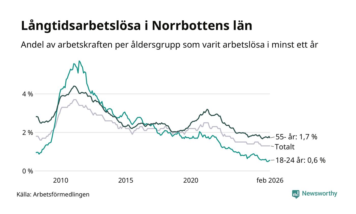 Av de 1 609 personerna som varit arbetslösa i mer än ett år i Norrbottens län är mellan 486 och 486 personer mellan 55 och 661 år och mellan 76 och 76 är mellan 18 och 24 år. För den äldre gruppen är andelen arbetslösa 1,7 procent medan den i den yngre gruppen är 0,6 procent. Även i riket som helhet är långtidsarbetslösheten högre i gruppen äldre.