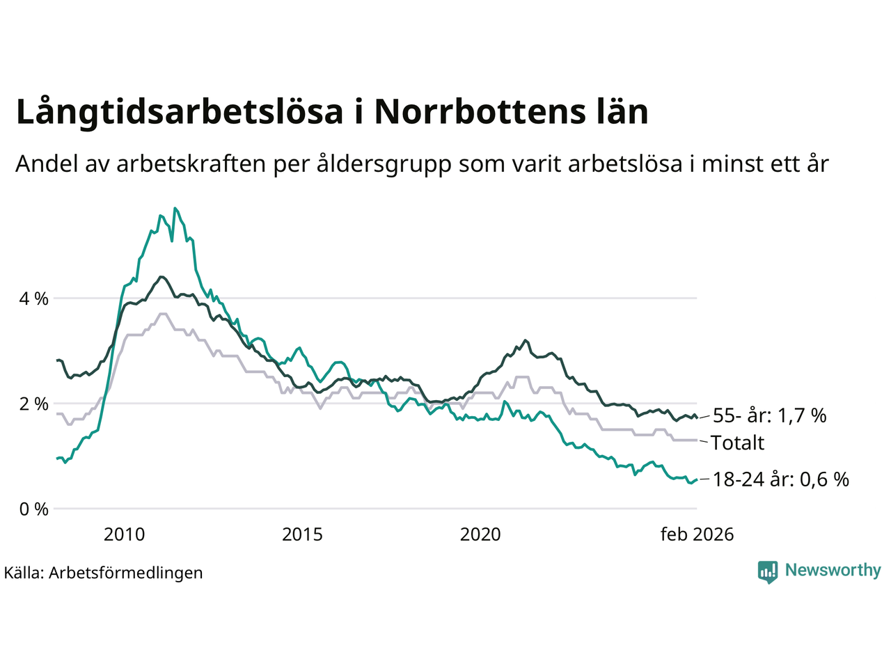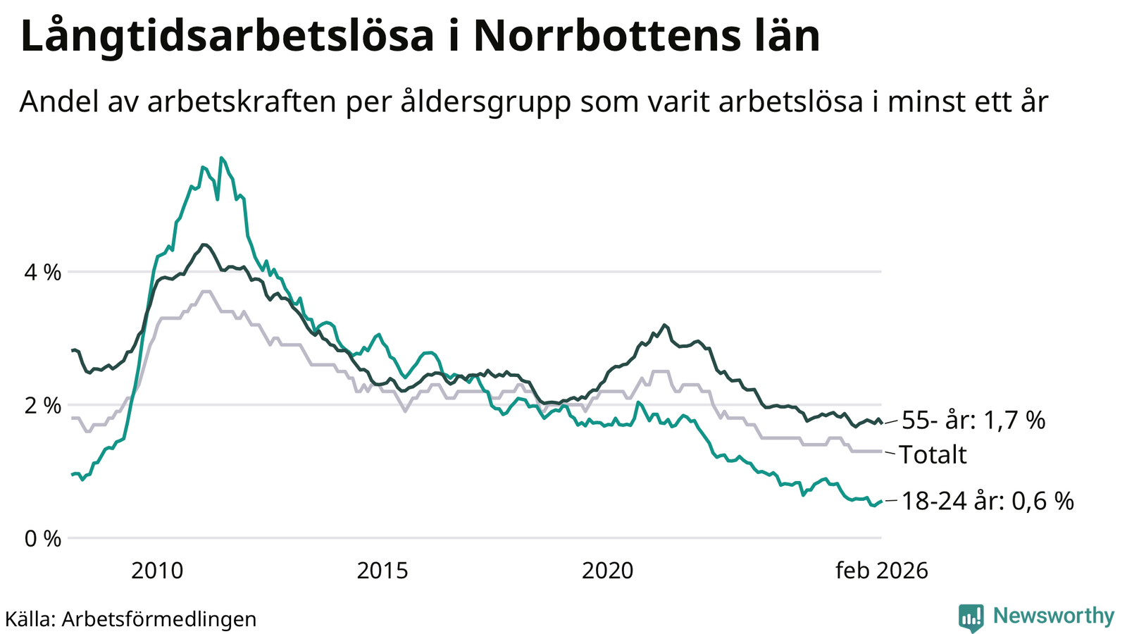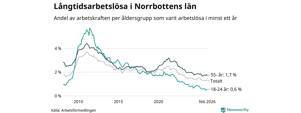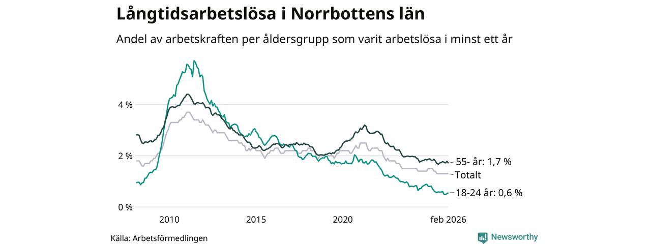 Av de 1 609 personerna som varit arbetslösa i mer än ett år i Norrbottens län är mellan 486 och 486 personer mellan 55 och 661 år och mellan 76 och 76 är mellan 18 och 24 år. För den äldre gruppen är andelen arbetslösa 1,7 procent medan den i den yngre gruppen är 0,6 procent. Även i riket som helhet är långtidsarbetslösheten högre i gruppen äldre.