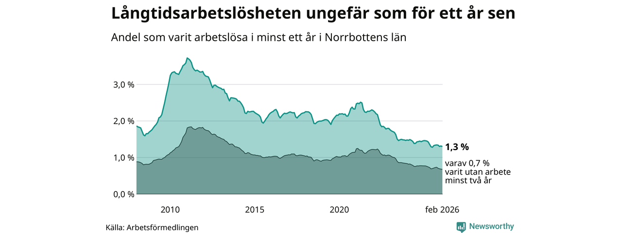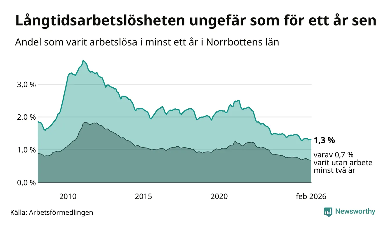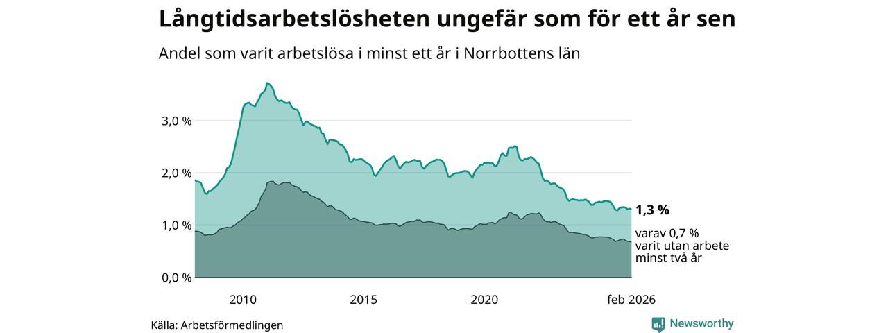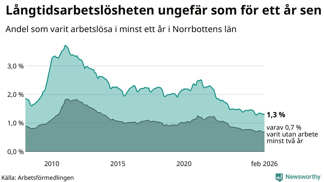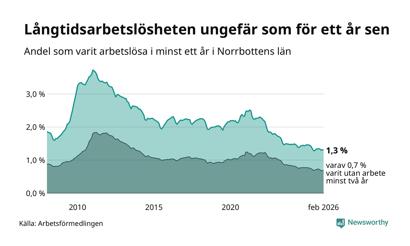 I februari hade 1 609 Norrbottensbor varit arbetslösa i minst ett år, vilket är 21 färre än månaden innan. 1 609 personer motsvarar 1,3 procent av arbetskraften i länet – andelen långtidsarbetslösa är ungefär på samma nivå som för ett år sedan. Norrbottens län hade lägst andel långtidsarbetslösa i landet i februari.