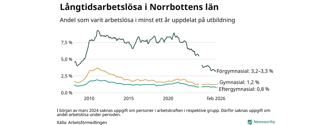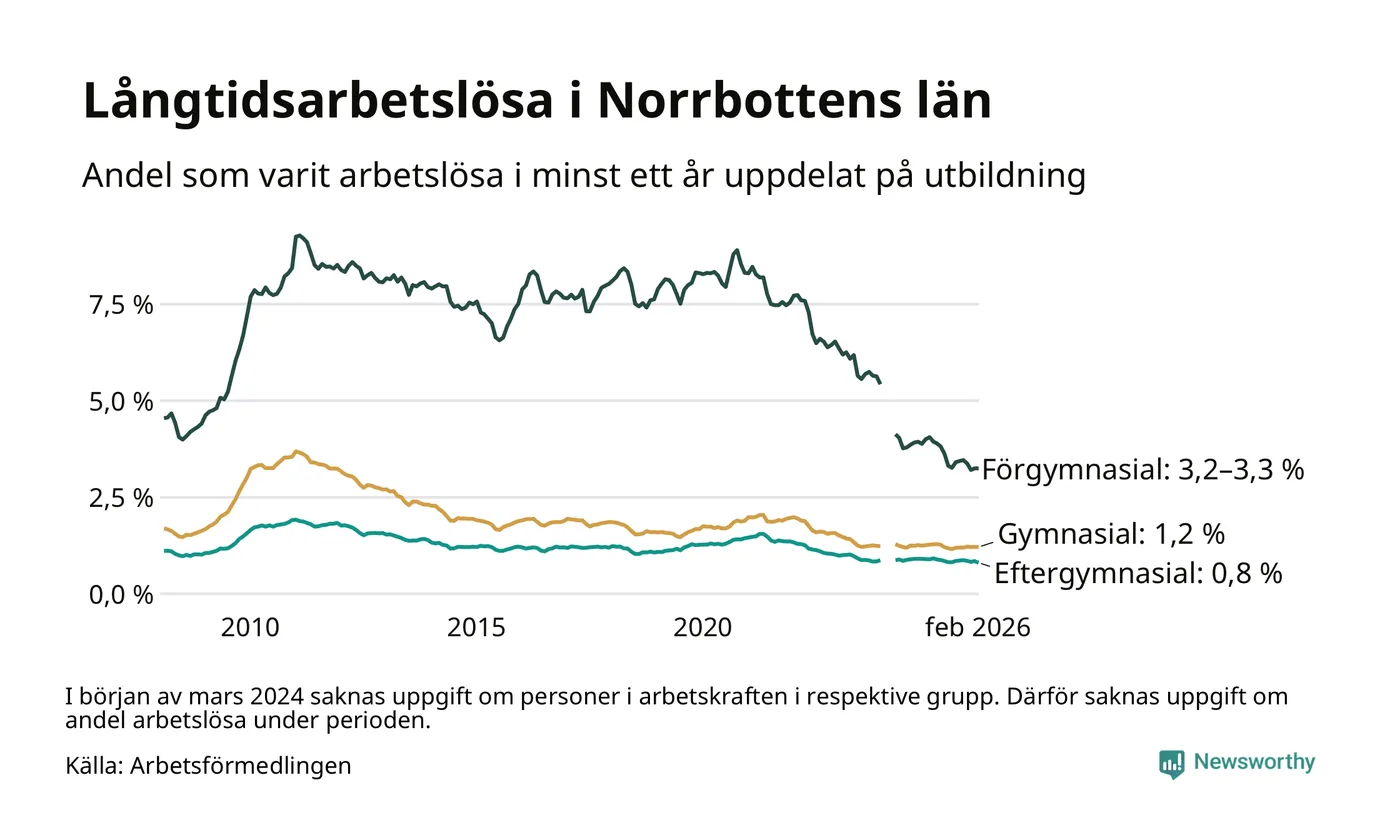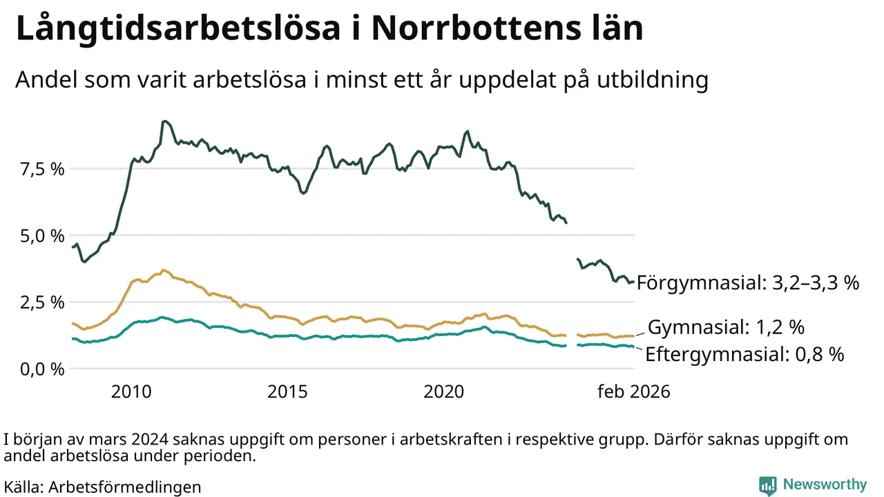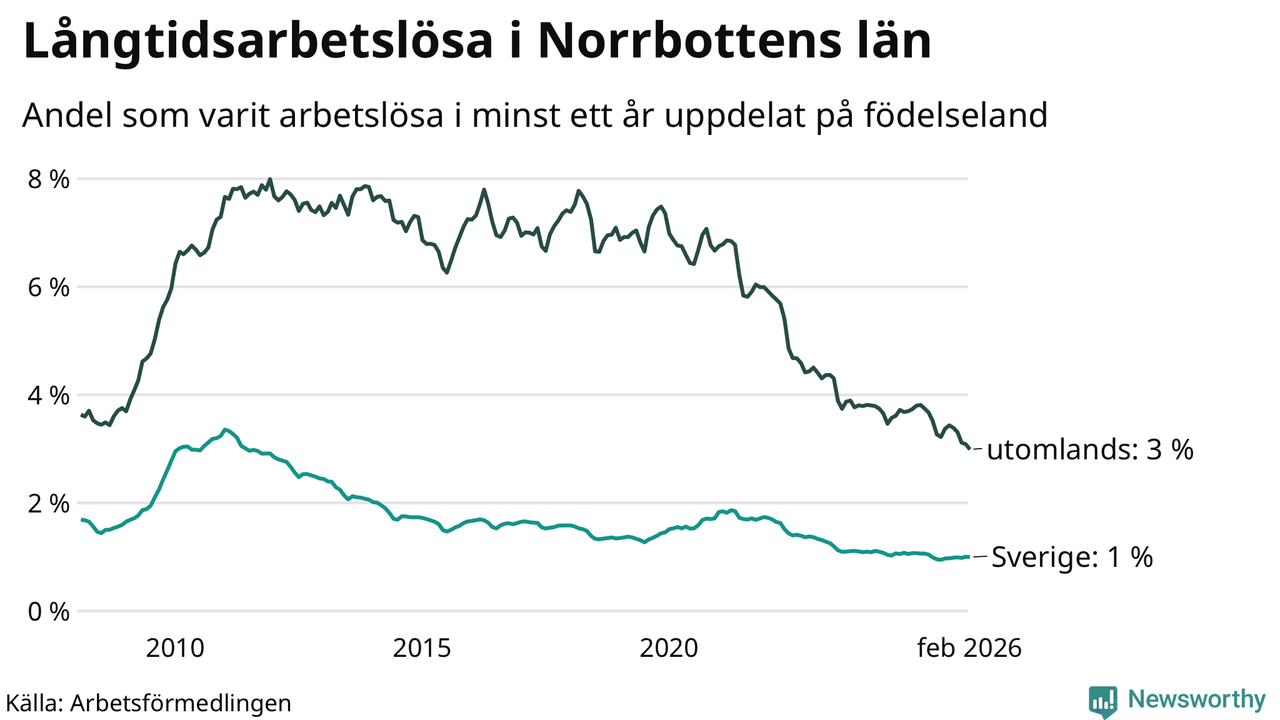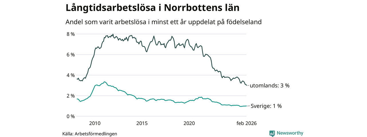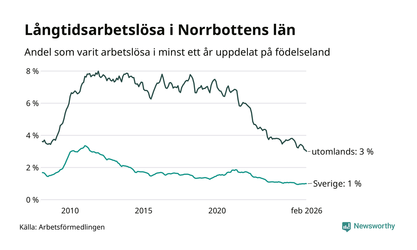 I februari hade 1 609 Norrbottensbor varit arbetslösa i minst ett år, vilket är 21 färre än månaden innan. 1 609 personer motsvarar 1,3 procent av arbetskraften i länet – andelen långtidsarbetslösa är ungefär på samma nivå som för ett år sedan. Norrbottens län hade lägst andel långtidsarbetslösa i landet i februari.