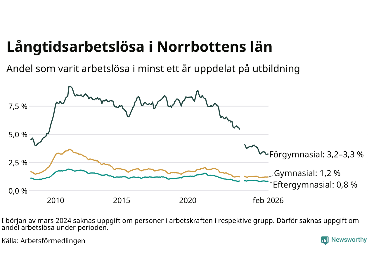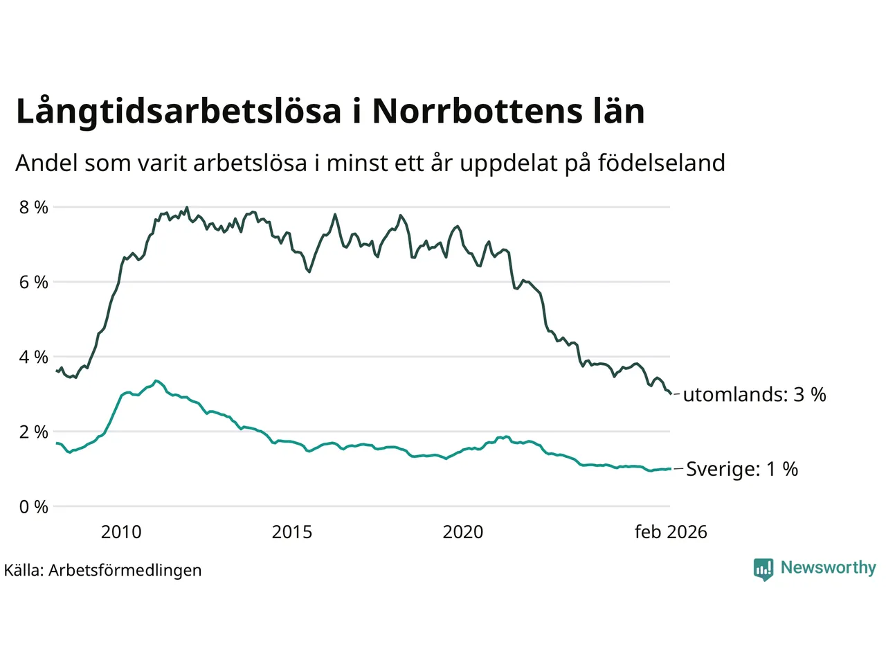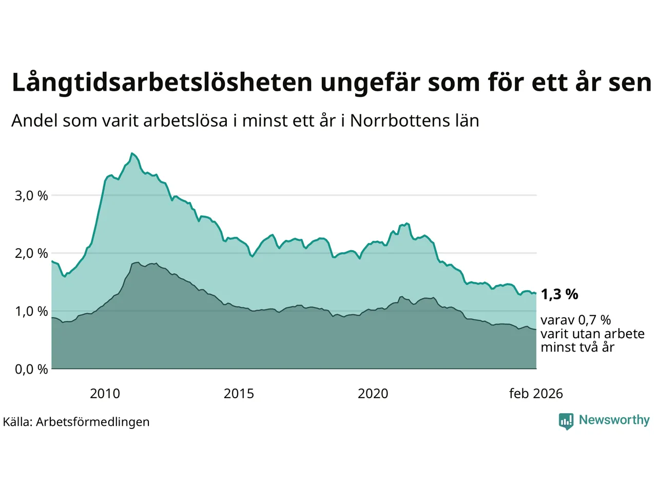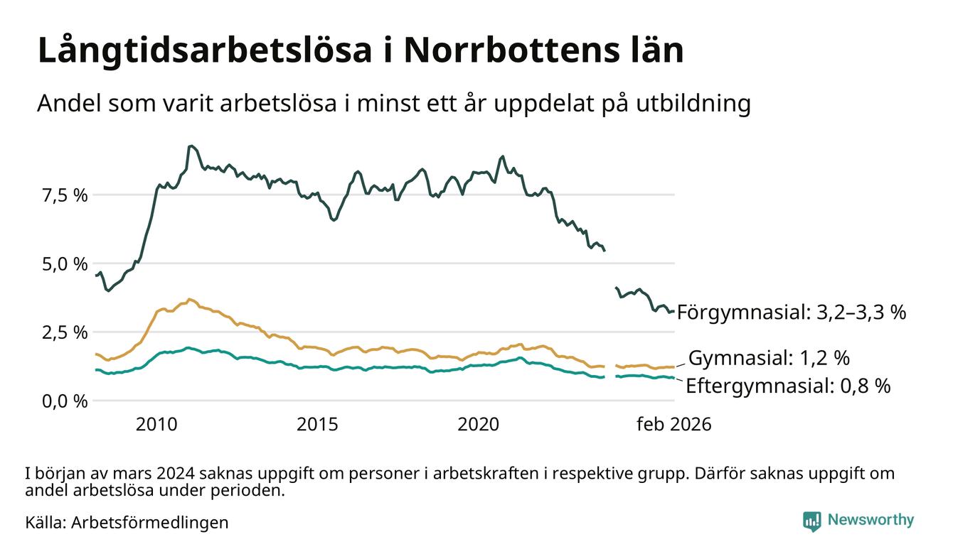 I februari hade 1 609 Norrbottensbor varit arbetslösa i minst ett år, vilket är 21 färre än månaden innan. 1 609 personer motsvarar 1,3 procent av arbetskraften i länet – andelen långtidsarbetslösa är ungefär på samma nivå som för ett år sedan. Norrbottens län hade lägst andel långtidsarbetslösa i landet i februari.