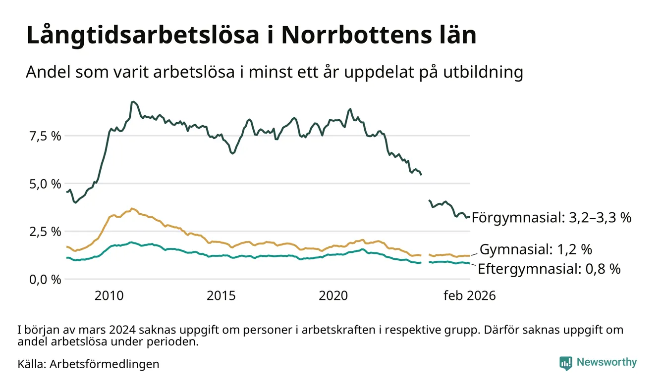 Graf över andel långtidsarbetslösa i Norrbotten uppdelat på utbildningsnivå