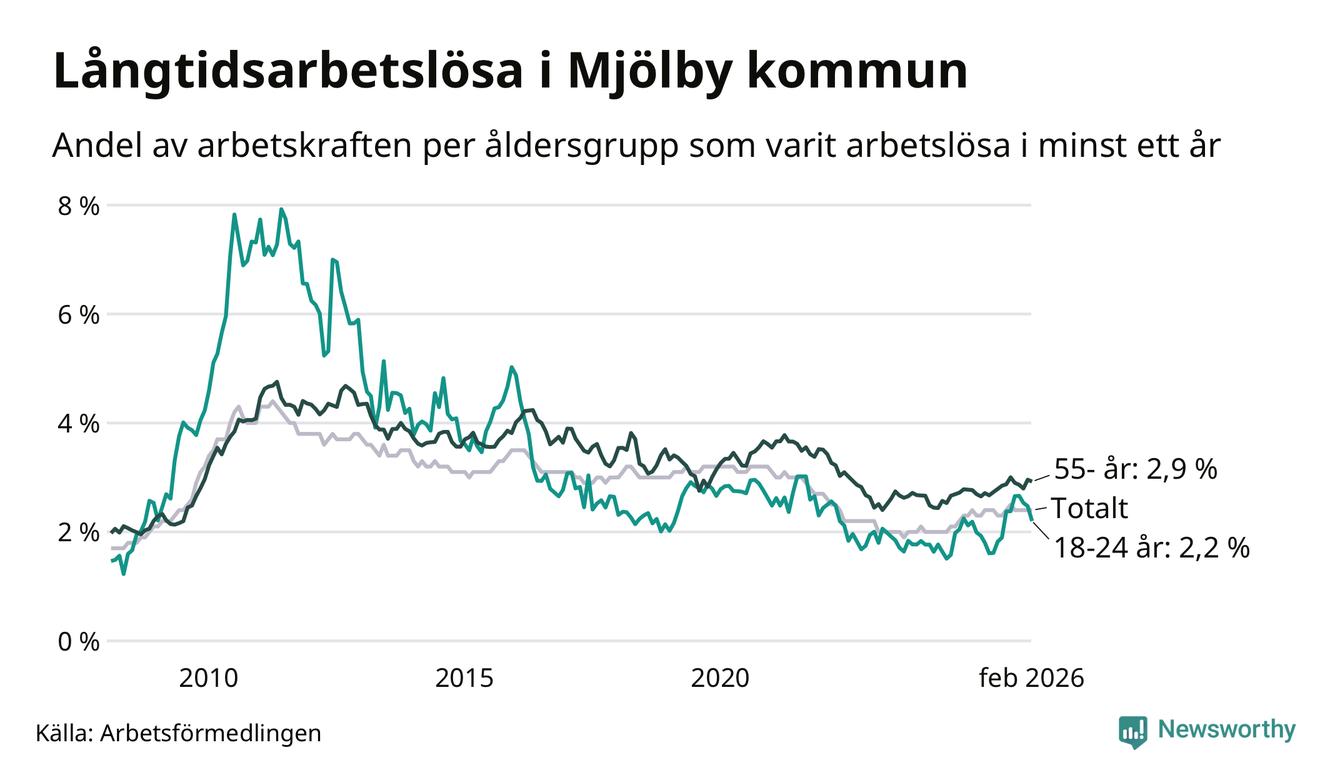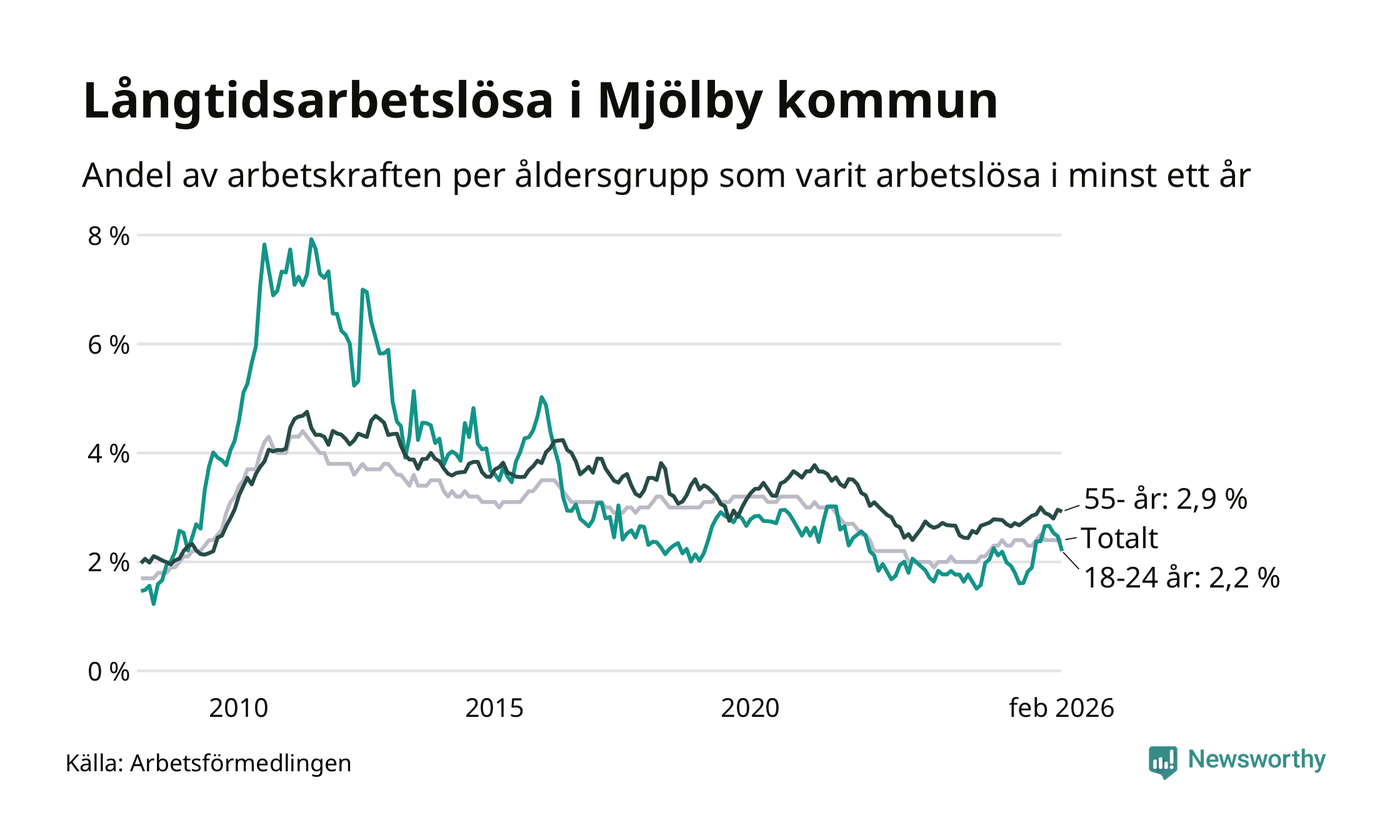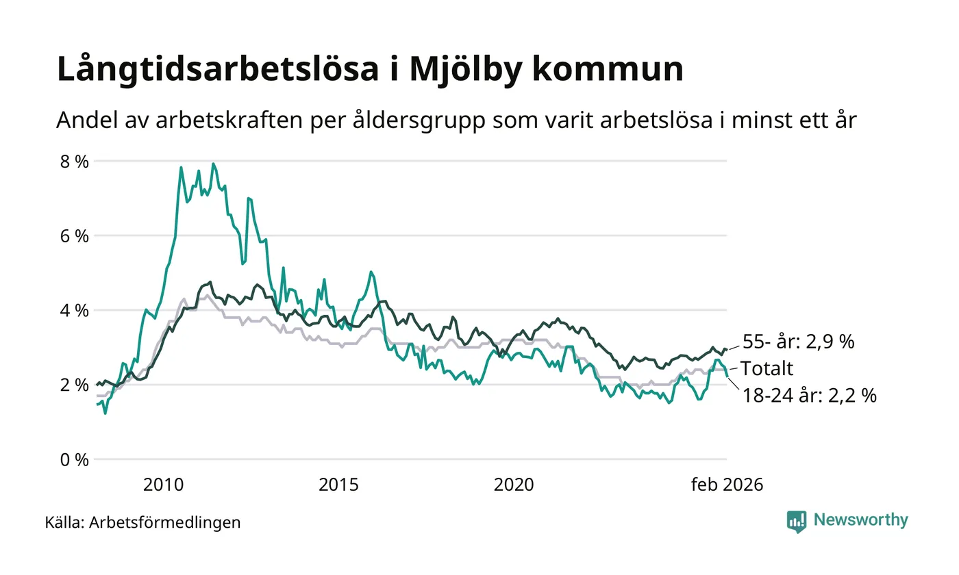 Av de 353 personerna som varit arbetslösa i mer än ett år i Mjölby kommun är 89 personer mellan 55 och 661 år och 32 är mellan 18 och 24 år. För den äldre gruppen är andelen arbetslösa 2,9 procent medan den i den yngre gruppen är 2,2 procent. Även i riket som helhet är långtidsarbetslösheten högre i gruppen äldre.