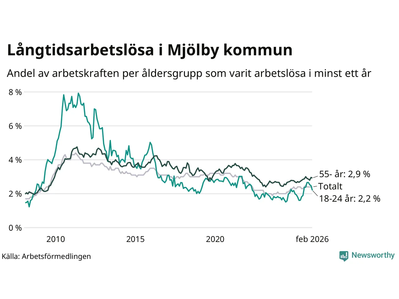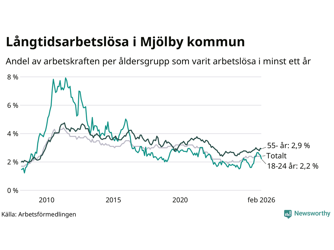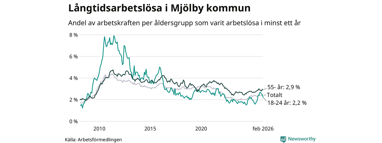Av de 353 personerna som varit arbetslösa i mer än ett år i Mjölby kommun är 89 personer mellan 55 och 661 år och 32 är mellan 18 och 24 år. För den äldre gruppen är andelen arbetslösa 2,9 procent medan den i den yngre gruppen är 2,2 procent. Även i riket som helhet är långtidsarbetslösheten högre i gruppen äldre.