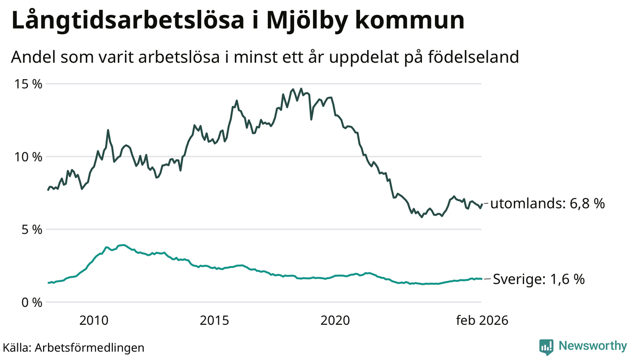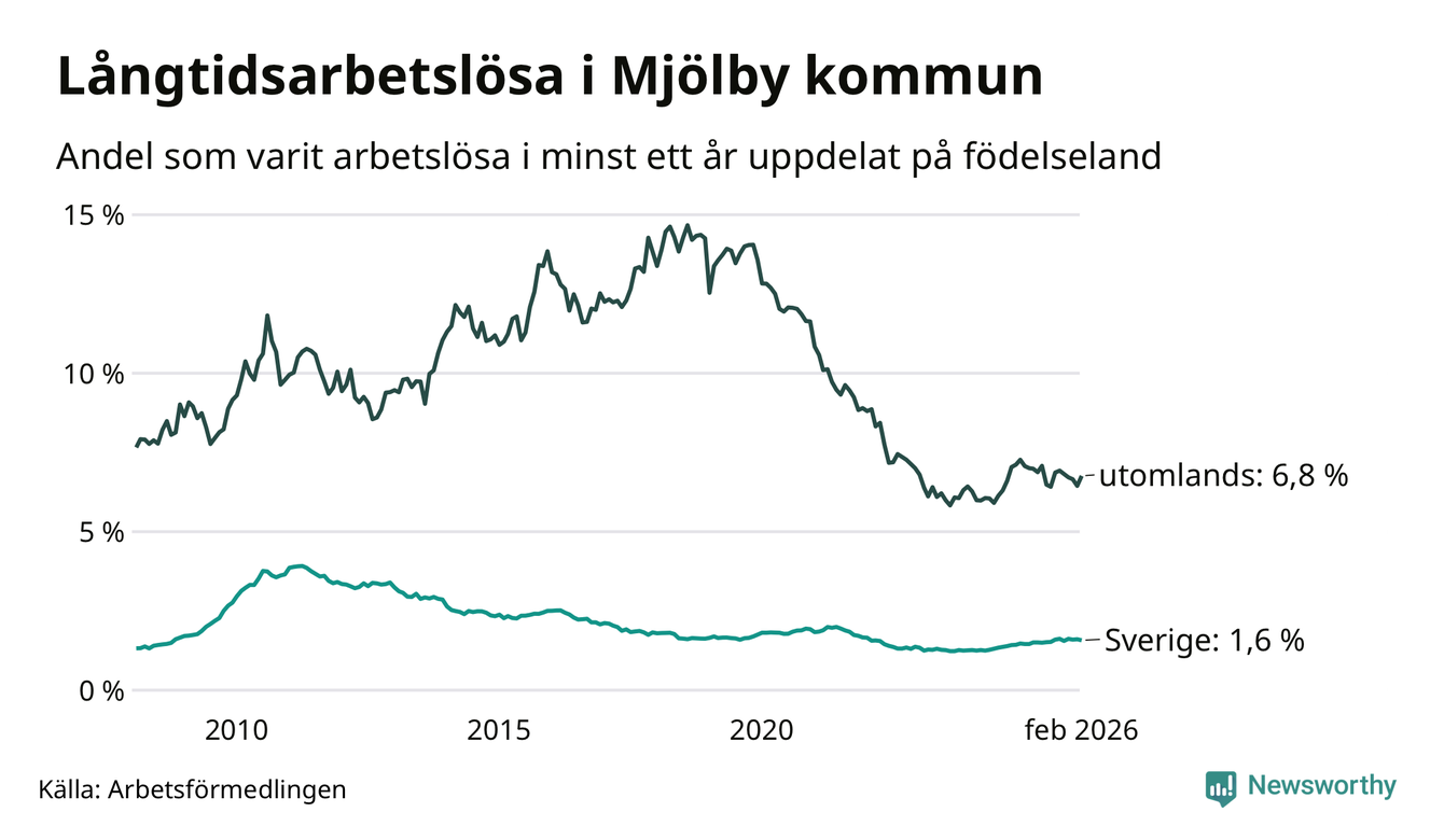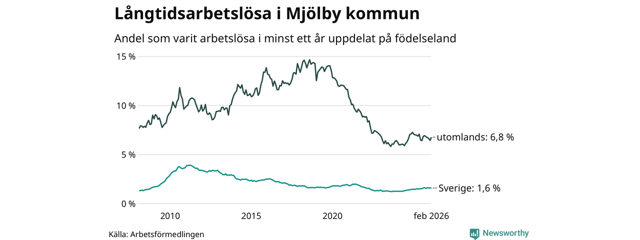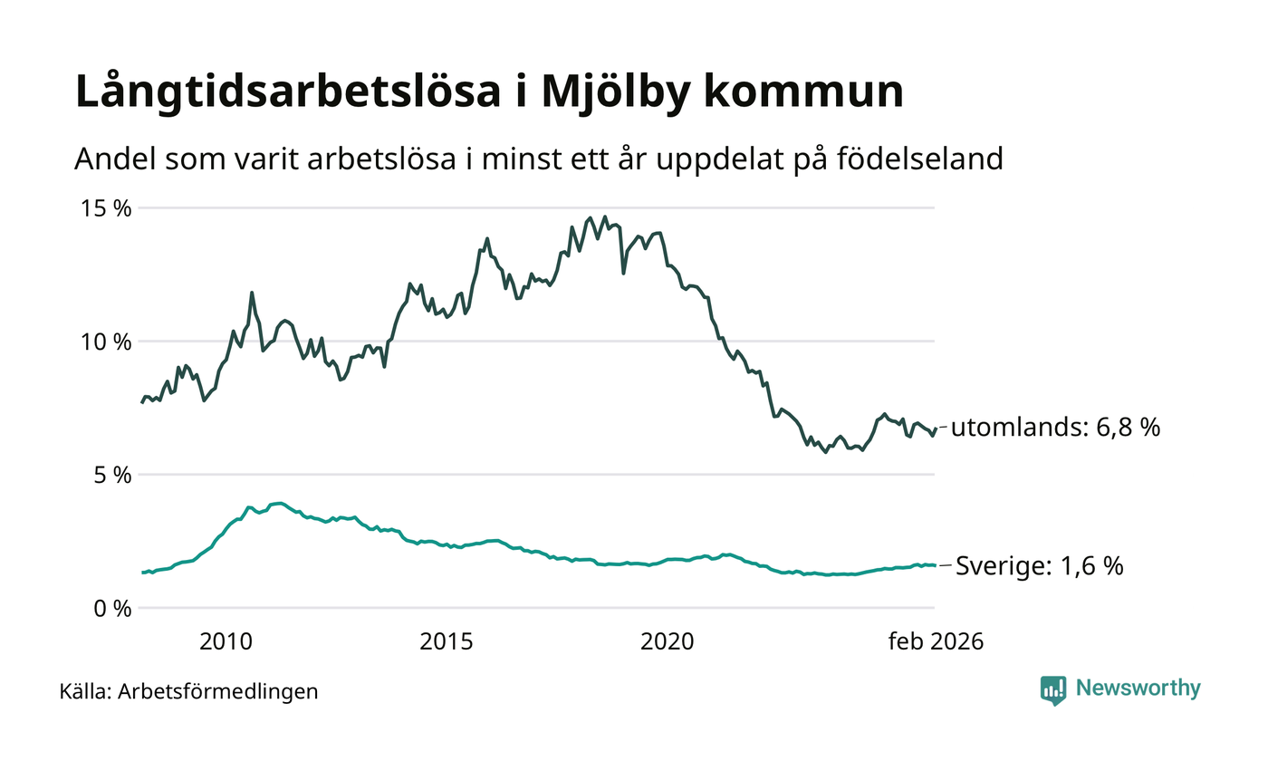 192 av de långtidsarbetslösa i Mjölby är födda i Sverige, medan 161 är födda utomlands. Det innebär att långtidsarbetslösheten bland Sverigefödda är 1,6 procent, medan den är fyra gånger så hög – 6,8 procent – bland födda utomlands. Även i riket som helhet är arbetslösheten högre bland utrikesfödda.