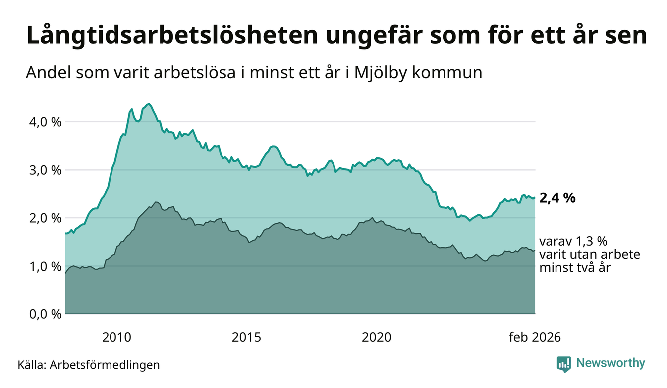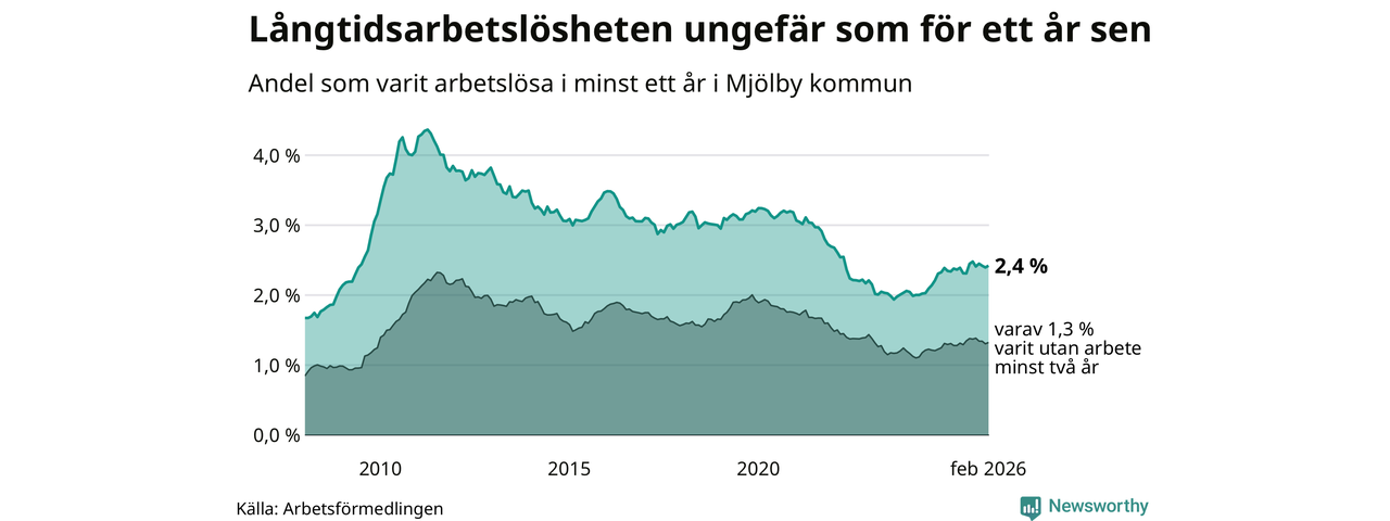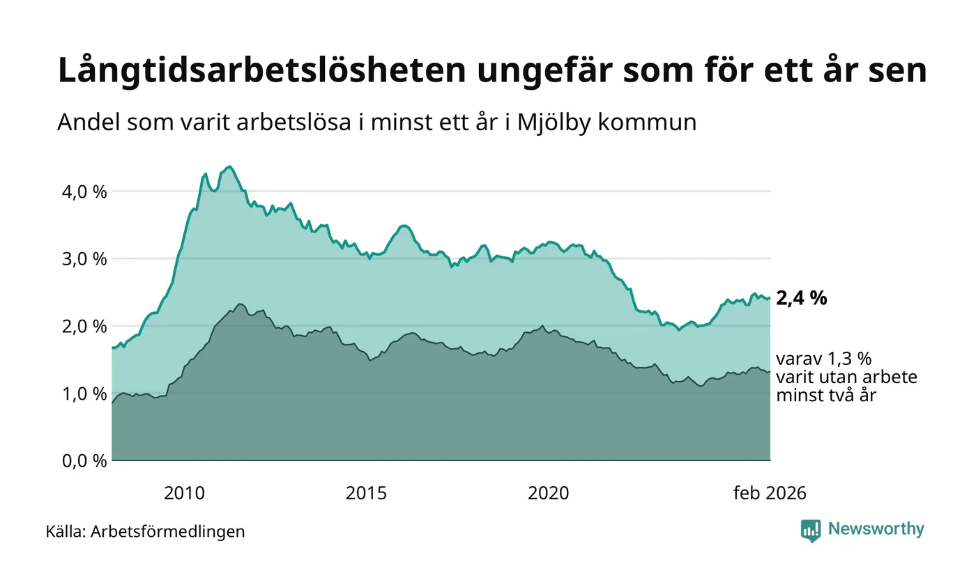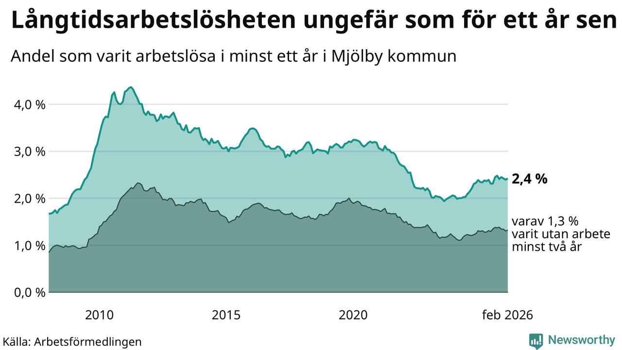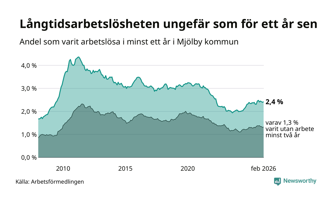 I februari hade 353 Mjölbybor varit arbetslösa i minst ett år, vilket är fyra fler än månaden innan. 353 personer motsvarar 2,4 procent av arbetskraften i kommunen – andelen långtidsarbetslösa är ungefär på samma nivå som för ett år sedan.