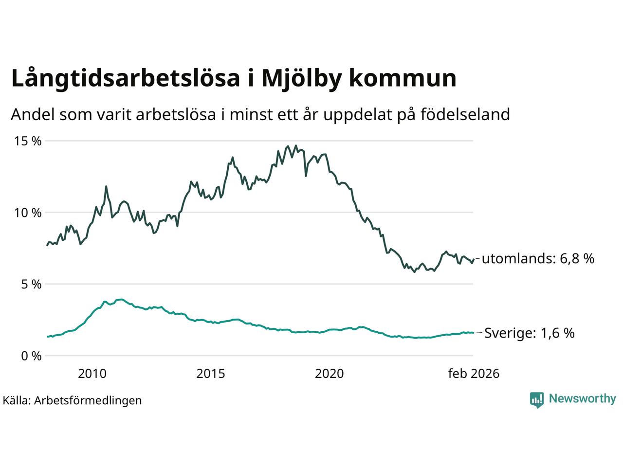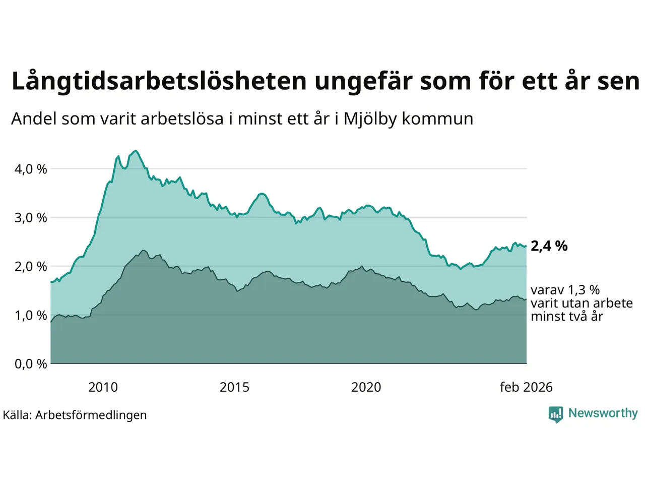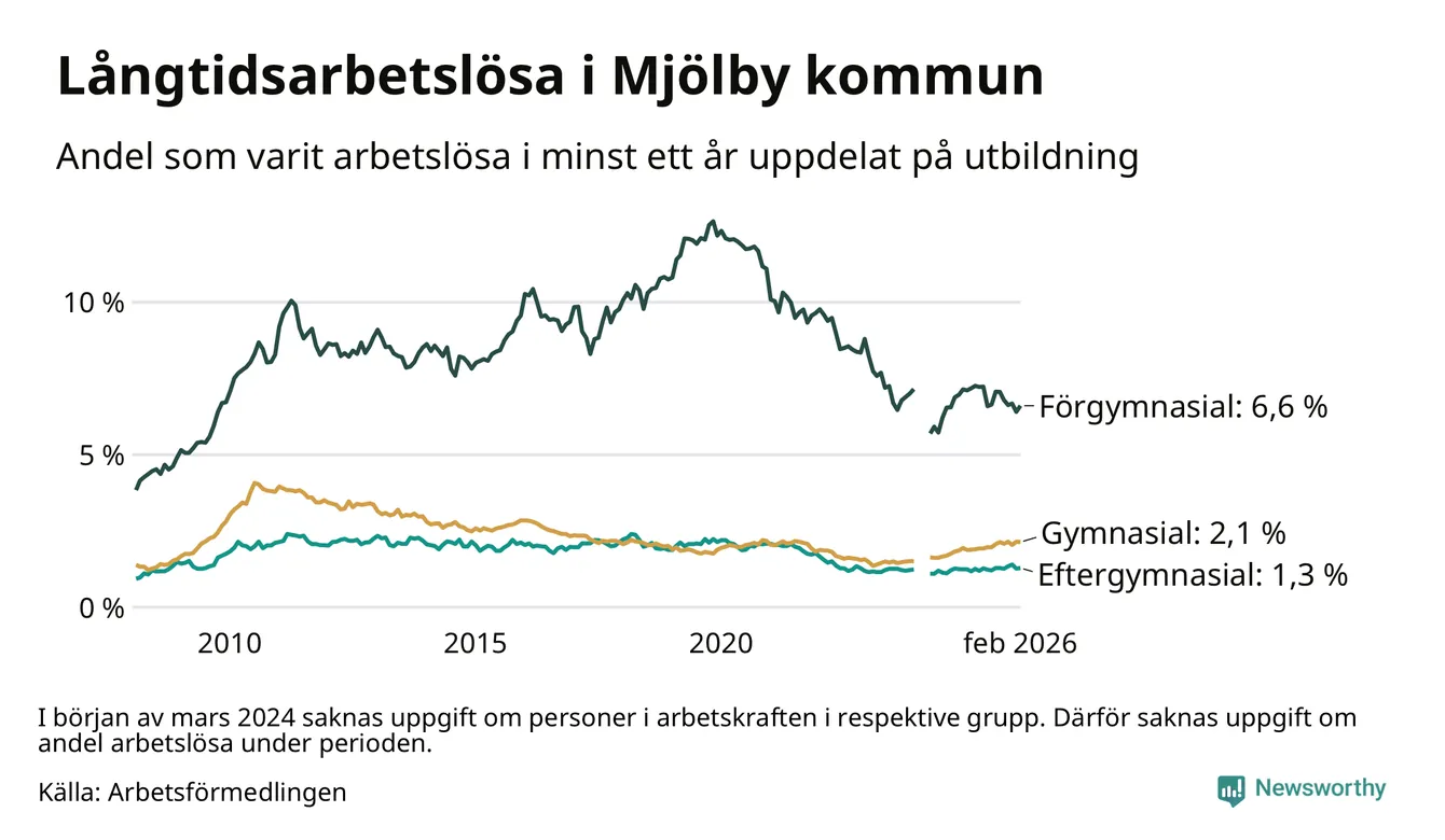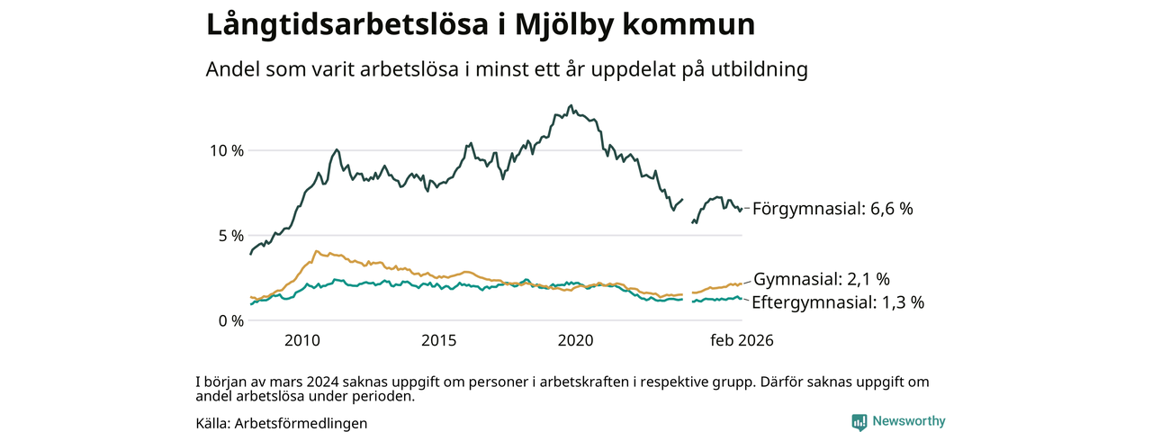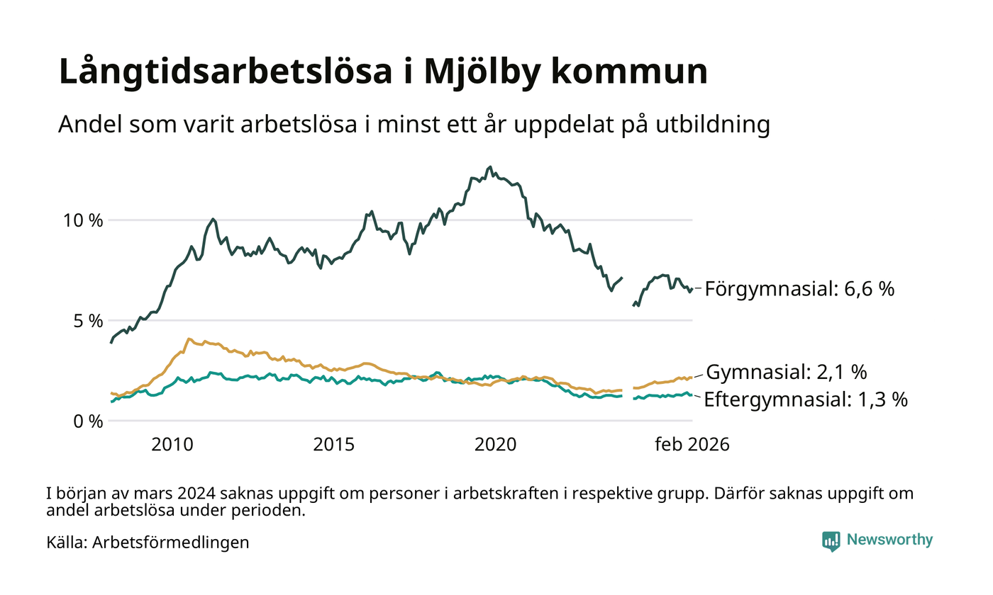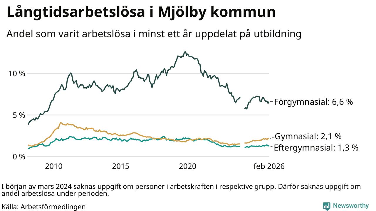 I februari hade 353 Mjölbybor varit arbetslösa i minst ett år, vilket är fyra fler än månaden innan. 353 personer motsvarar 2,4 procent av arbetskraften i kommunen – andelen långtidsarbetslösa är ungefär på samma nivå som för ett år sedan.