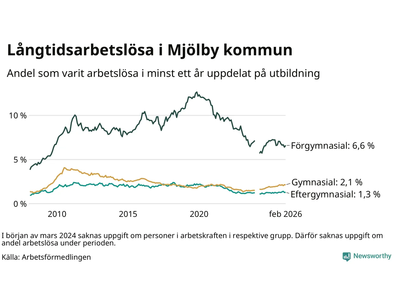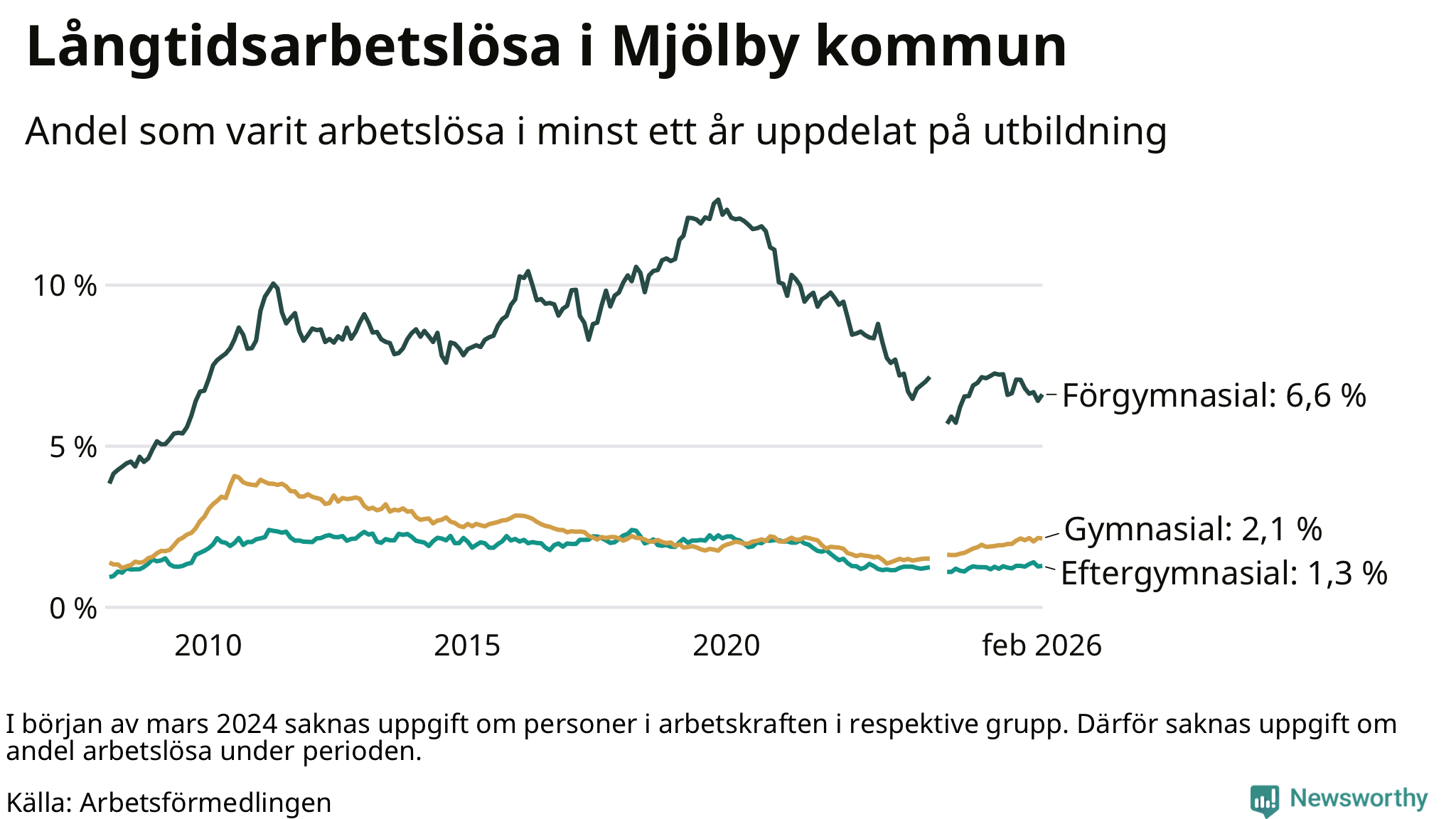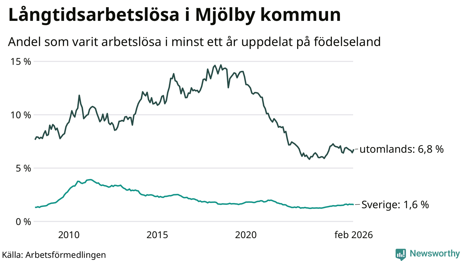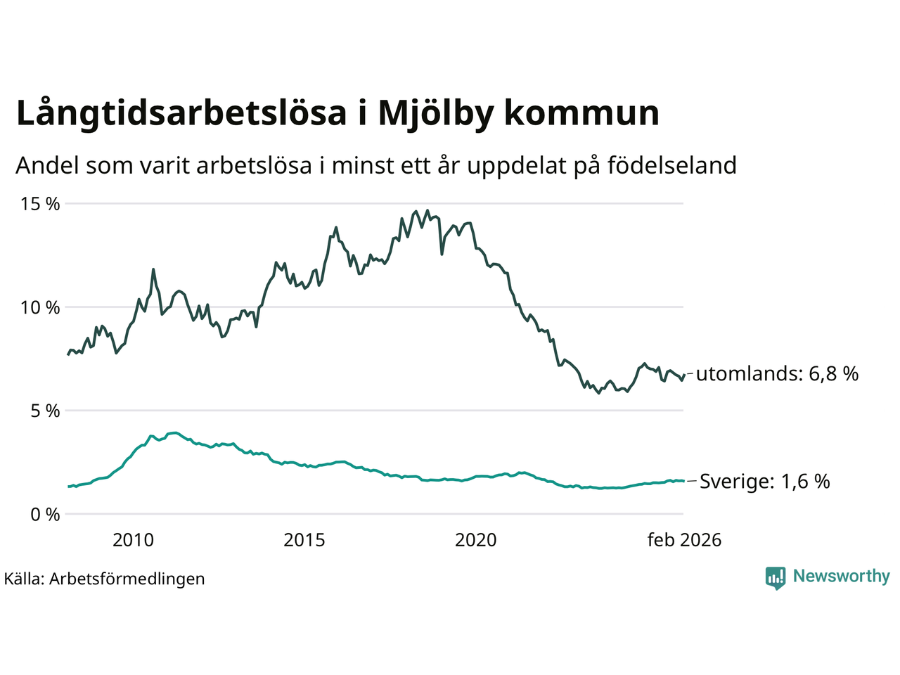 I februari hade 353 Mjölbybor varit arbetslösa i minst ett år, vilket är fyra fler än månaden innan. 353 personer motsvarar 2,4 procent av arbetskraften i kommunen – andelen långtidsarbetslösa är ungefär på samma nivå som för ett år sedan.