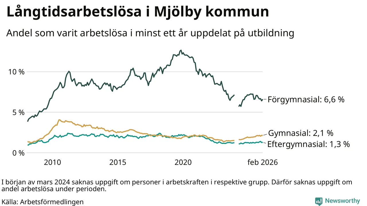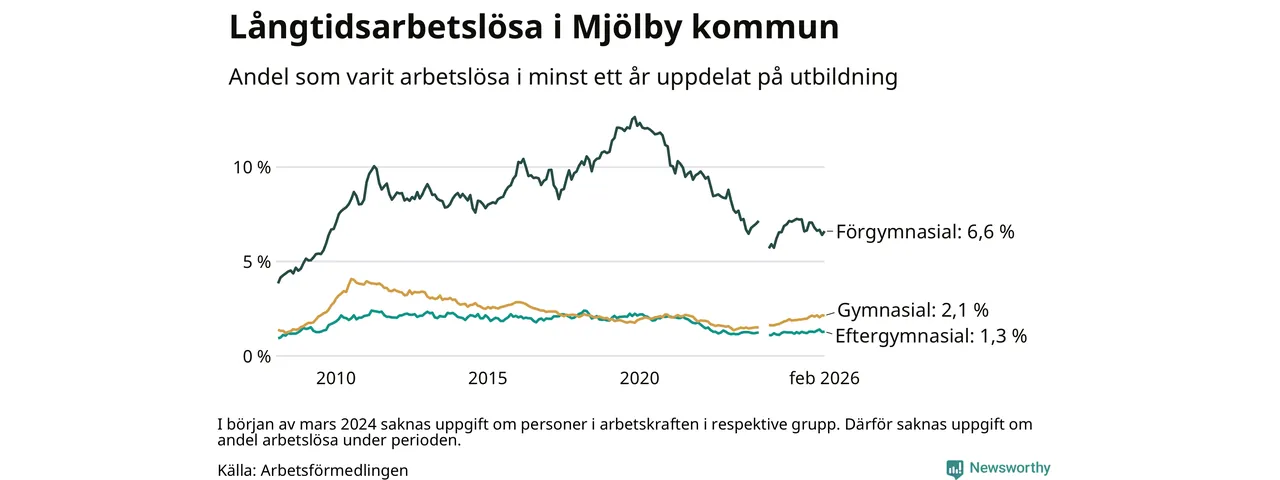 Andelen som varit utan arbete i minst ett år i Mjölby var ungefär lika stor i februari jämfört med samma månad för ett år sedan. Det visar Arbetsfömedlingens senaste månadsstatistik.