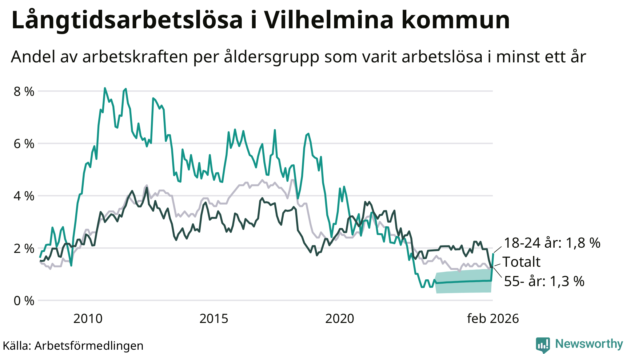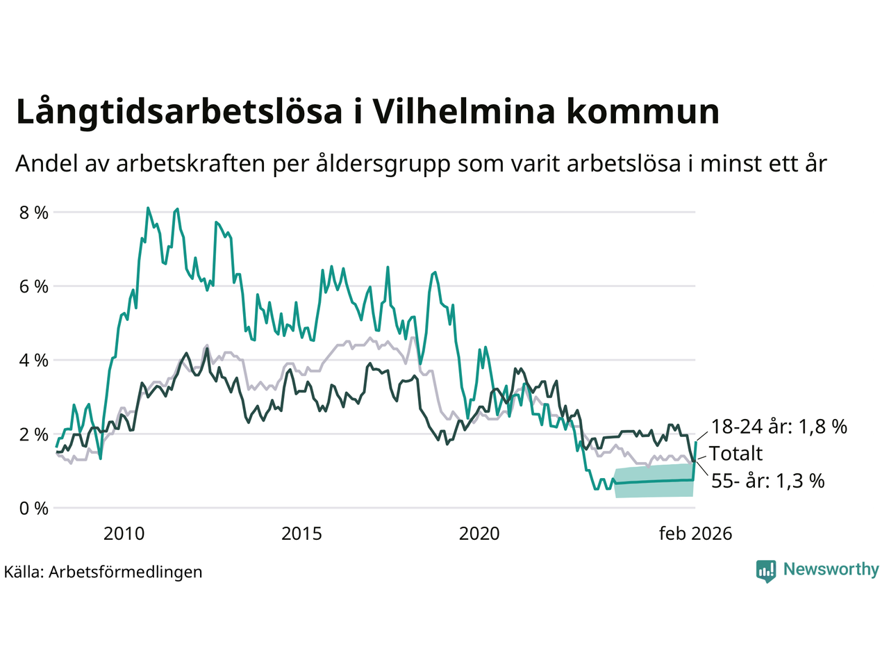 | Andel arbetslösa i minst två år | 0,6 % | 0,6 % | 1,6 % |