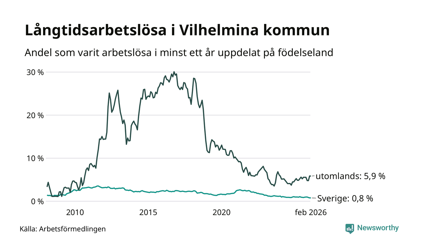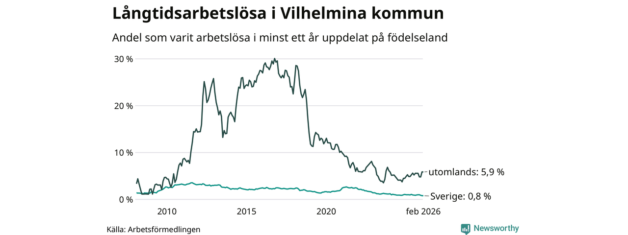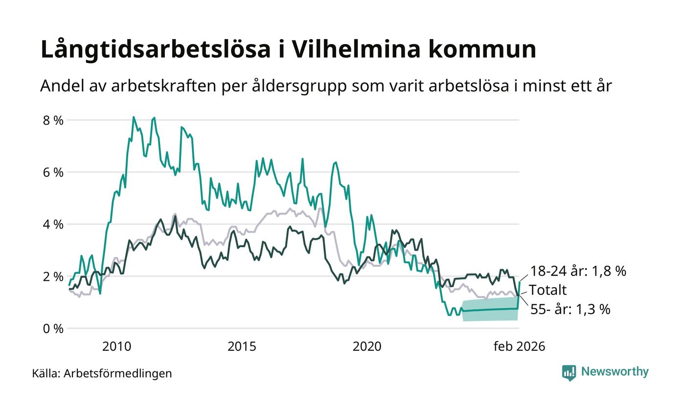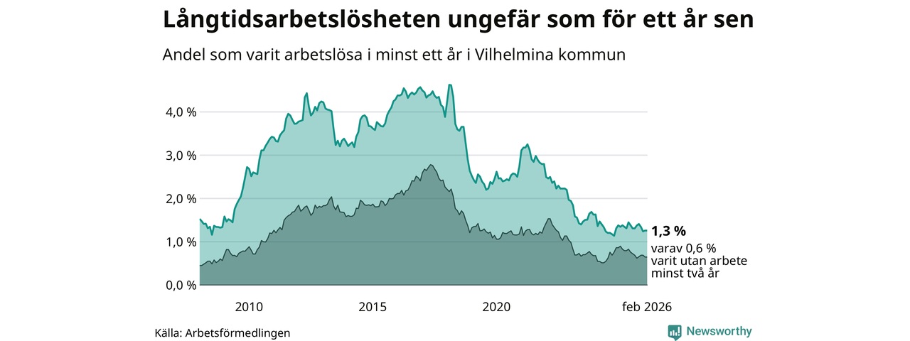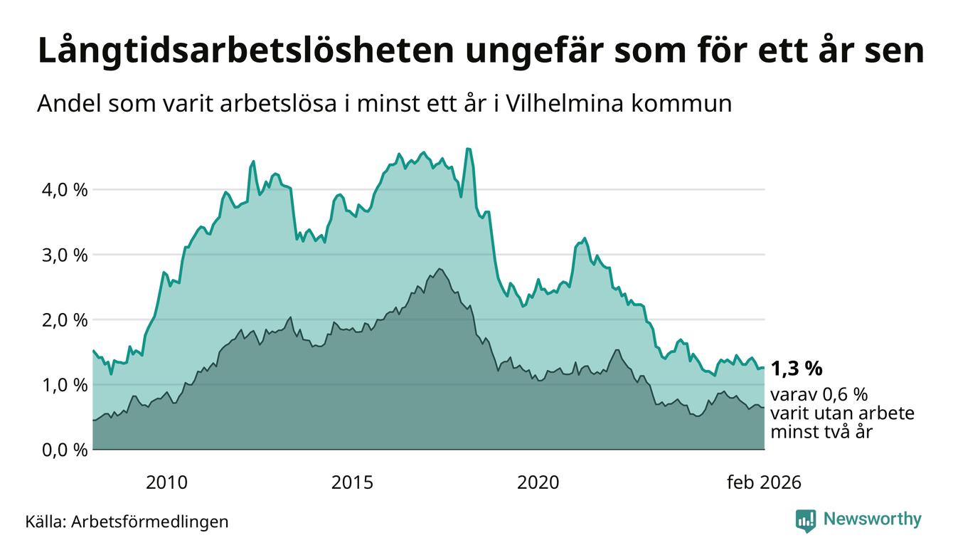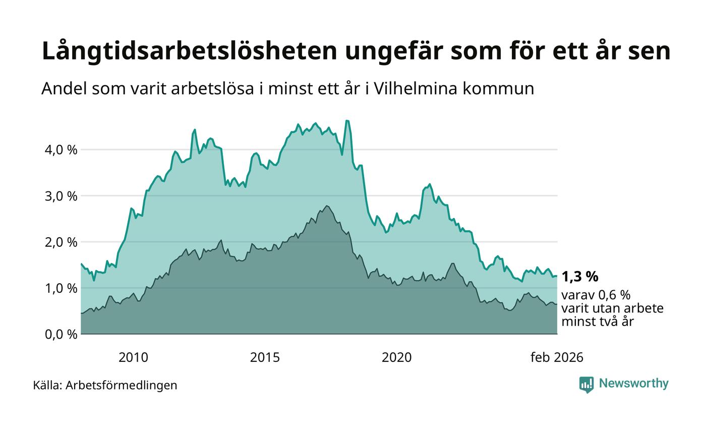 I februari hade 37 Vilhelminabor varit arbetslösa i minst ett år, vilket är lika många som månaden innan. 37 personer motsvarar 1,3 procent av arbetskraften i kommunen – andelen långtidsarbetslösa är ungefär på samma nivå som för ett år sedan.