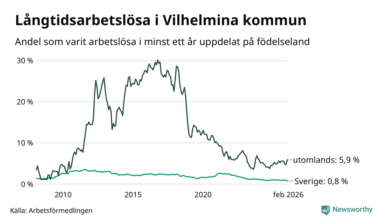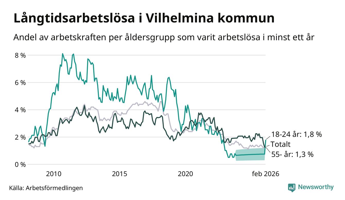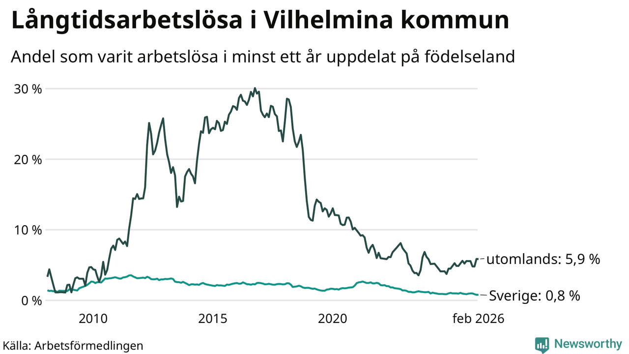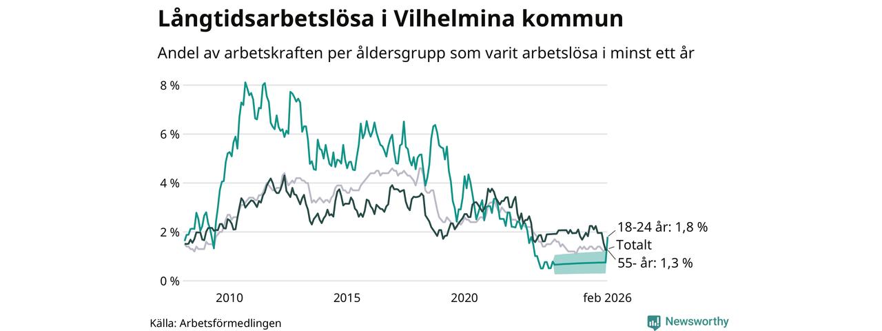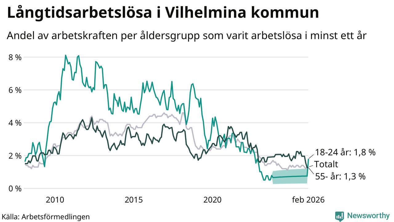 I februari hade 37 Vilhelminabor varit arbetslösa i minst ett år, vilket är lika många som månaden innan. 37 personer motsvarar 1,3 procent av arbetskraften i kommunen – andelen långtidsarbetslösa är ungefär på samma nivå som för ett år sedan.