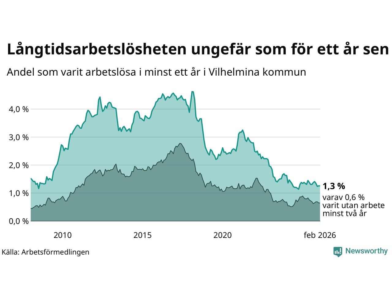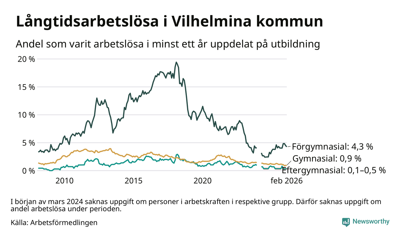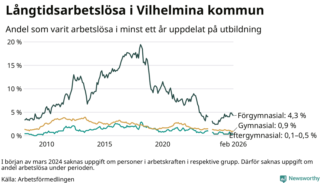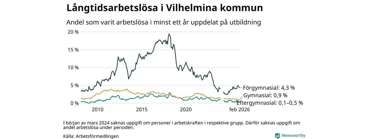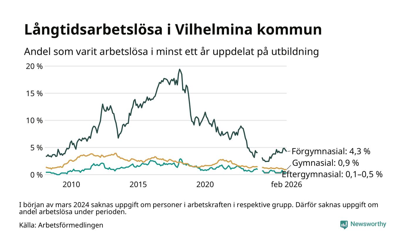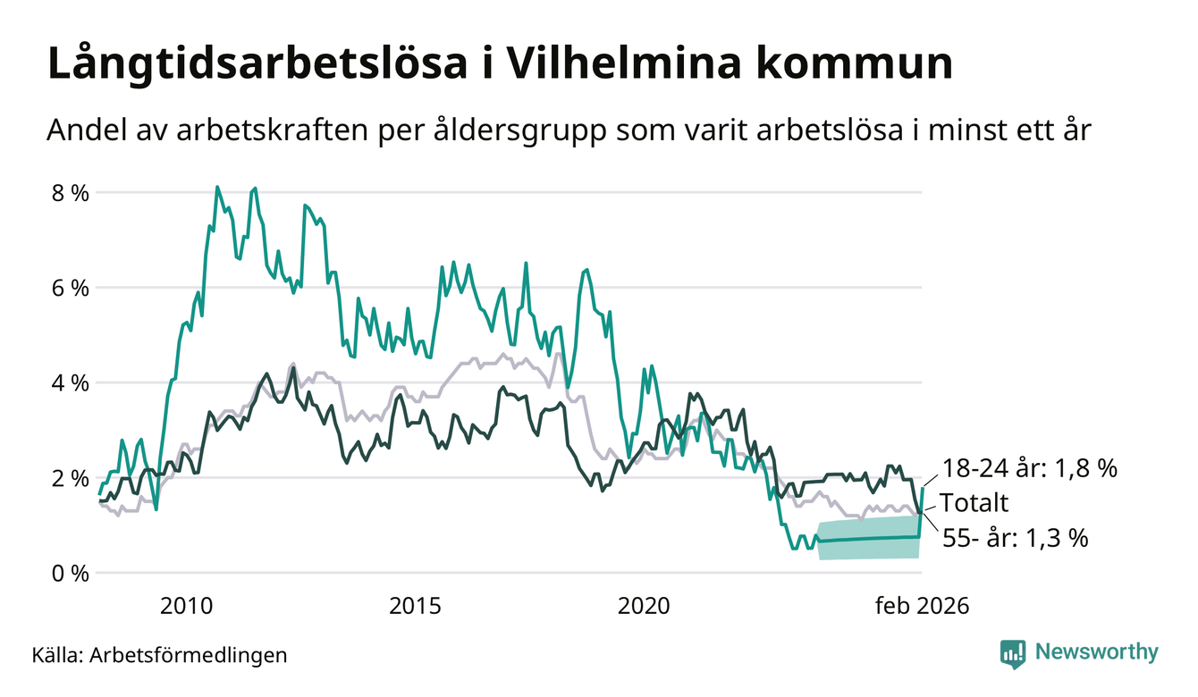 I februari hade 37 Vilhelminabor varit arbetslösa i minst ett år, vilket är lika många som månaden innan. 37 personer motsvarar 1,3 procent av arbetskraften i kommunen – andelen långtidsarbetslösa är ungefär på samma nivå som för ett år sedan.