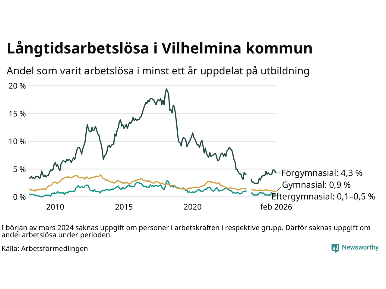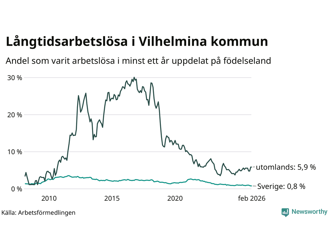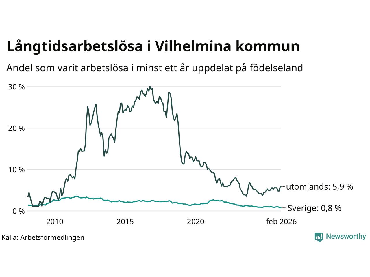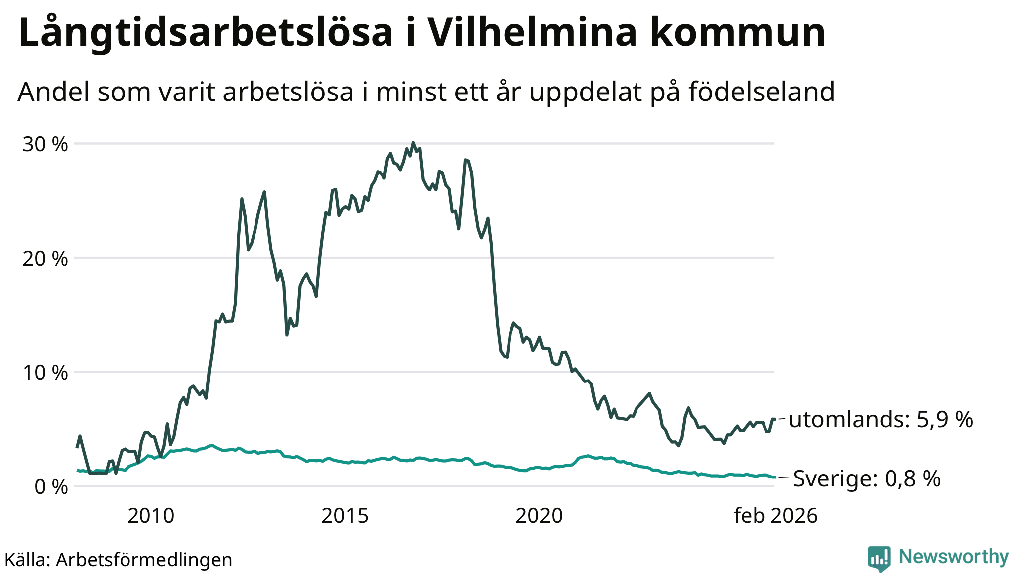 I februari hade 37 Vilhelminabor varit arbetslösa i minst ett år, vilket är lika många som månaden innan. 37 personer motsvarar 1,3 procent av arbetskraften i kommunen – andelen långtidsarbetslösa är ungefär på samma nivå som för ett år sedan.