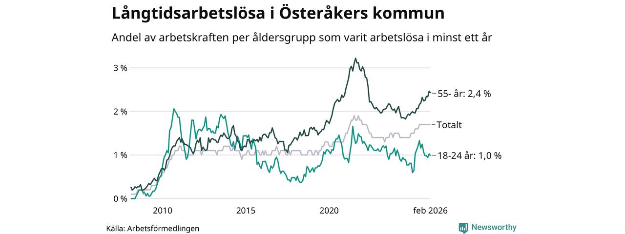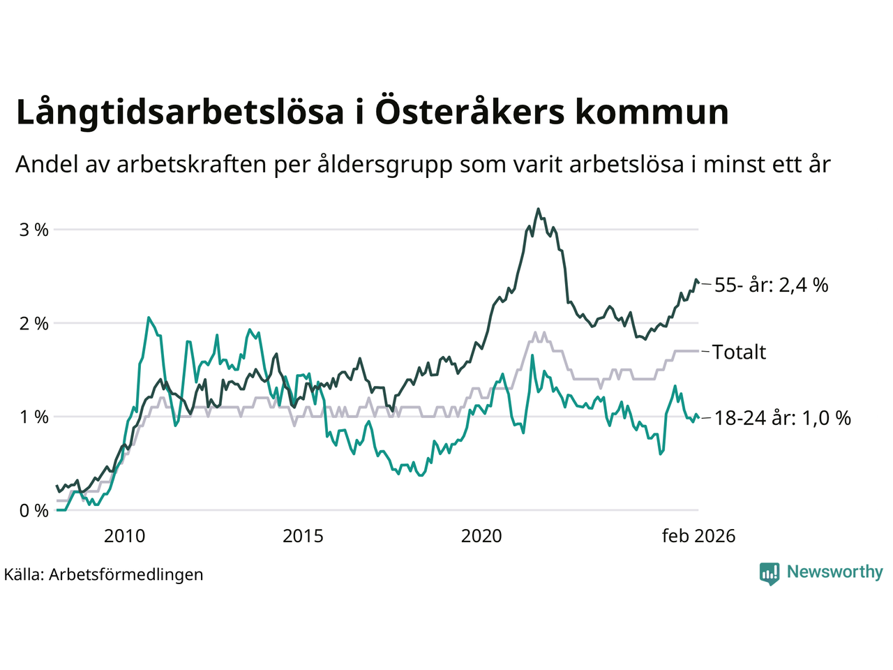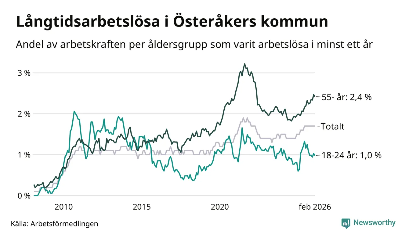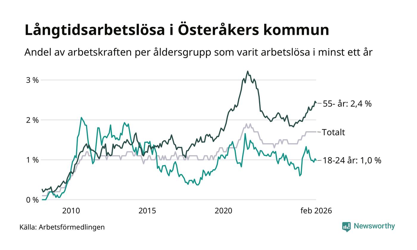 Av de 440 personerna som varit arbetslösa i mer än ett år i Österåkers kommun är 141 personer mellan 55 och 661 år och 23 är mellan 18 och 24 år. För den äldre gruppen är andelen arbetslösa 2,4 procent medan den i den yngre gruppen är 1,0 procent. Även i riket som helhet är långtidsarbetslösheten högre i gruppen äldre.