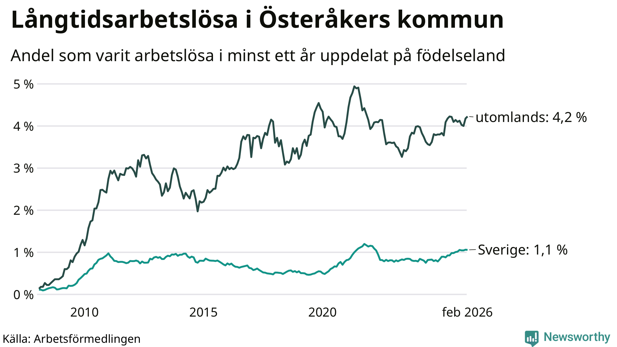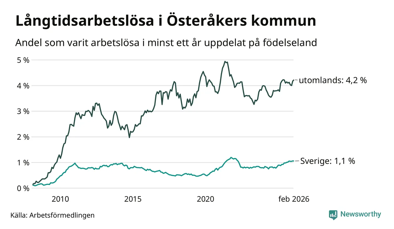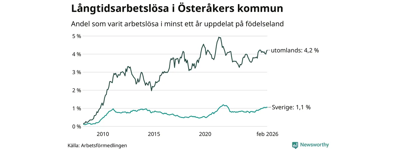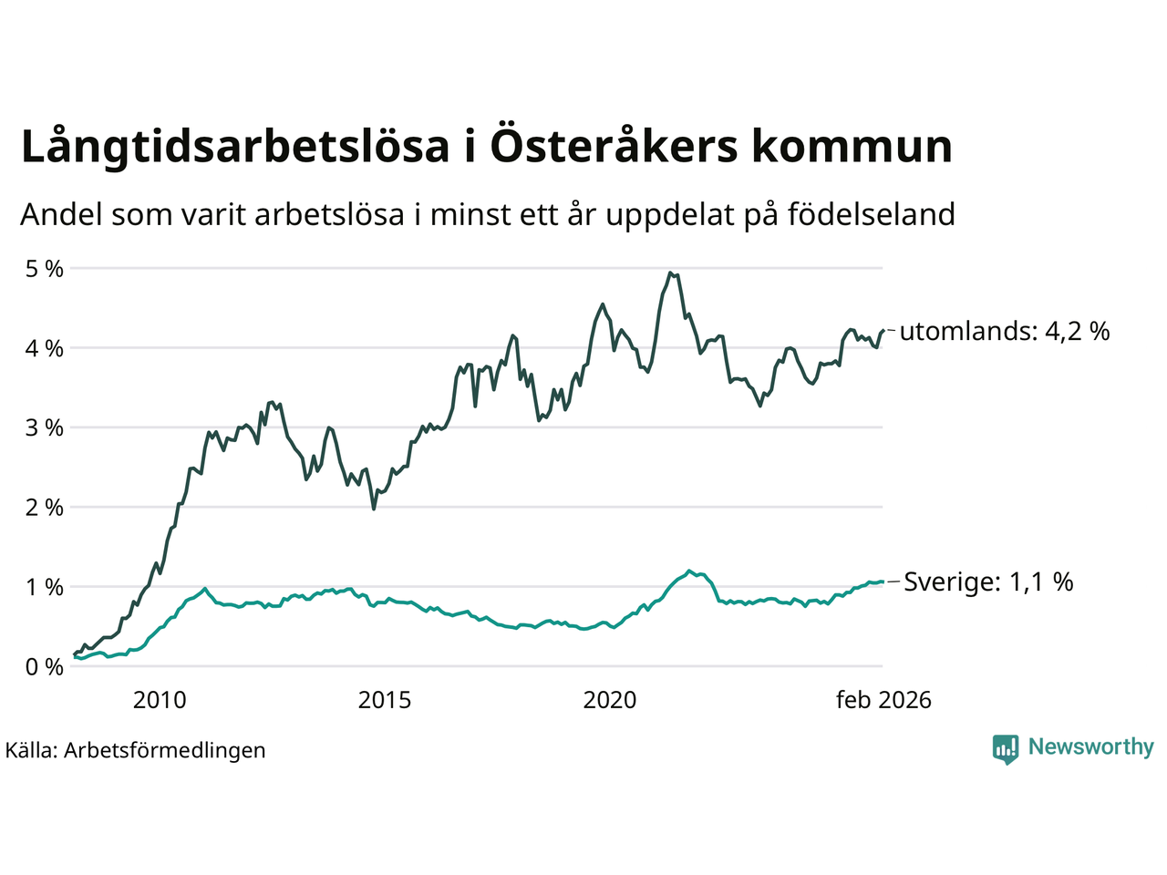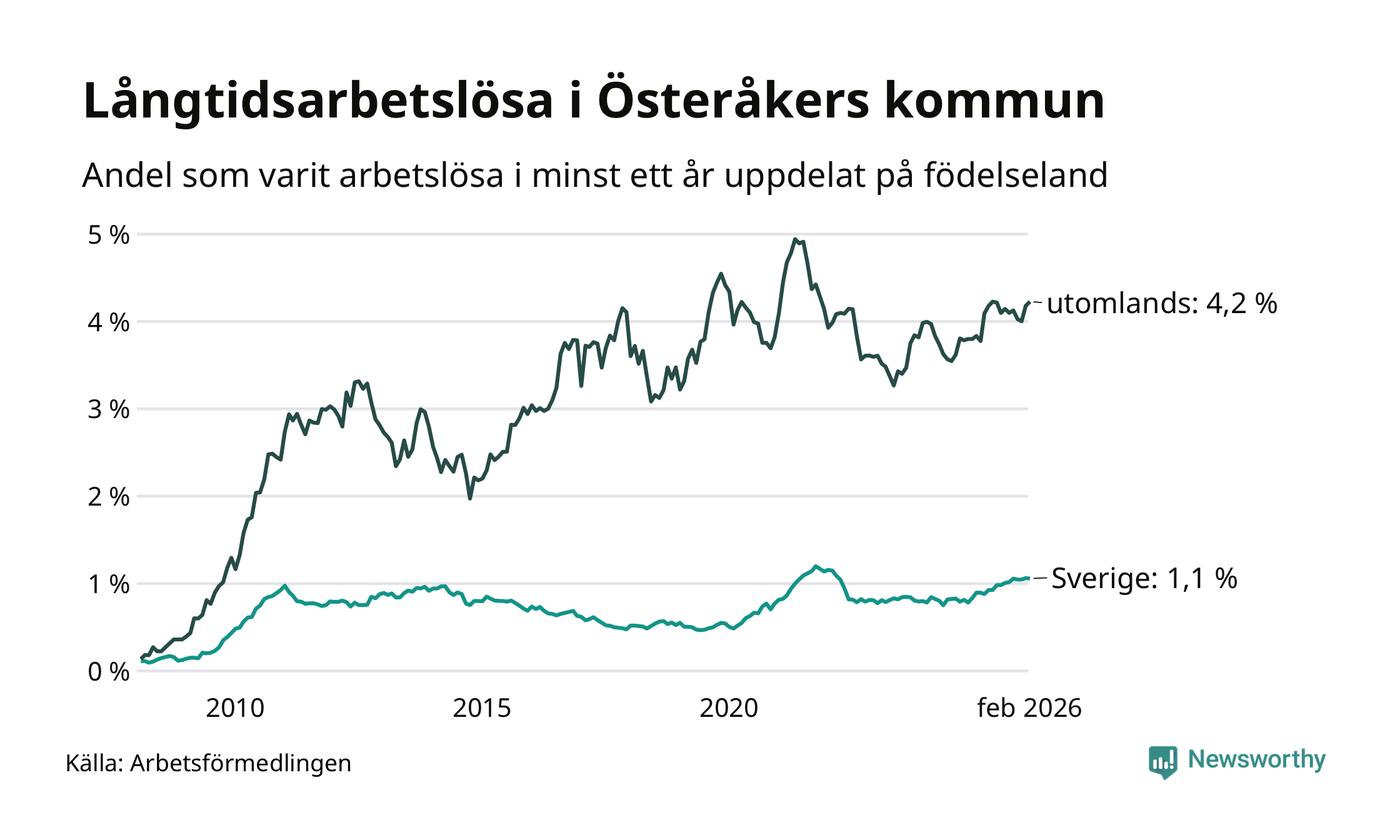 209 av de långtidsarbetslösa i Österåker är födda i Sverige, medan 231 är födda utomlands. Det innebär att långtidsarbetslösheten bland Sverigefödda är 1,1 procent, medan den är fyra gånger så hög – 4,2 procent – bland födda utomlands. Även i riket som helhet är arbetslösheten högre bland utrikesfödda.