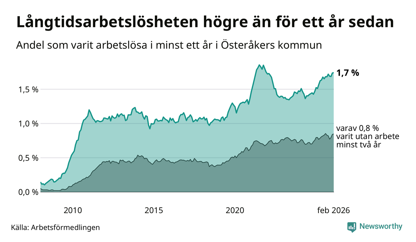 I februari hade 440 Österåkersbor varit arbetslösa i minst ett år, vilket är två fler än månaden innan. 440 personer motsvarar 1,7 procent av arbetskraften i kommunen – andelen långtidsarbetslösa är 0,2 procentenheter högre än samma månad för ett år sedan.