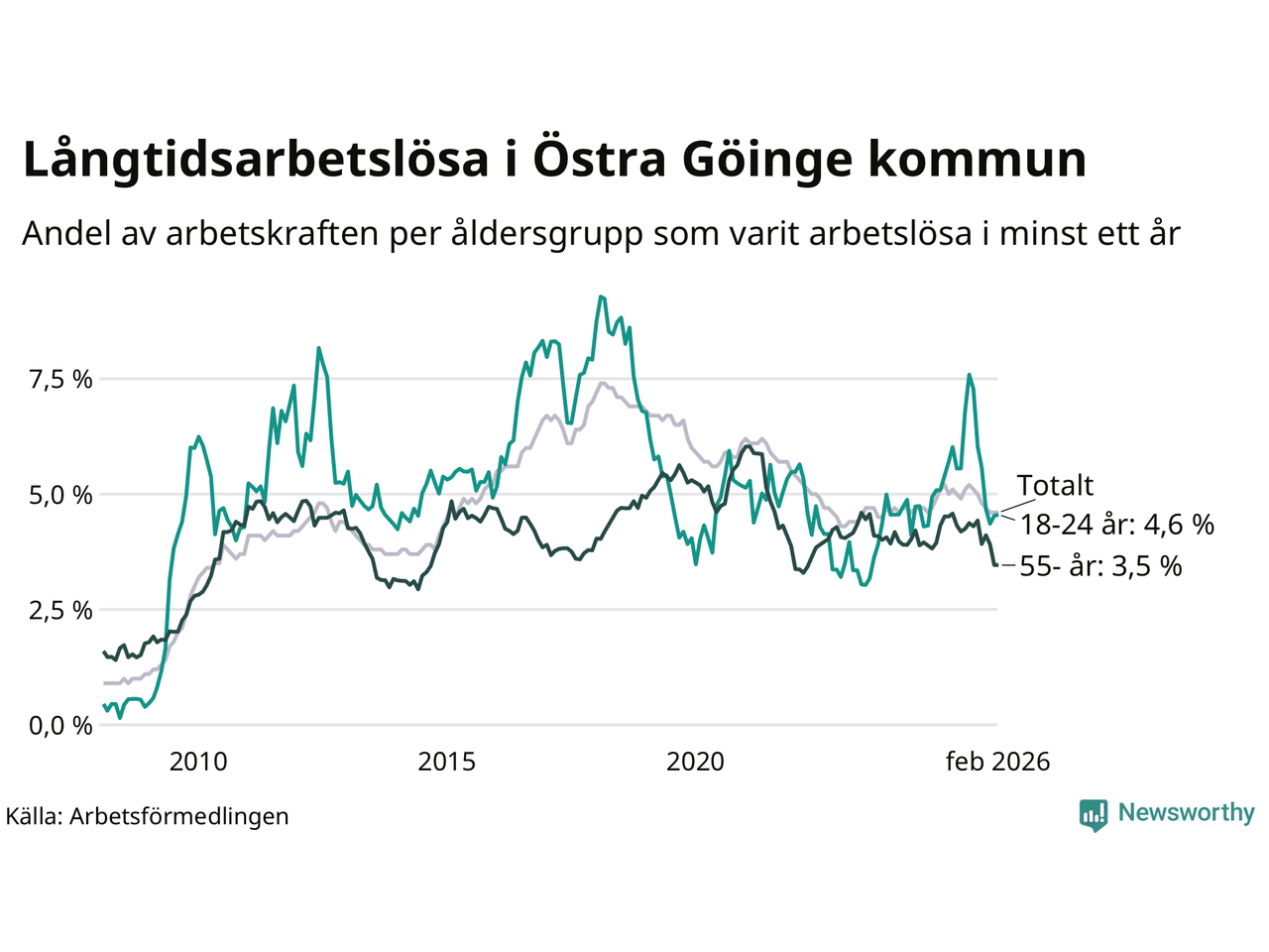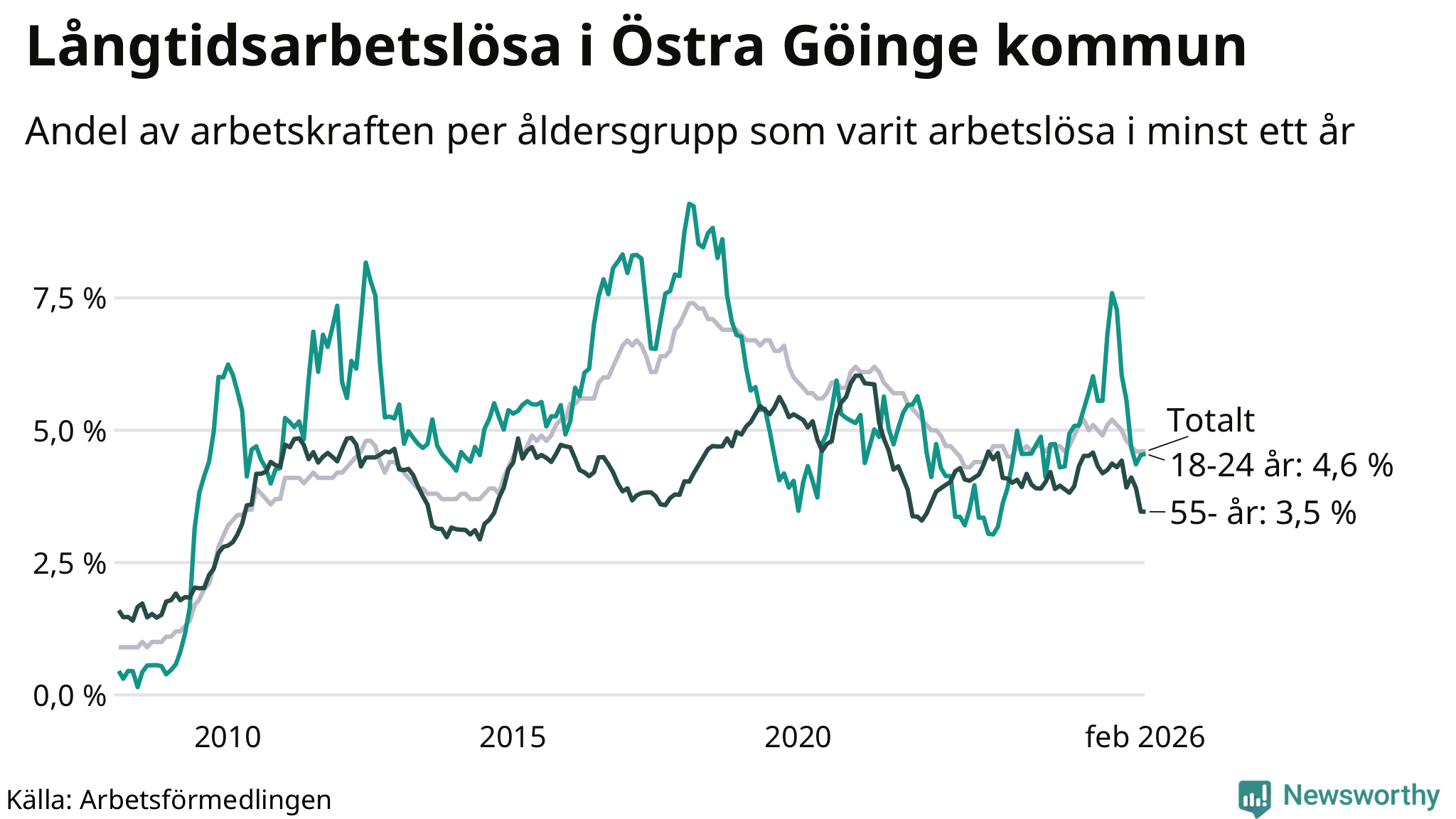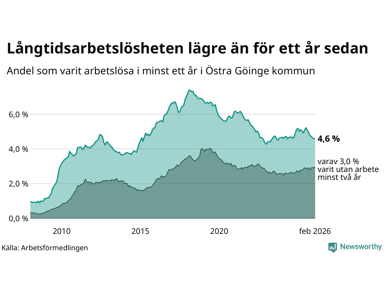 | Andel arbetslösa i minst ett år | 4,6 % | 4,0 % | 2,9 % |