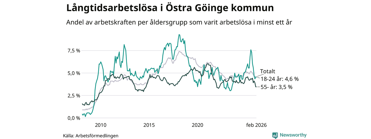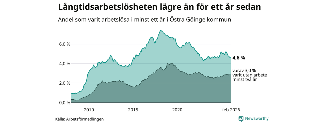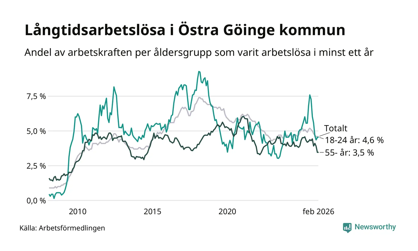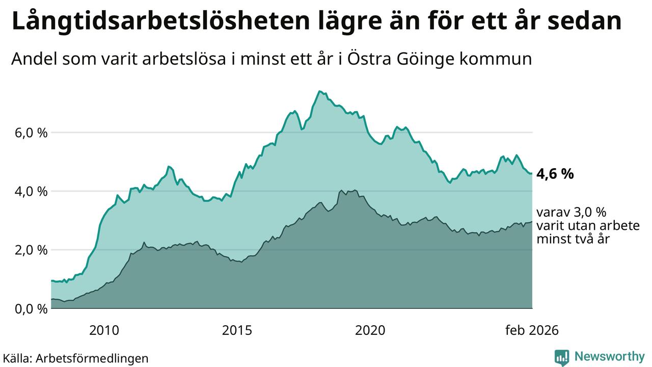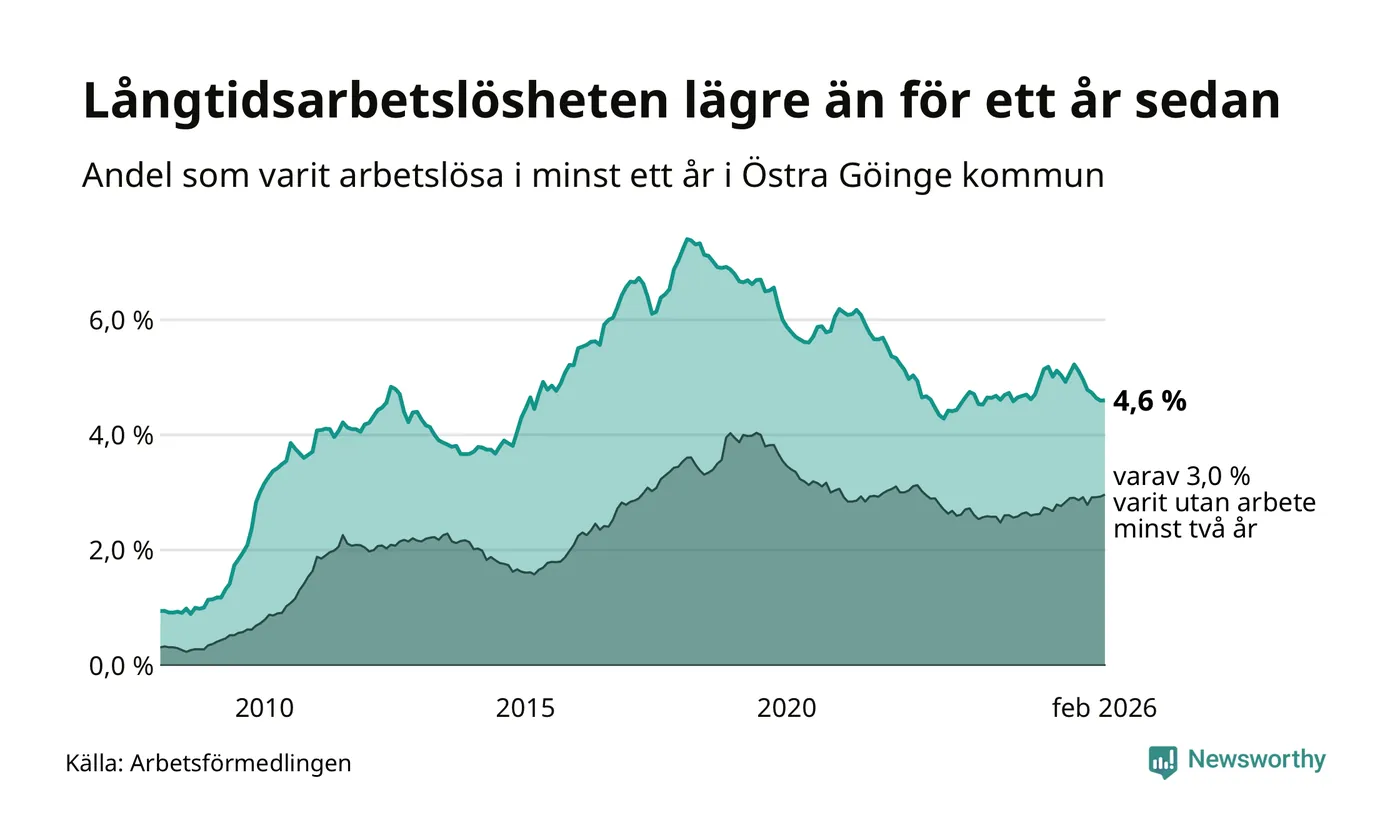 I februari hade 295 Göingebor varit arbetslösa i minst ett år, vilket är lika många som månaden innan. Det är den sjunde månaden i rad med minskande eller oförändrat antal långtidsarbetslösa. 295 personer motsvarar 4,6 procent av arbetskraften i kommunen – andelen långtidsarbetslösa är 0,4 procentenheter lägre än samma månad för ett år sedan. Östra Göinge tillhör de kommuner som har högst andel långtidsarbetslösa i hela landet just nu.