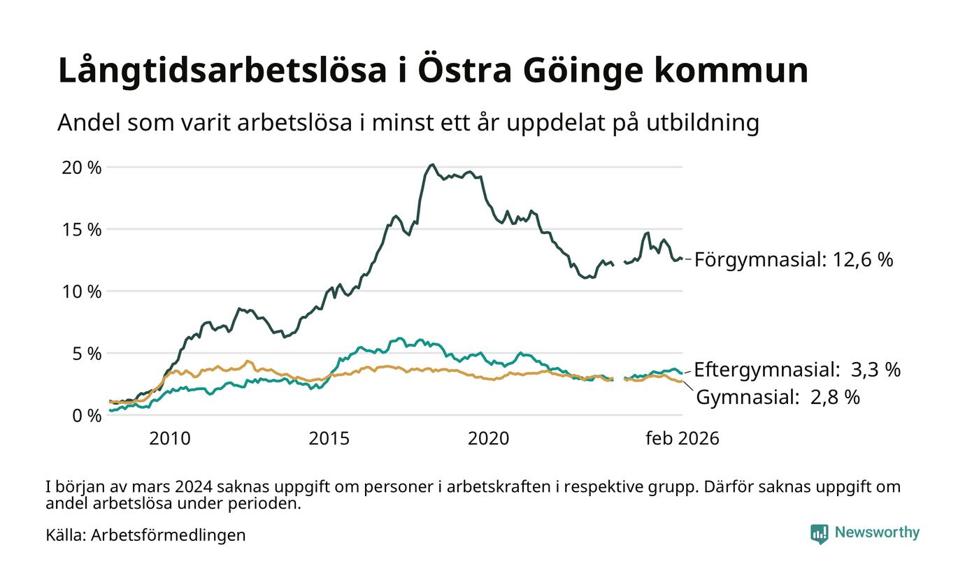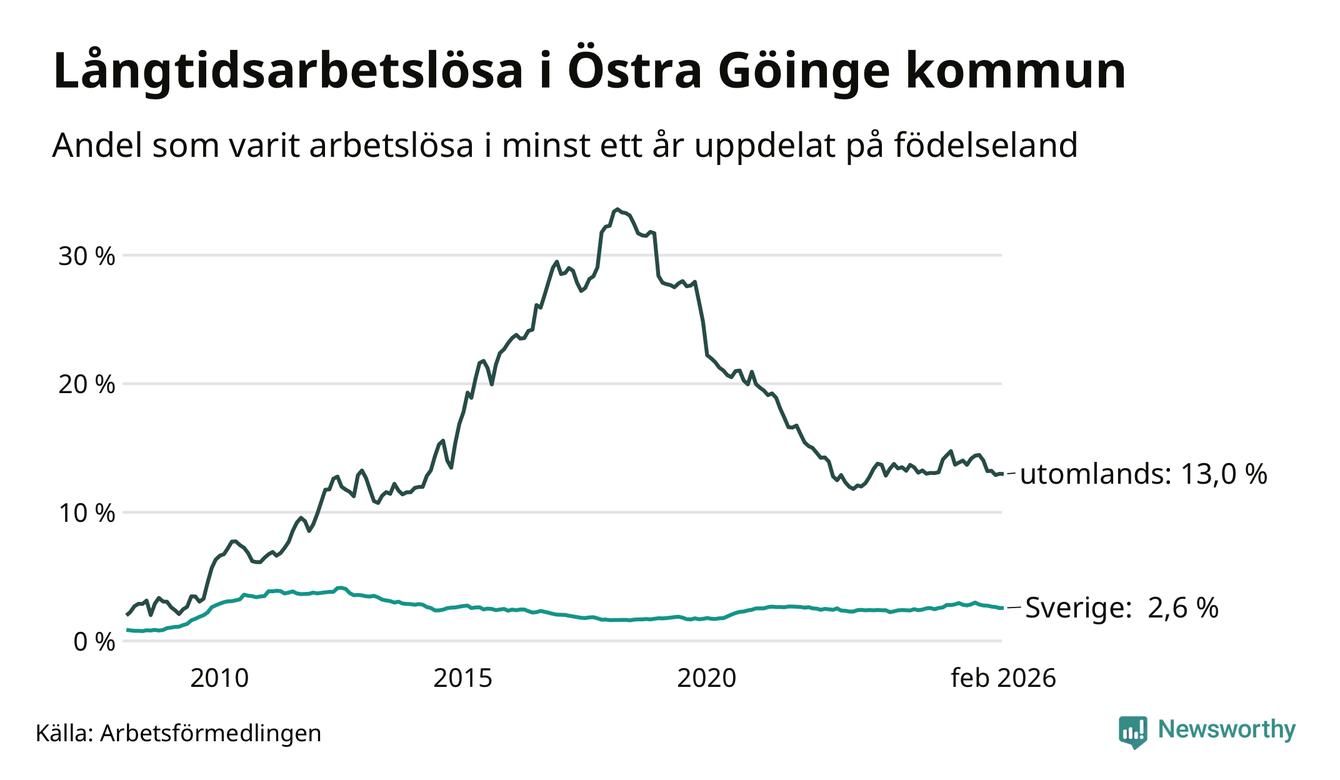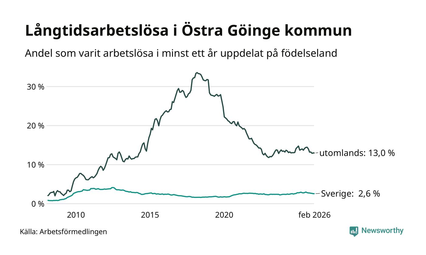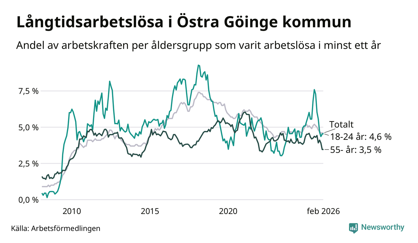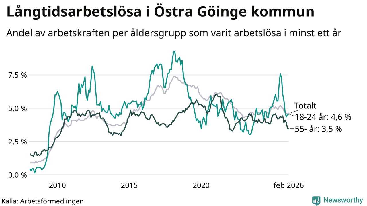 I februari hade 295 Göingebor varit arbetslösa i minst ett år, vilket är lika många som månaden innan. Det är den sjunde månaden i rad med minskande eller oförändrat antal långtidsarbetslösa. 295 personer motsvarar 4,6 procent av arbetskraften i kommunen – andelen långtidsarbetslösa är 0,4 procentenheter lägre än samma månad för ett år sedan. Östra Göinge tillhör de kommuner som har högst andel långtidsarbetslösa i hela landet just nu.
