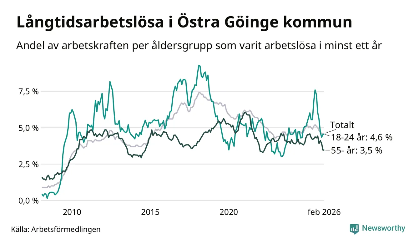 Av de 295 personerna som varit arbetslösa i mer än ett år i Östra Göinge kommun är 55 personer mellan 55 och 661 år och 29 är mellan 18 och 24 år.