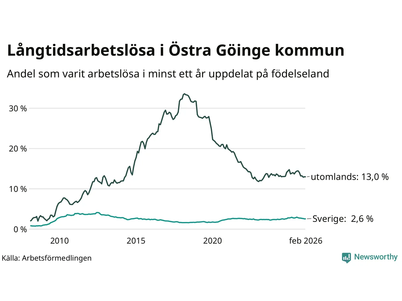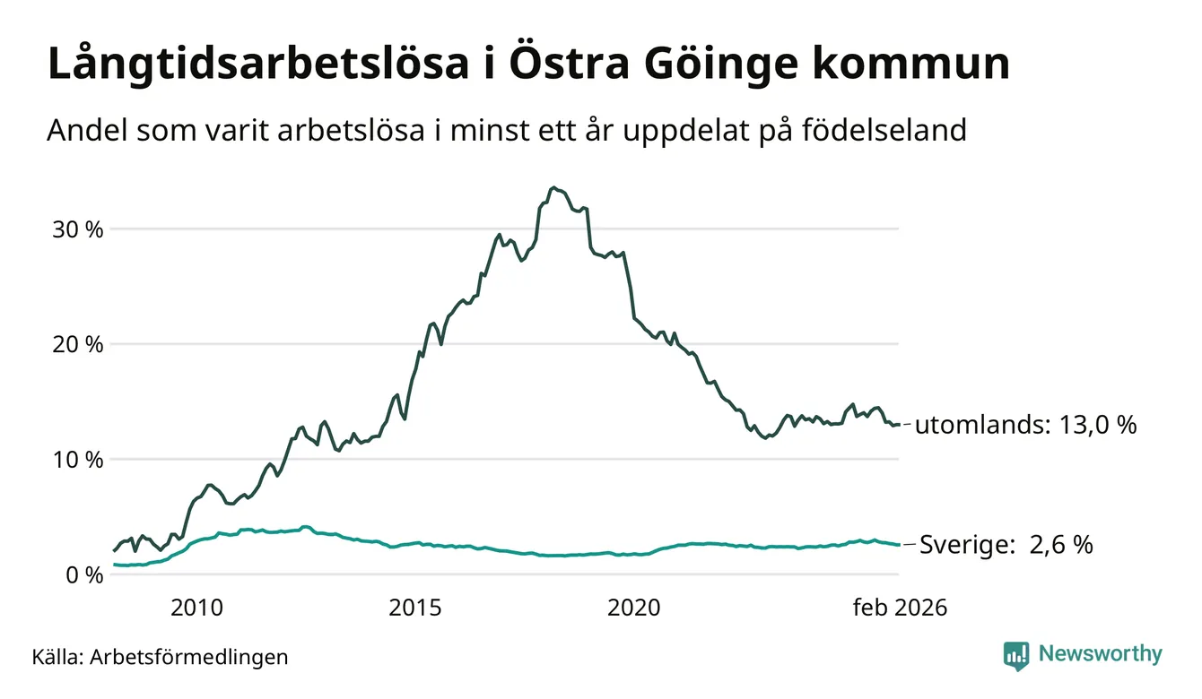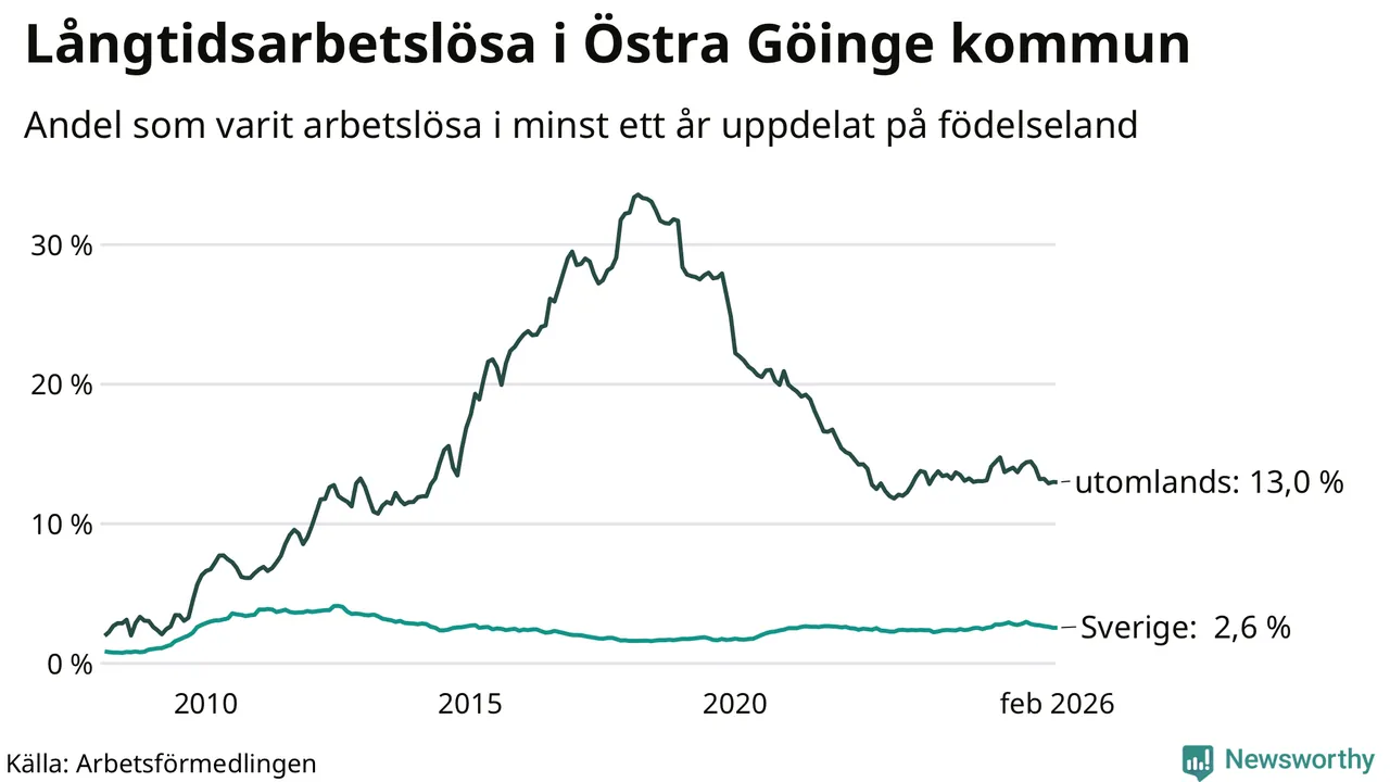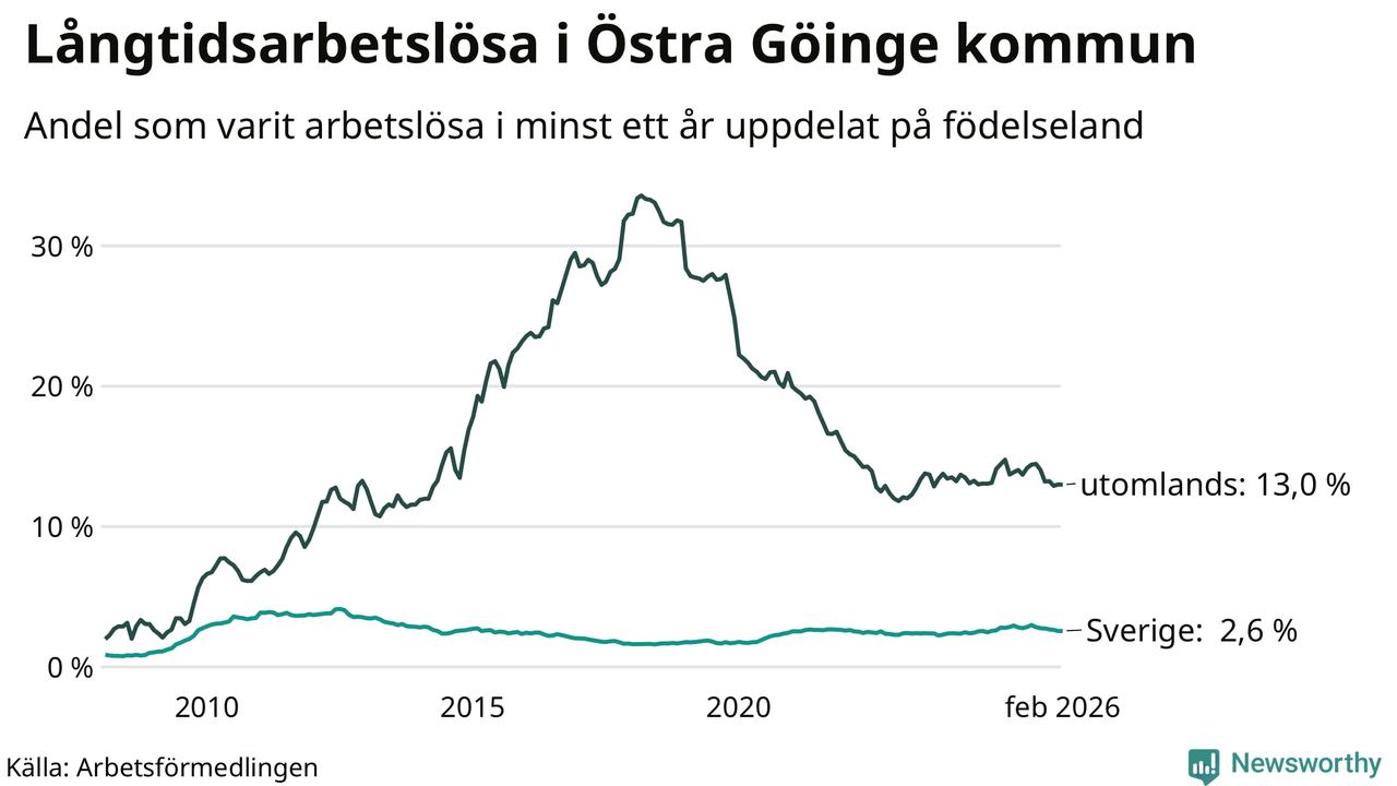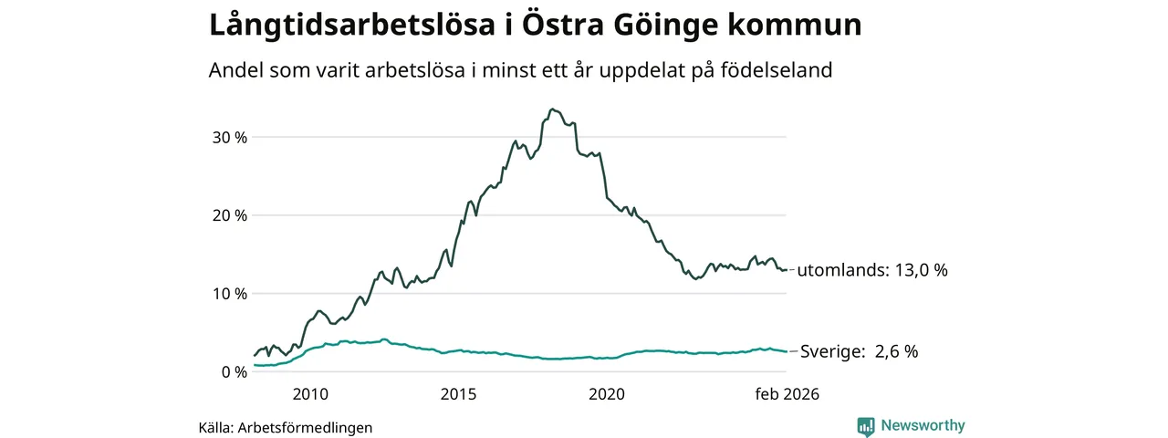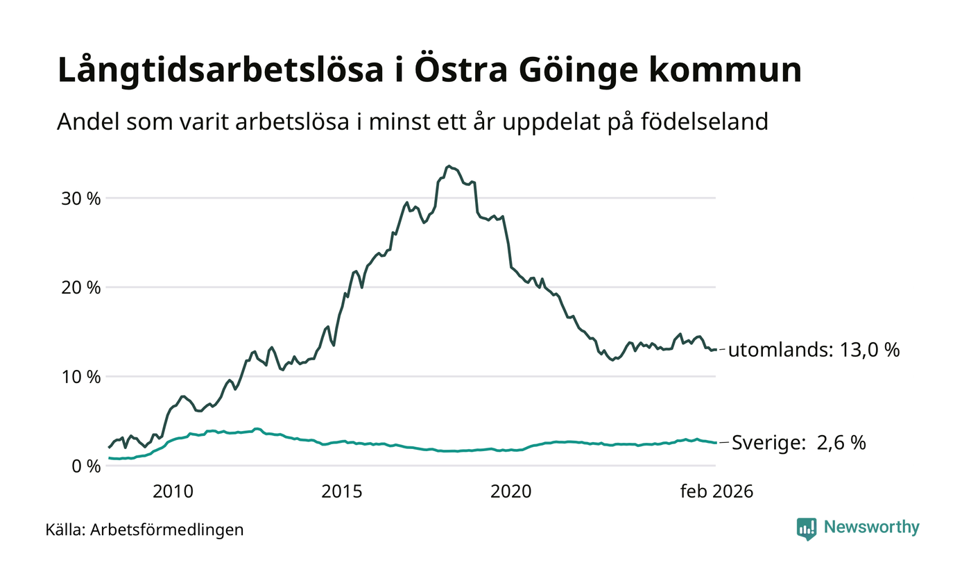 132 av de långtidsarbetslösa i Östra Göinge är födda i Sverige, medan 163 är födda utomlands. Det innebär att långtidsarbetslösheten bland Sverigefödda är 2,6 procent, medan den är fem gånger så hög – 13,0 procent – bland födda utomlands. Även i riket som helhet är arbetslösheten högre bland utrikesfödda.