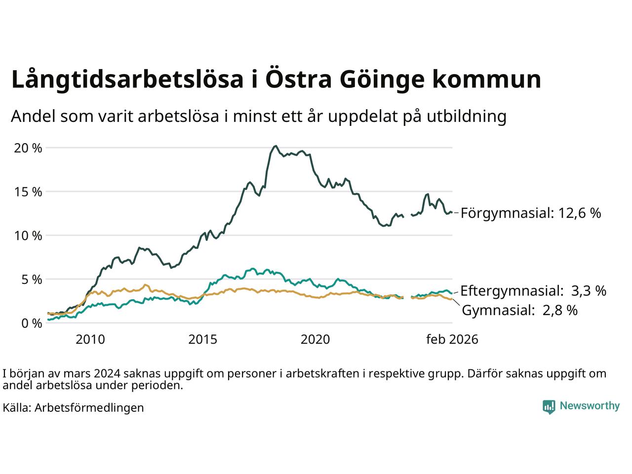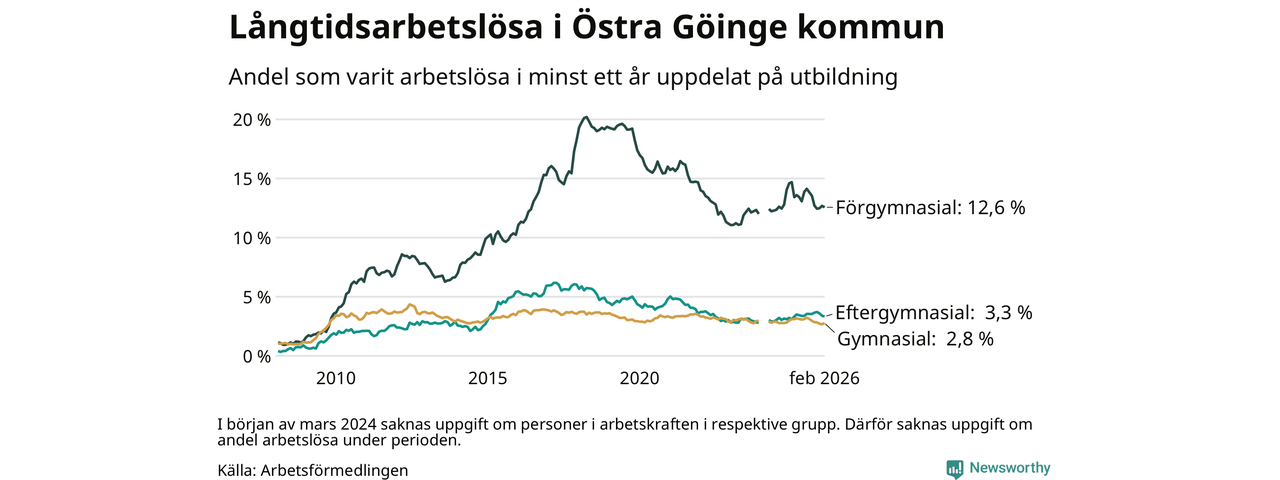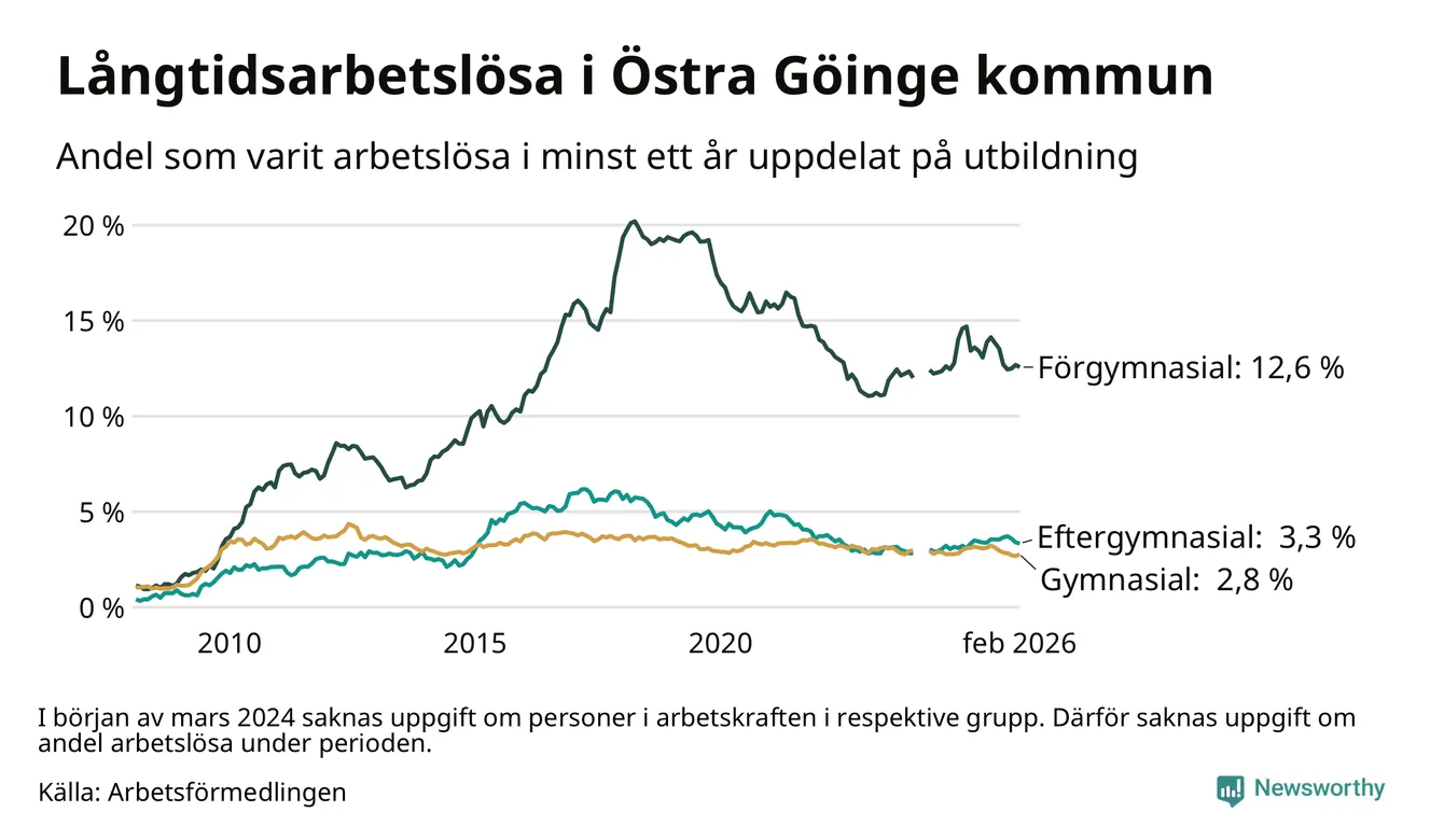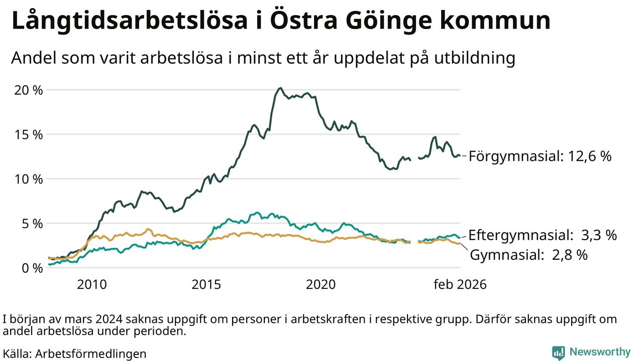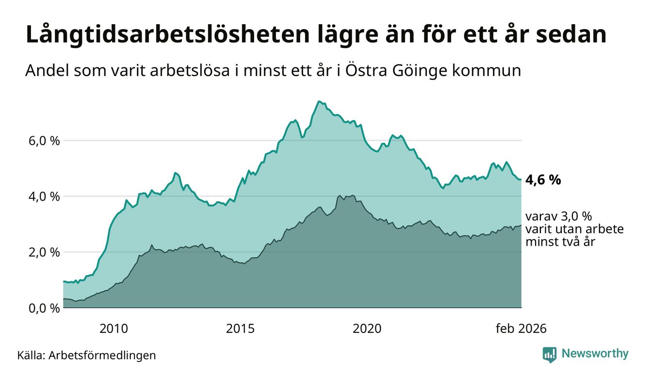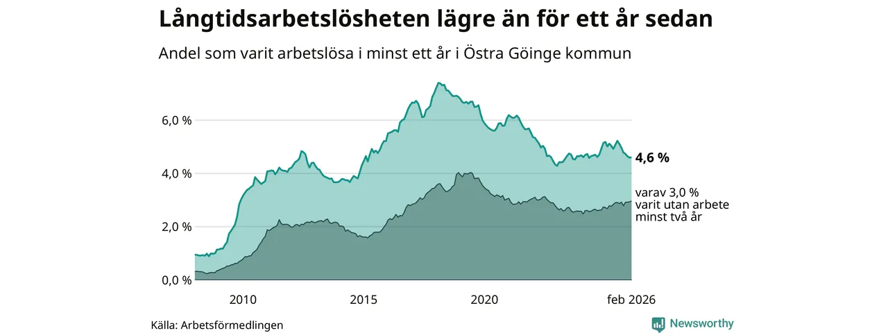 Andelen som varit utan arbete i minst ett år i Östra Göinge var lägre i februari jämfört med samma månad för ett år sedan. Det visar Arbetsfömedlingens senaste månadsstatistik.