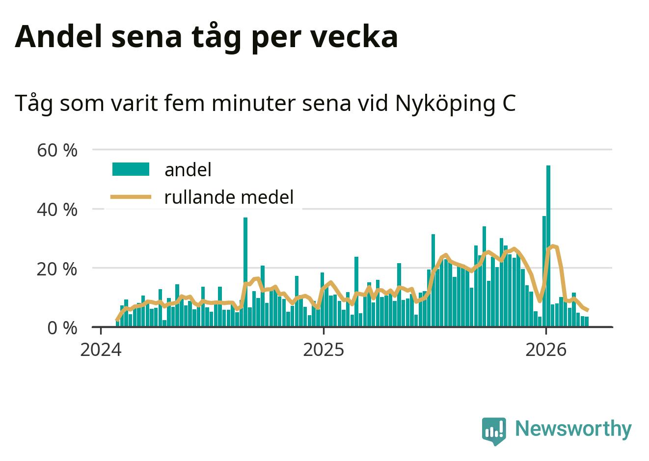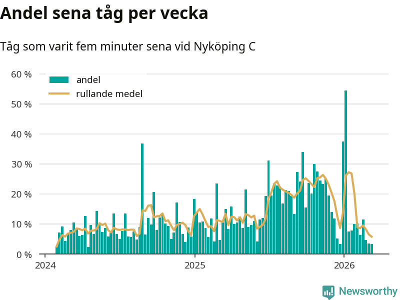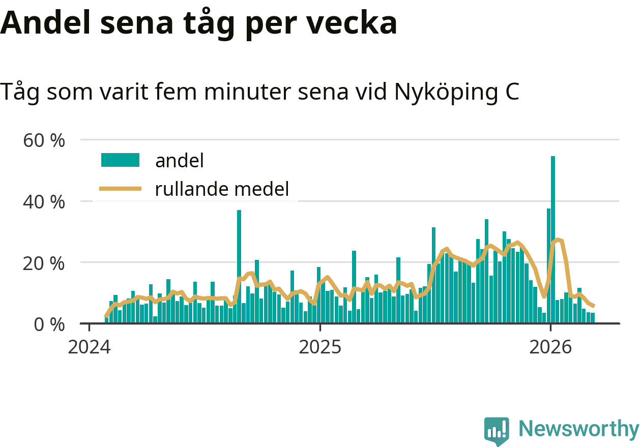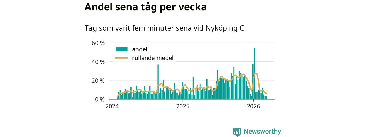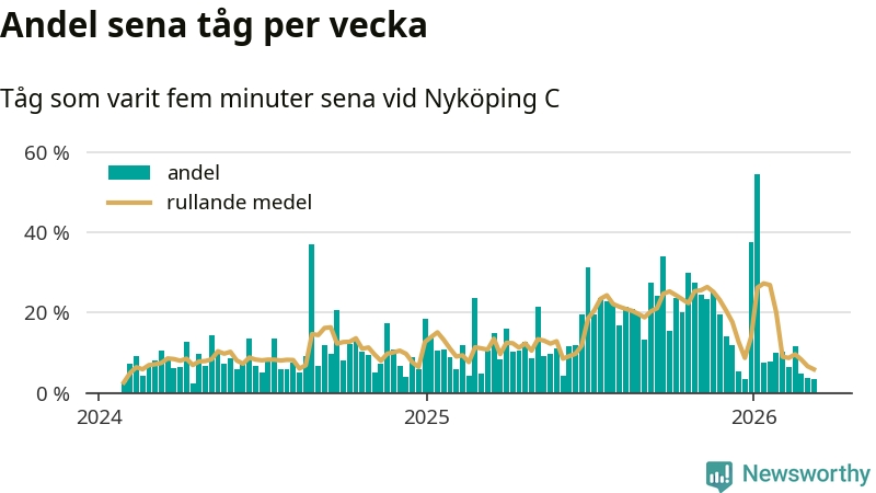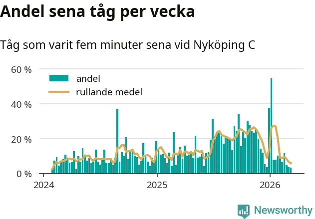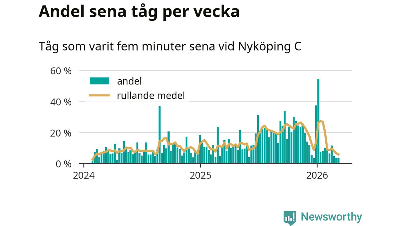 Förra veckan var andelen sena tåg den lägsta vid Nyköping C sedan mitten av april 2024. Bara tre procent av tågen var sena.