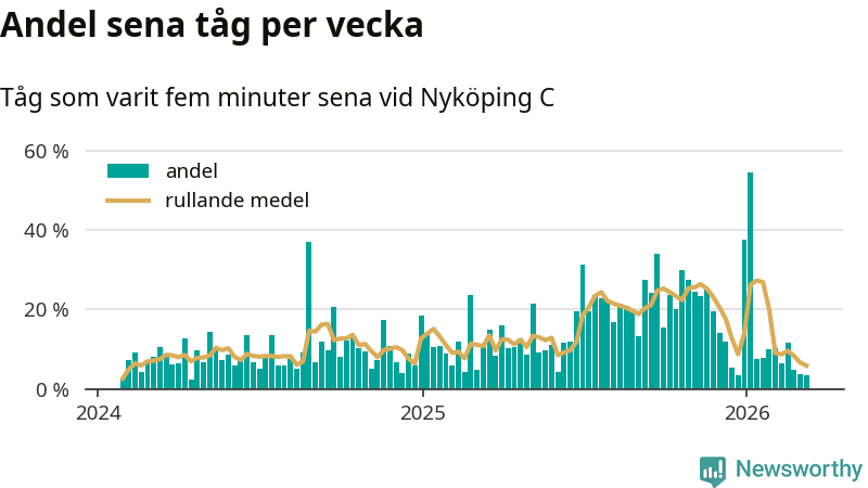 Bara tre procent av tågen var sena när de passerade Nyköping C under vecka 11. Det är en ovanligt låg siffra. En genomsnittlig vecka är motsvarande siffra 13 procent,