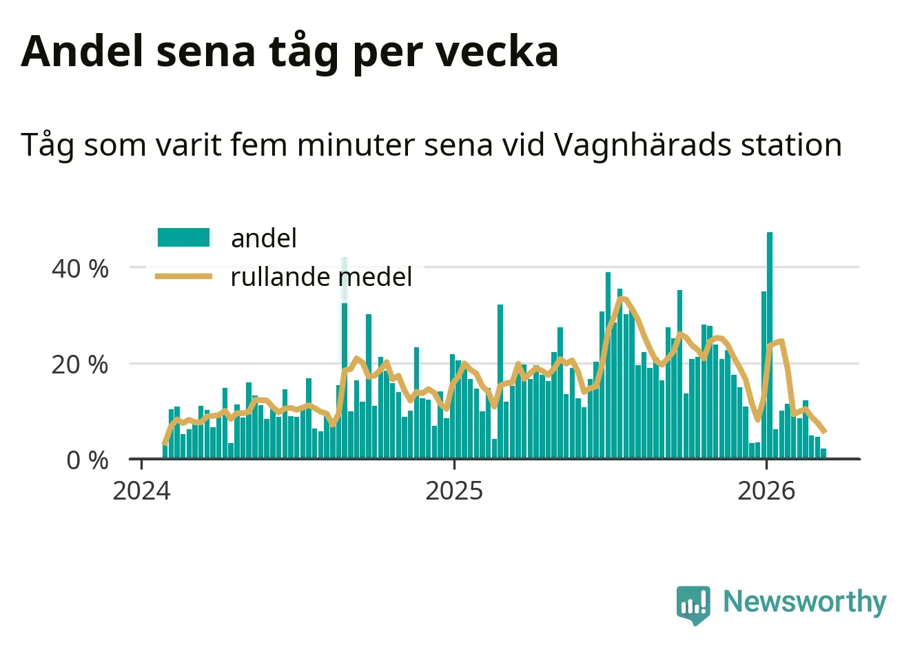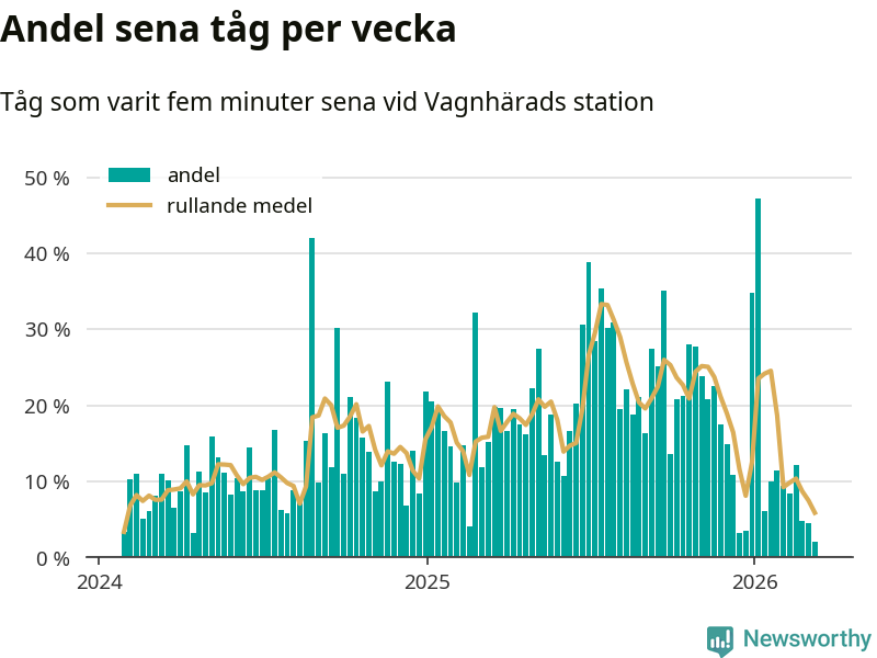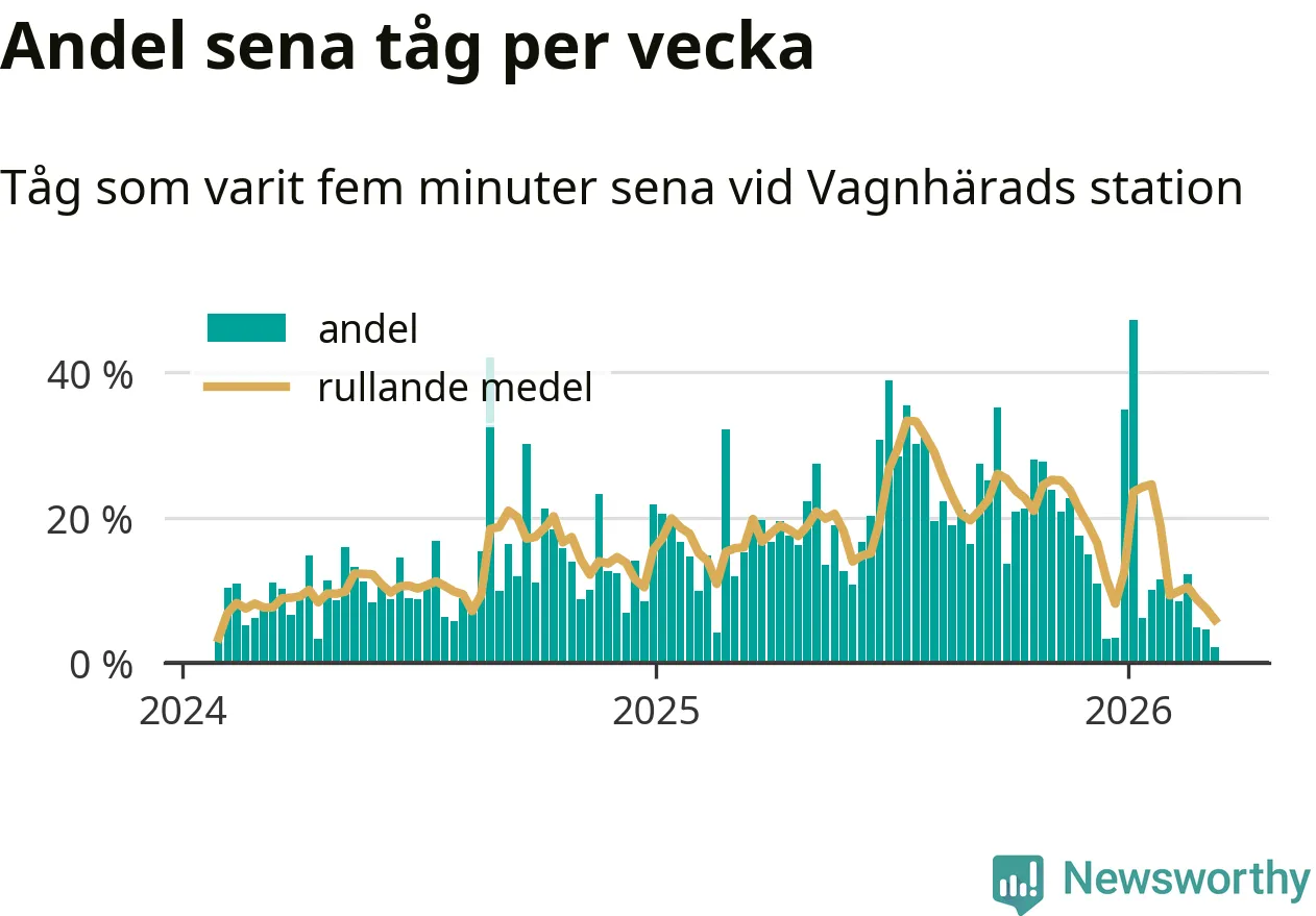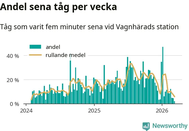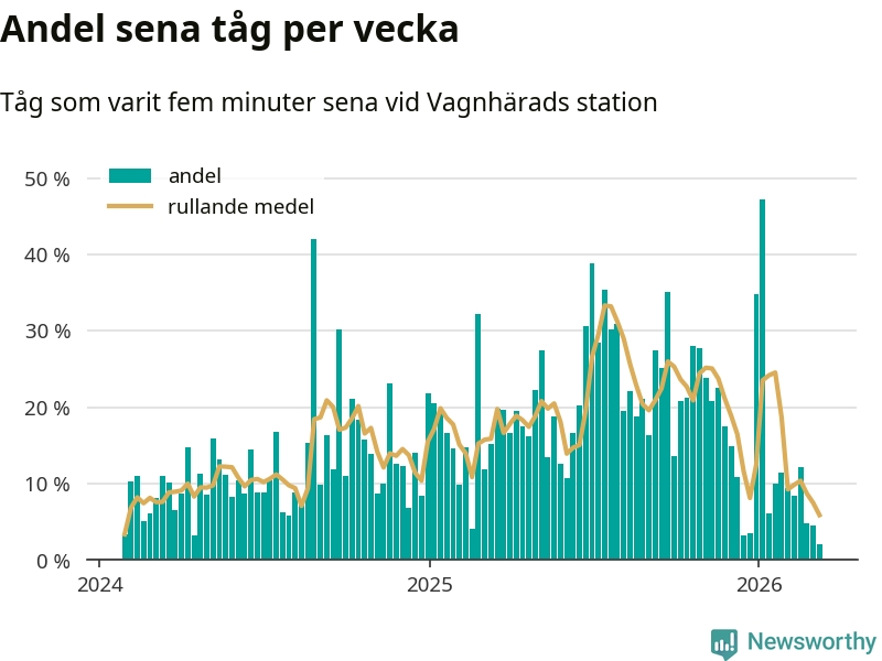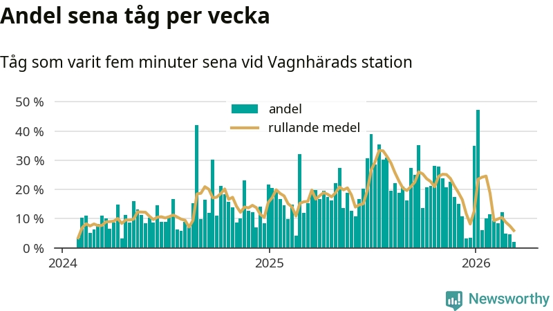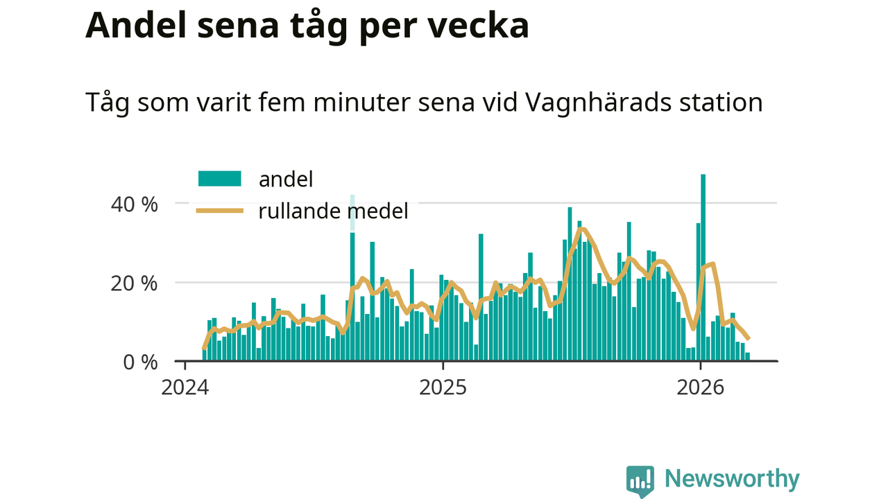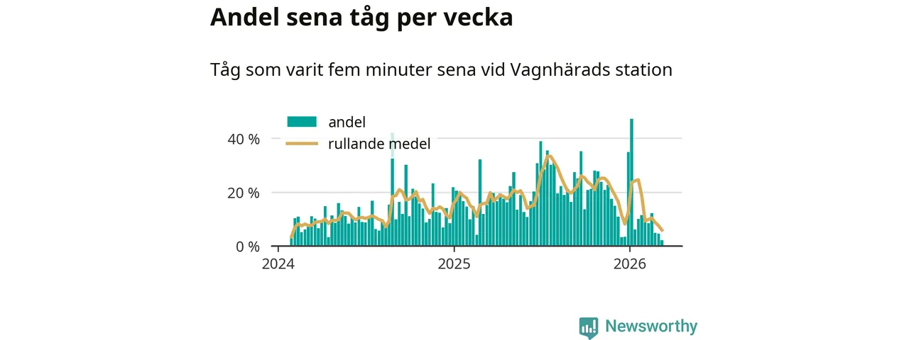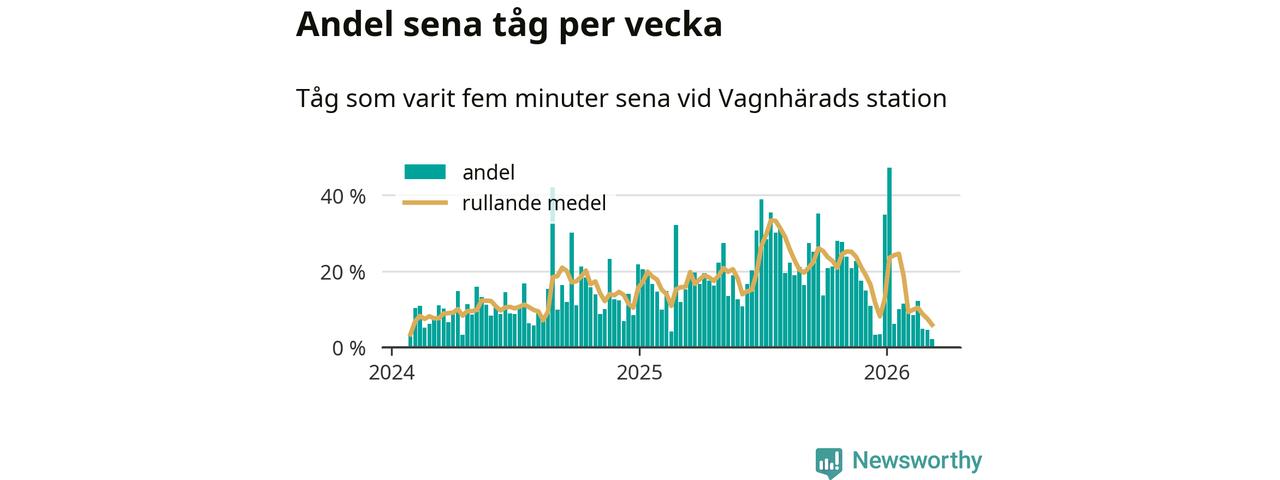 Bara två procent av tågen var sena när de passerade Vagnhärads station under vecka 11. Det är en ovanligt låg siffra. En genomsnittlig vecka är motsvarande siffra 16 procent, baserat på data som Newsworthy har samlat in sedan början av 2024.