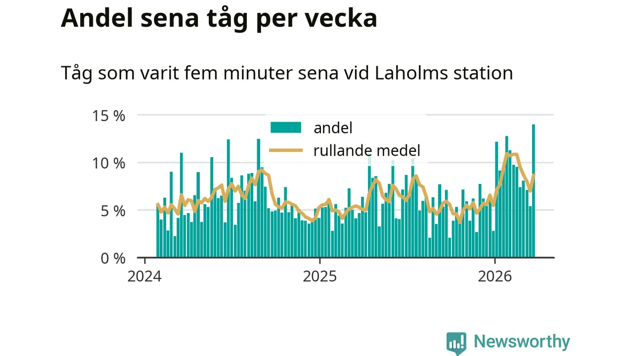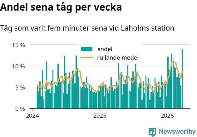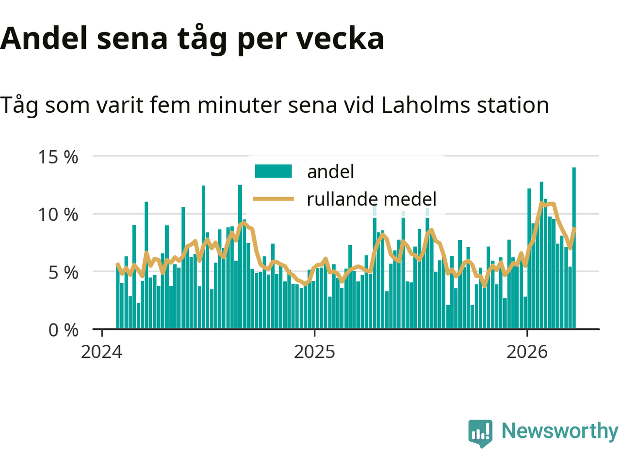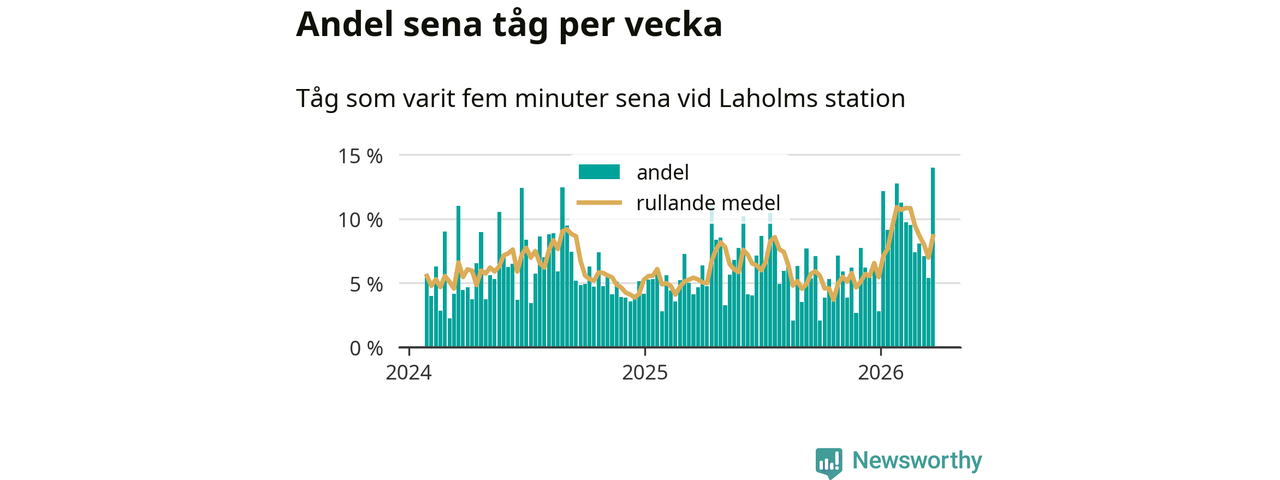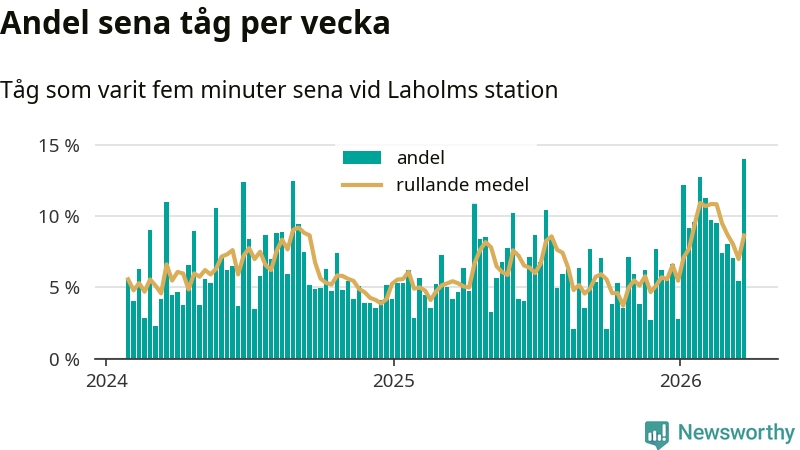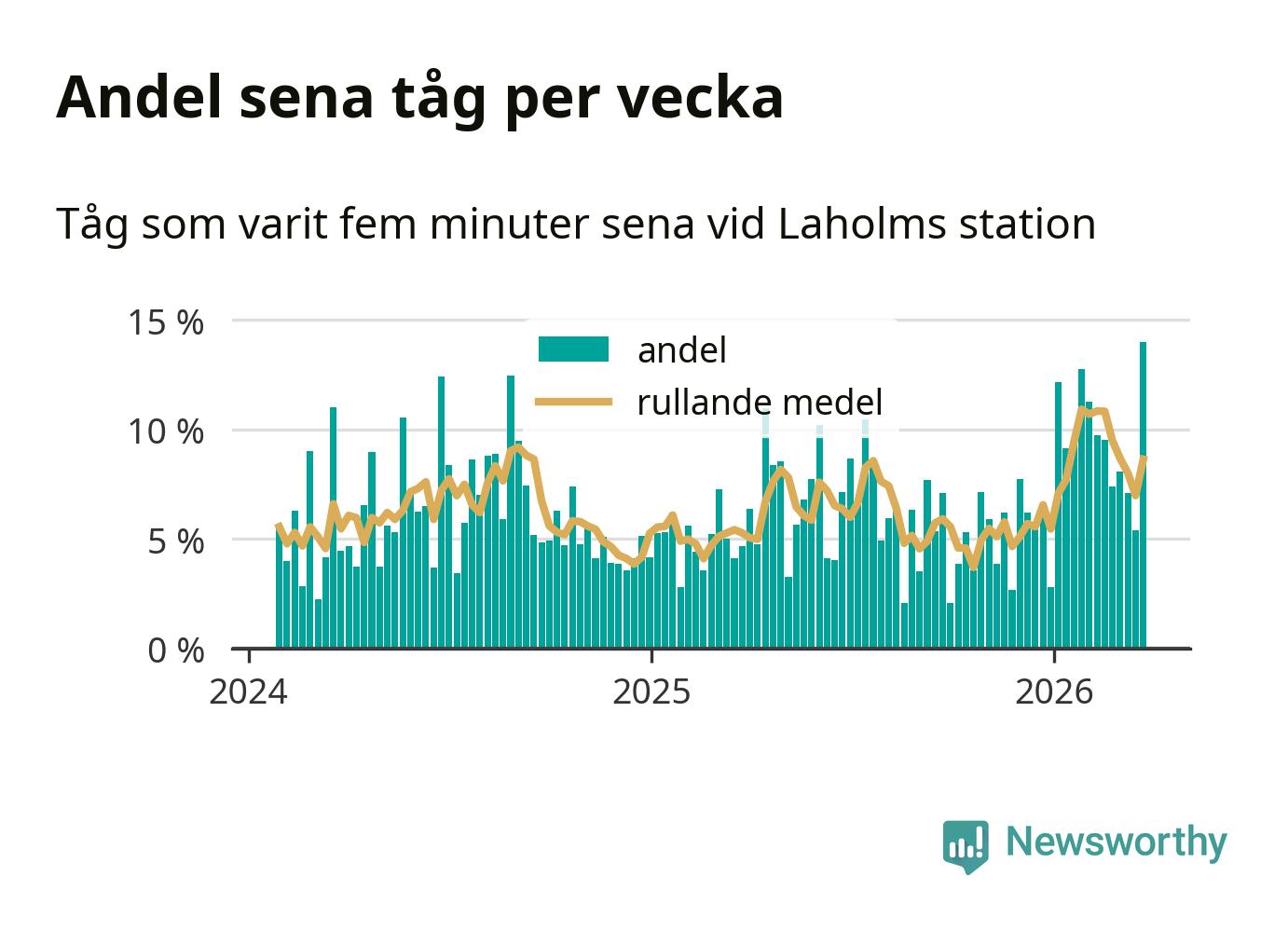 14 procent av tågen var sena när de passerade Laholms station under vecka 13. Det är fler än vanligt. En genomsnittlig vecka är motsvarande siffra sex procent,