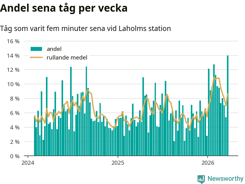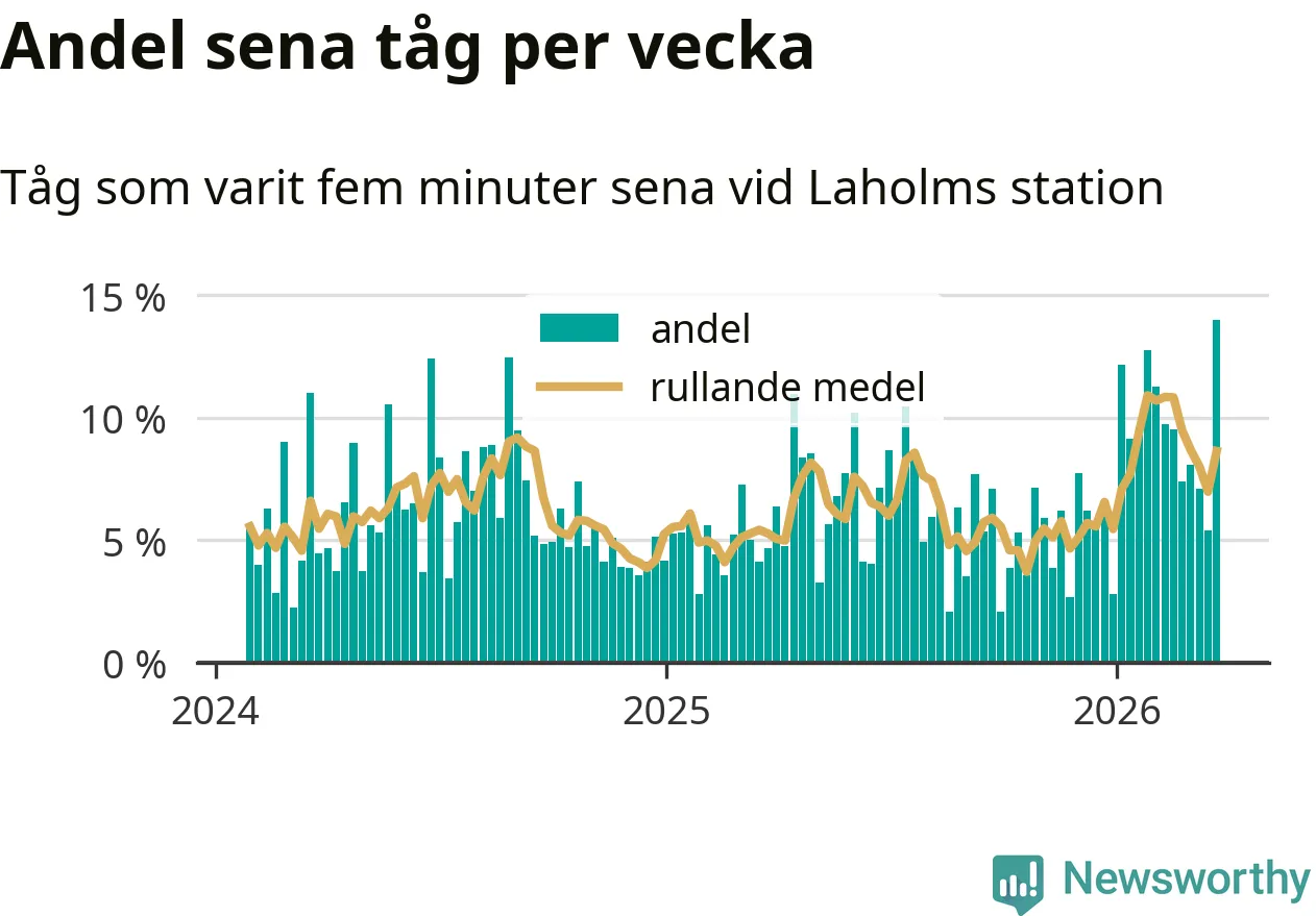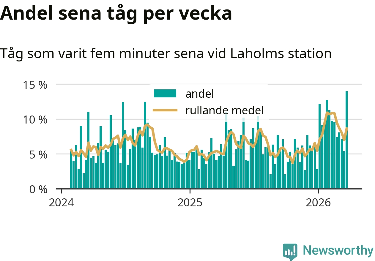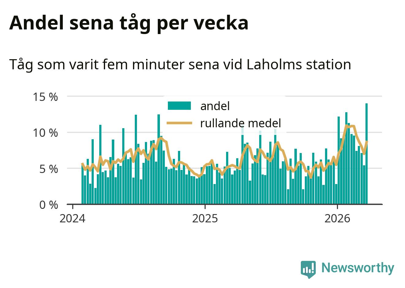 14 procent av tågen var sena när de passerade Laholms station under vecka 13. Det är fler än vanligt. En genomsnittlig vecka är motsvarande siffra sex procent,