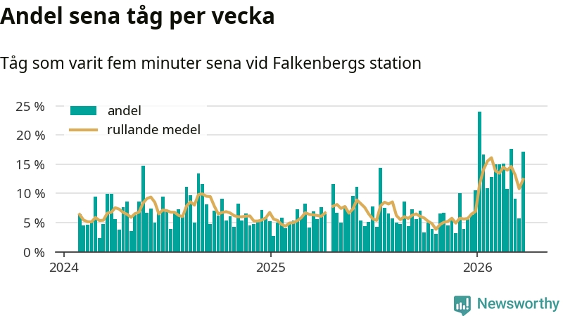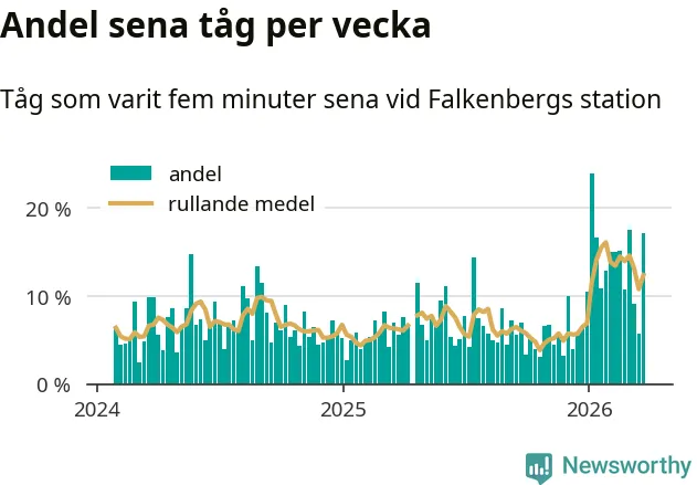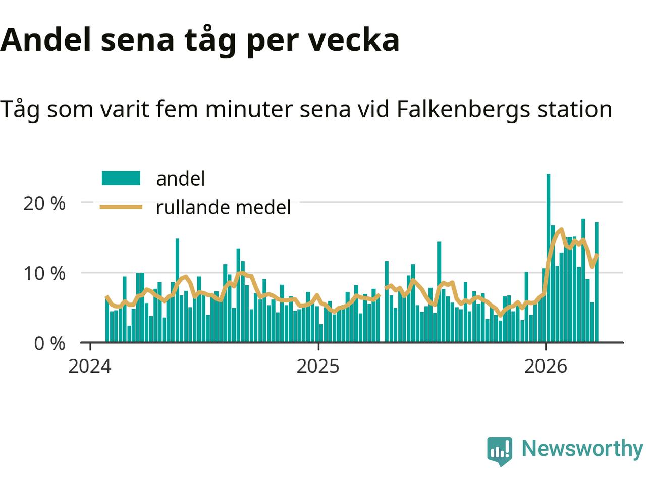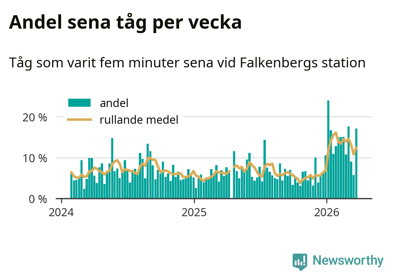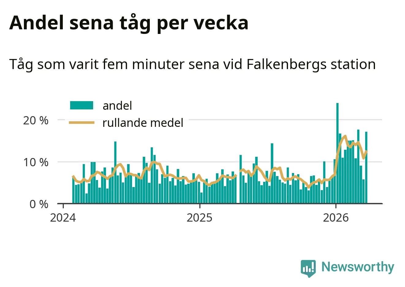 17 procent av tågen var sena när de passerade Falkenbergs station under vecka 13. Det är fler än vanligt. En genomsnittlig vecka är motsvarande siffra sju procent,