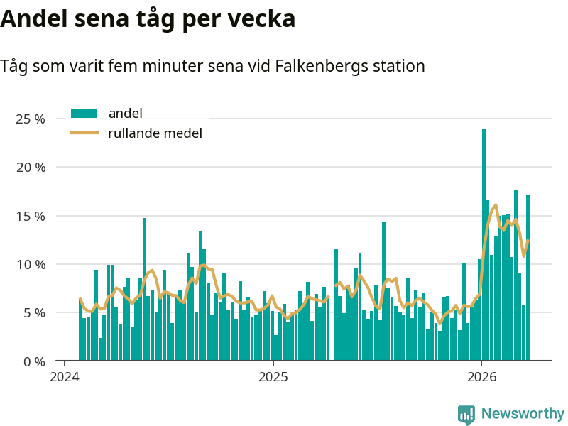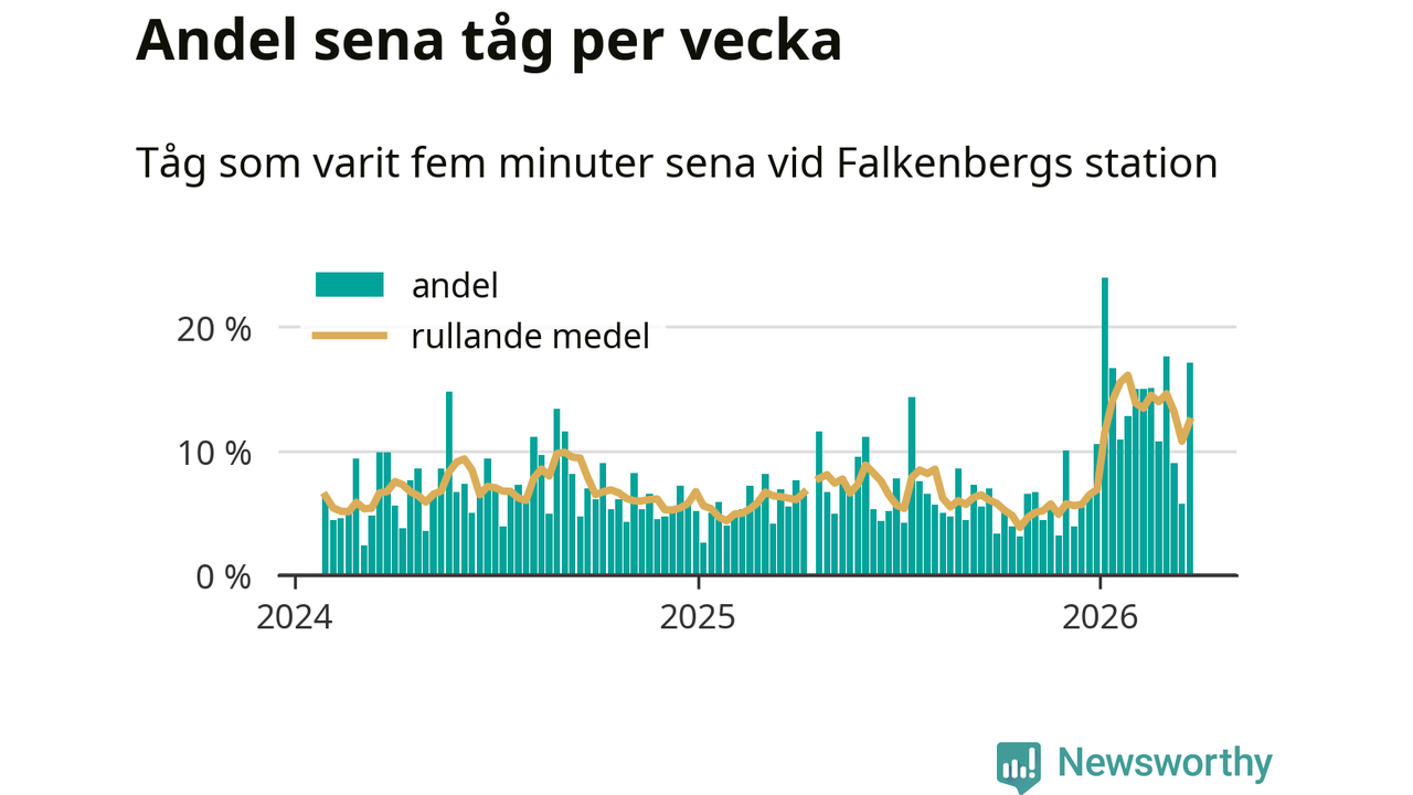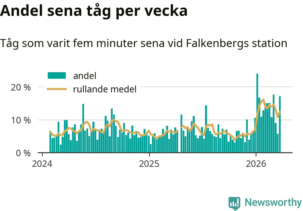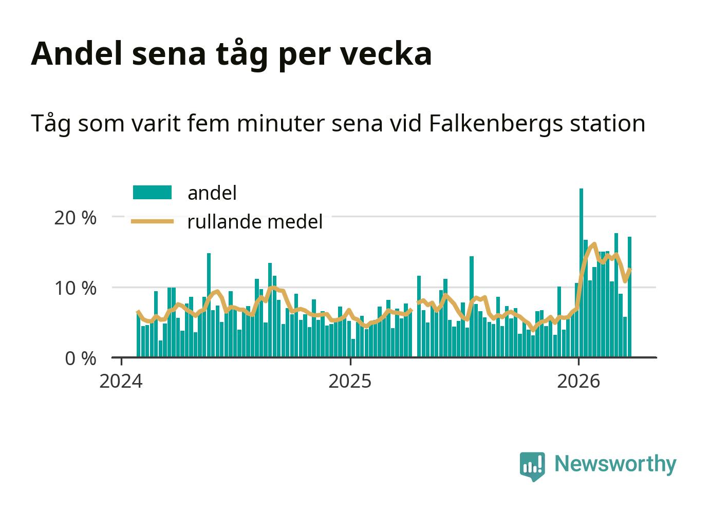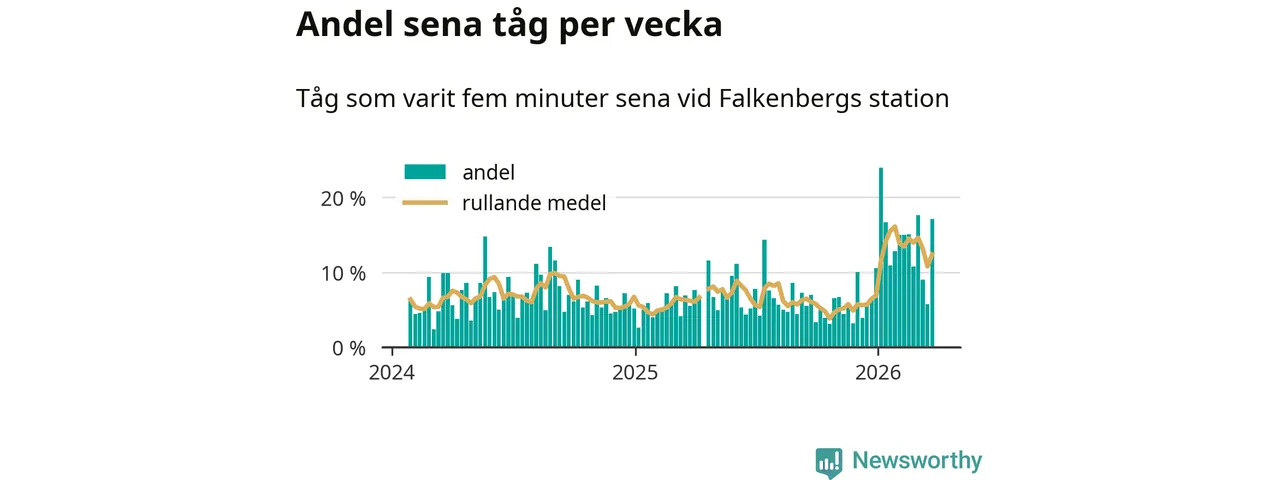17 procent av tågen var sena när de passerade Falkenbergs station under vecka 13. Det är fler än vanligt. En genomsnittlig vecka är motsvarande siffra sju procent,