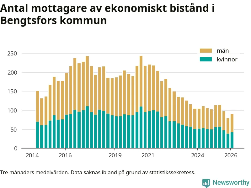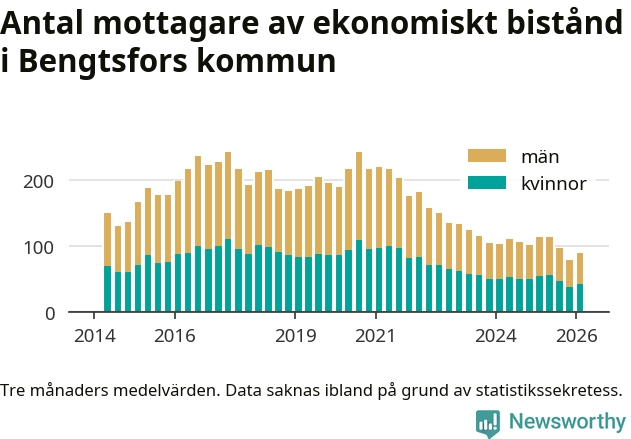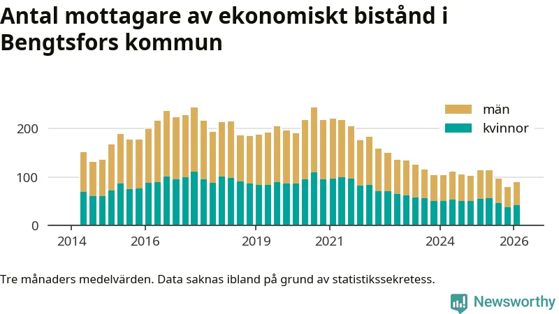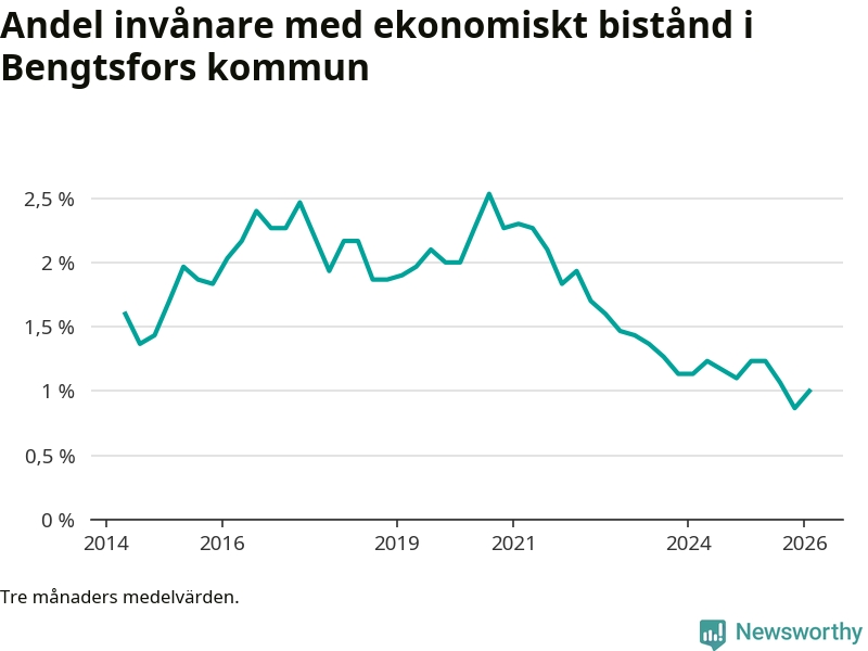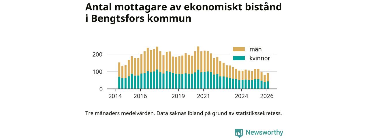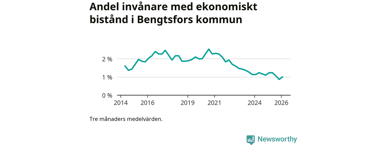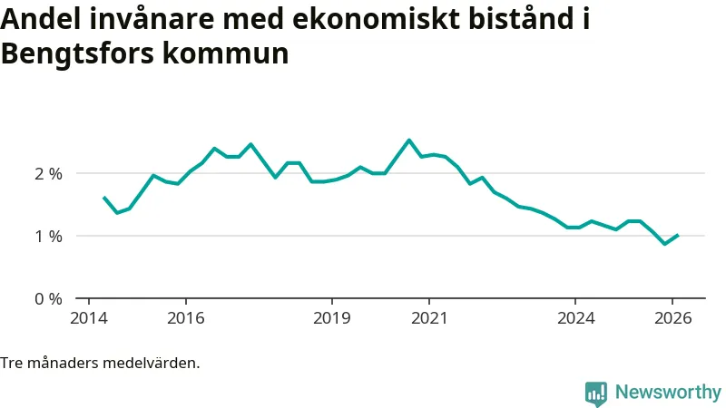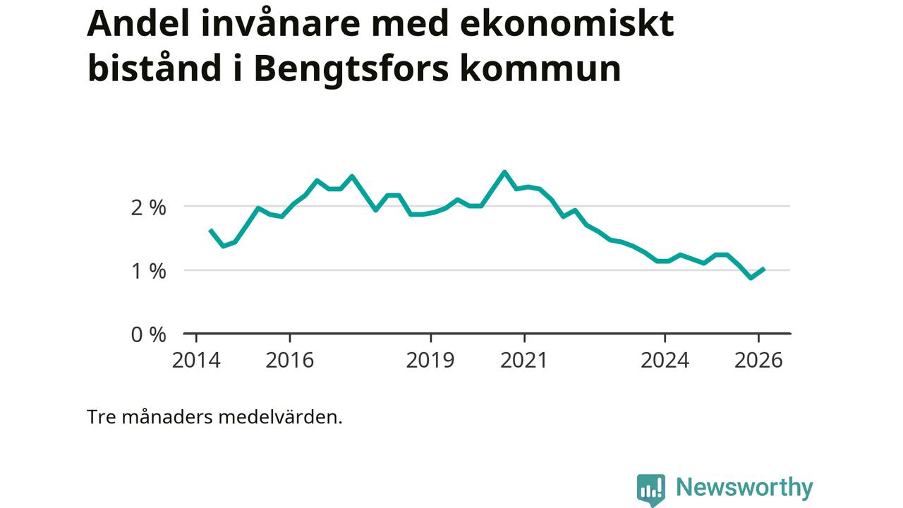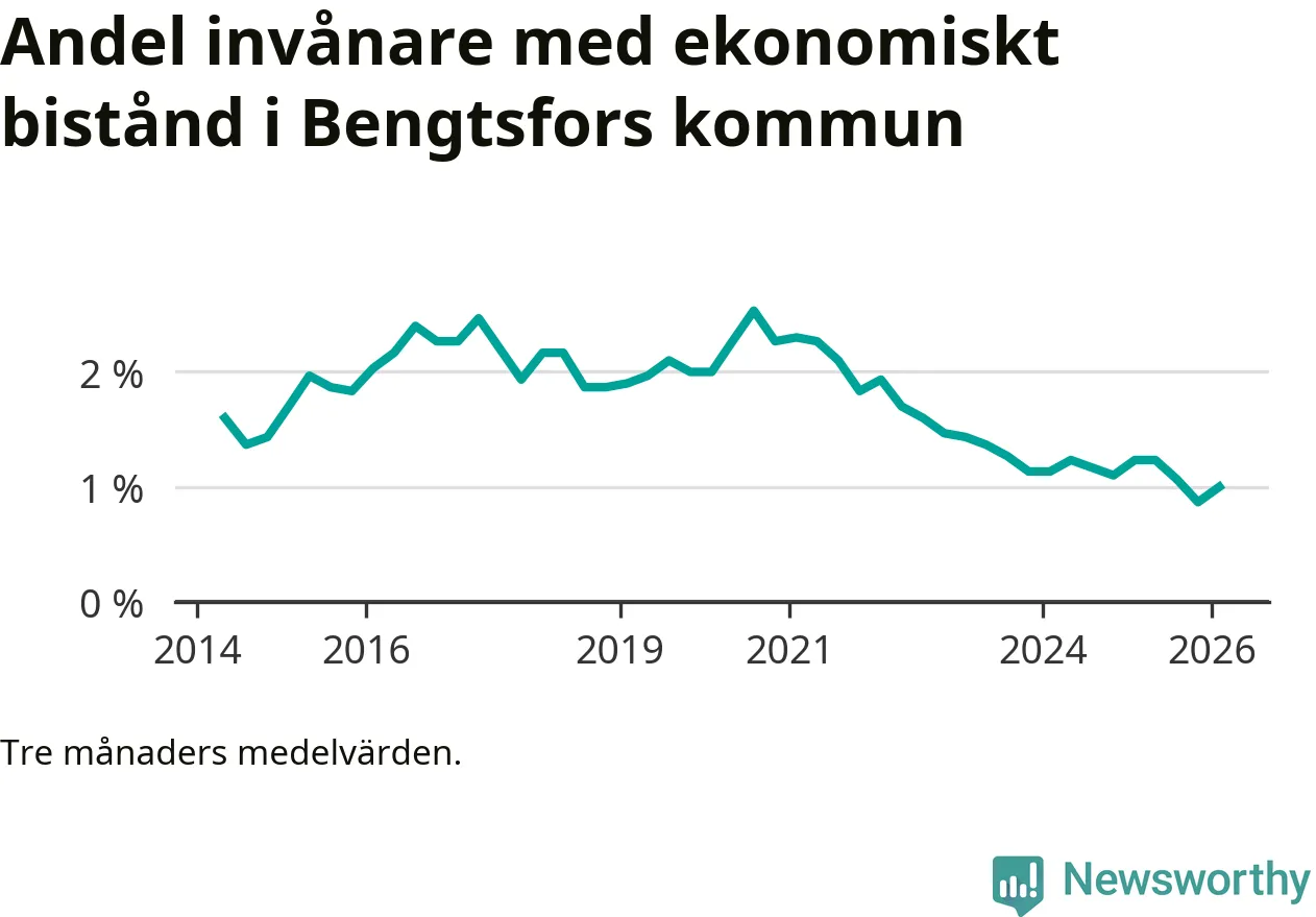 I genomsnitt 90 personer per månad fick ekonomiskt bistånd i Bengtsfors kommun under vintermånaderna (december till februari), vilket motsvarar 1,0 procent av den vuxna befolkningen. Det är en ökning med 0,1 procentenheter eller elva personer jämfört med i höstas, och något mindre andel än under vintern för ett år sedan.