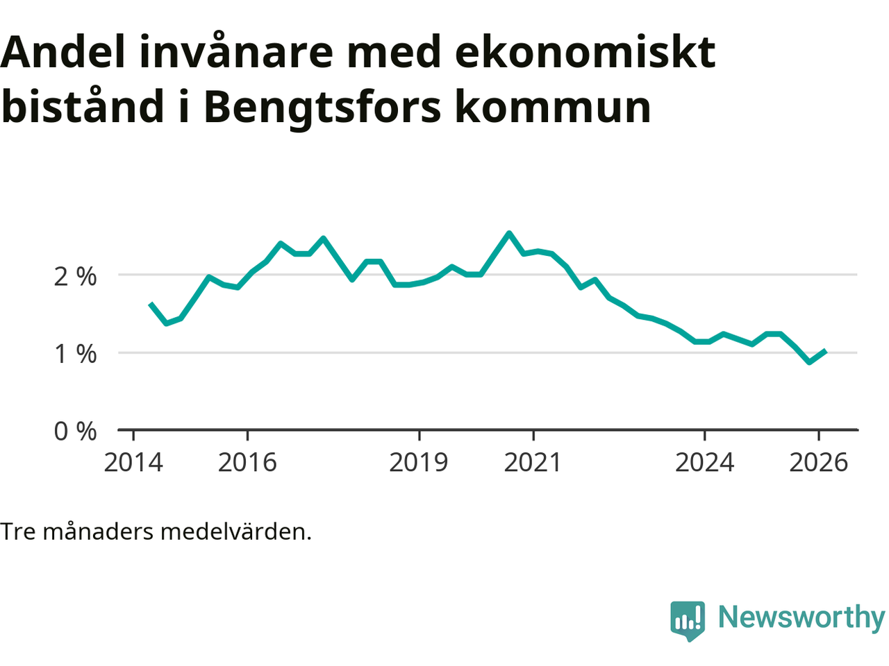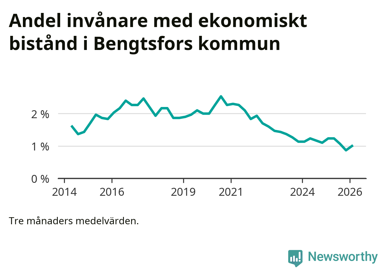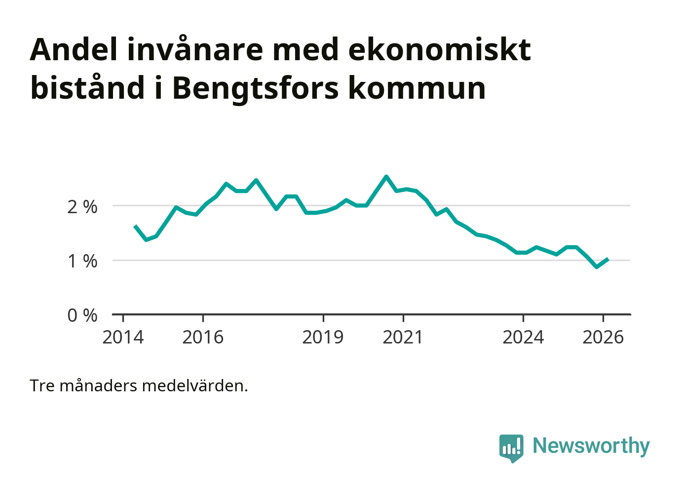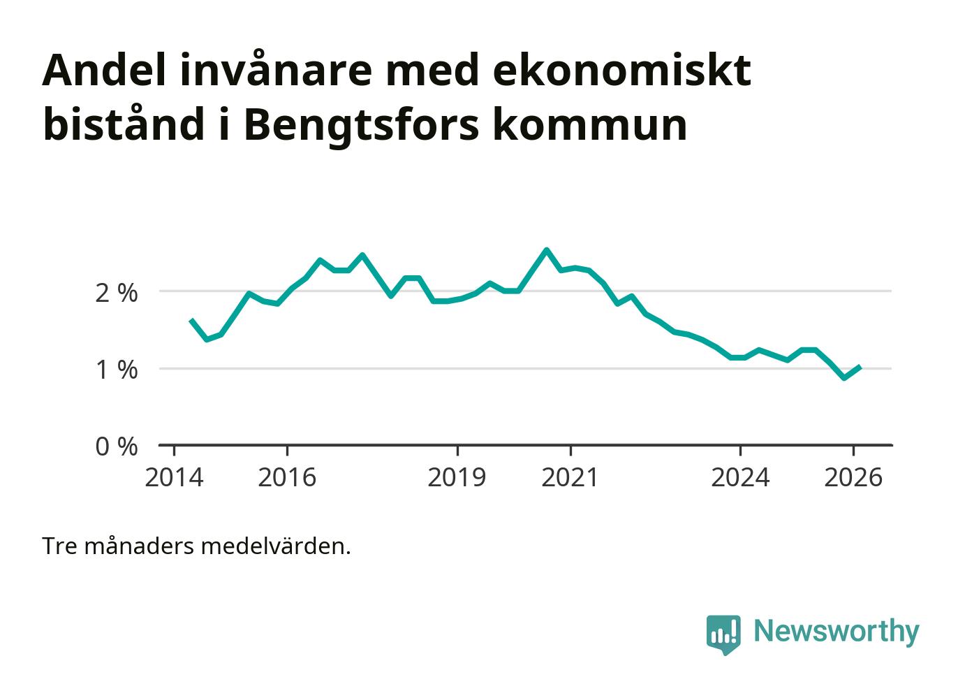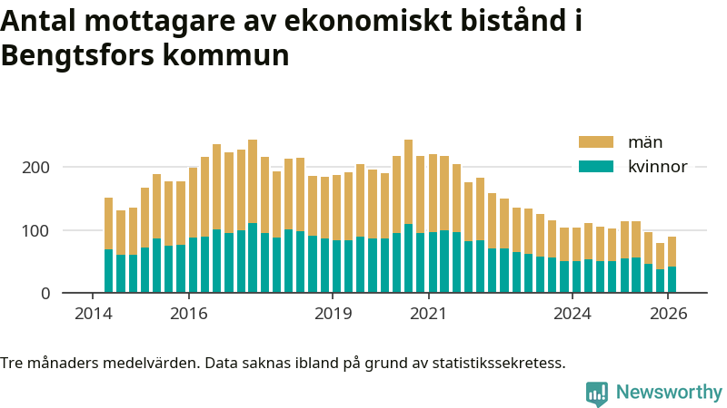 I genomsnitt 90 personer per månad fick ekonomiskt bistånd i Bengtsfors kommun under vintermånaderna (december till februari), vilket motsvarar 1,0 procent av den vuxna befolkningen. Det är en ökning med 0,1 procentenheter eller elva personer jämfört med i höstas, och något mindre andel än under vintern för ett år sedan.