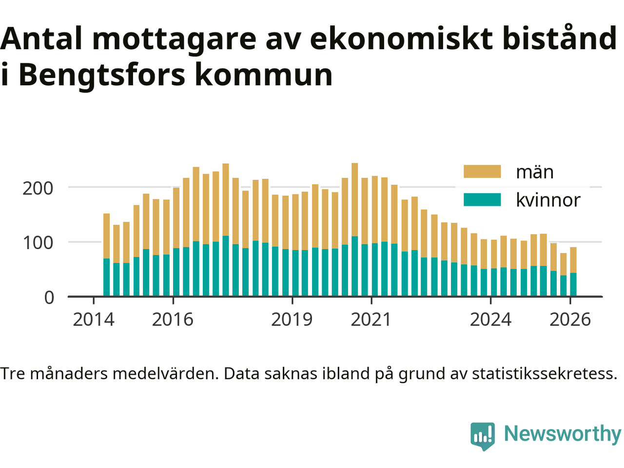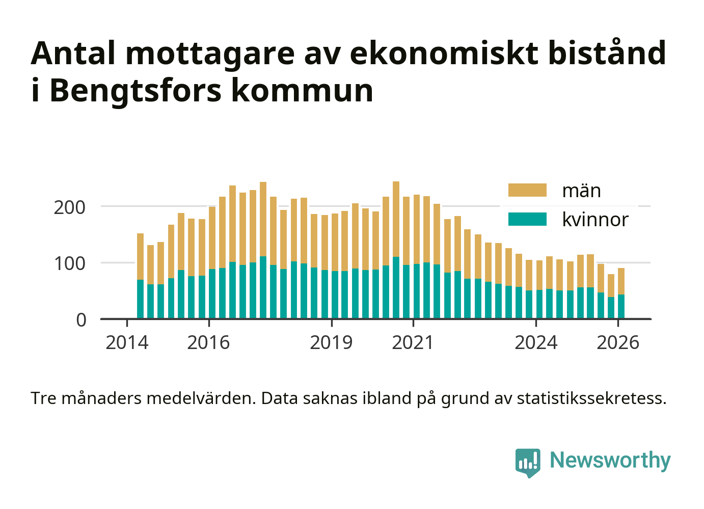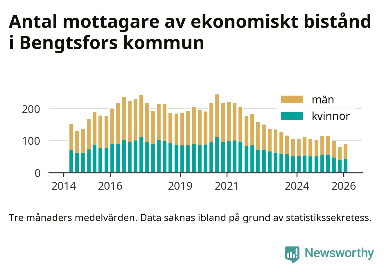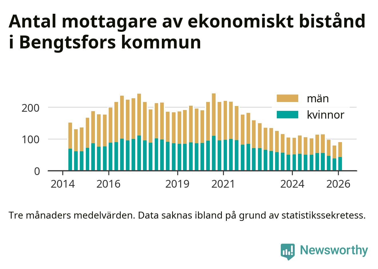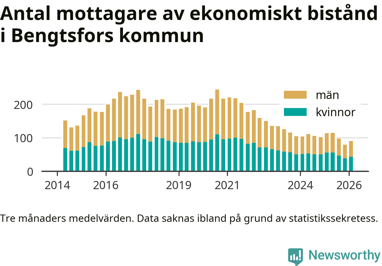 En majoritet av biståndstagarna var män: I genomsnitt 47 män och 43 kvinnor fick ekonomiskt bistånd varje månad under vintern.